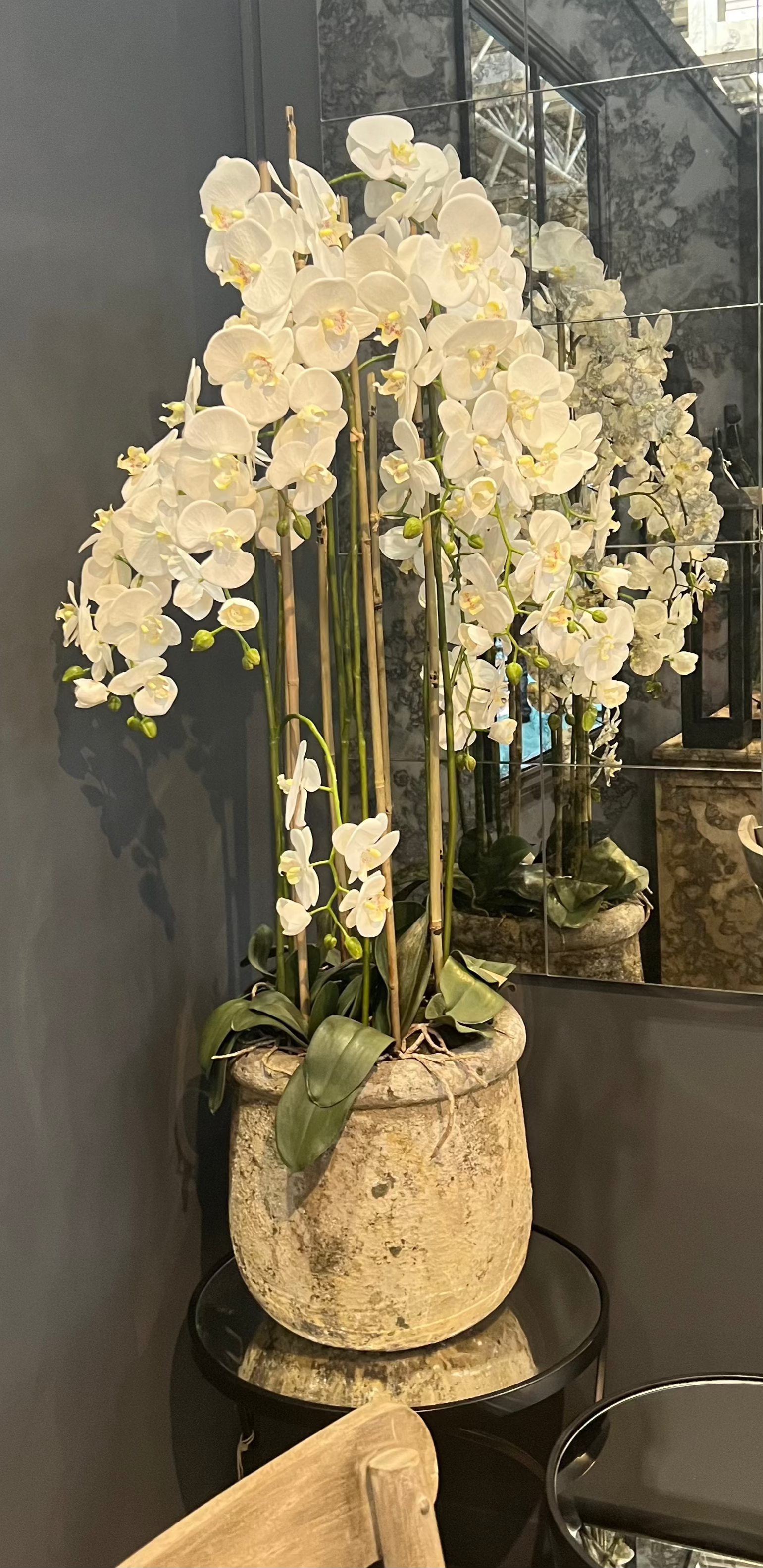 Introducing the Ashbury Large White Orchid in Antique Stone Pot, a botanical masterpiece. Excellence in botanical accuracy, this orchid captivates with its meticulous attention to detail. Abundant blooms, delicate buds, visible root network, and lifelike leaves set it apart. The distressed stone pot and supporting canes enhance its realism and premium quality finish. Elevate any space with this exquisite floral focal point?a testament to refined elegance.