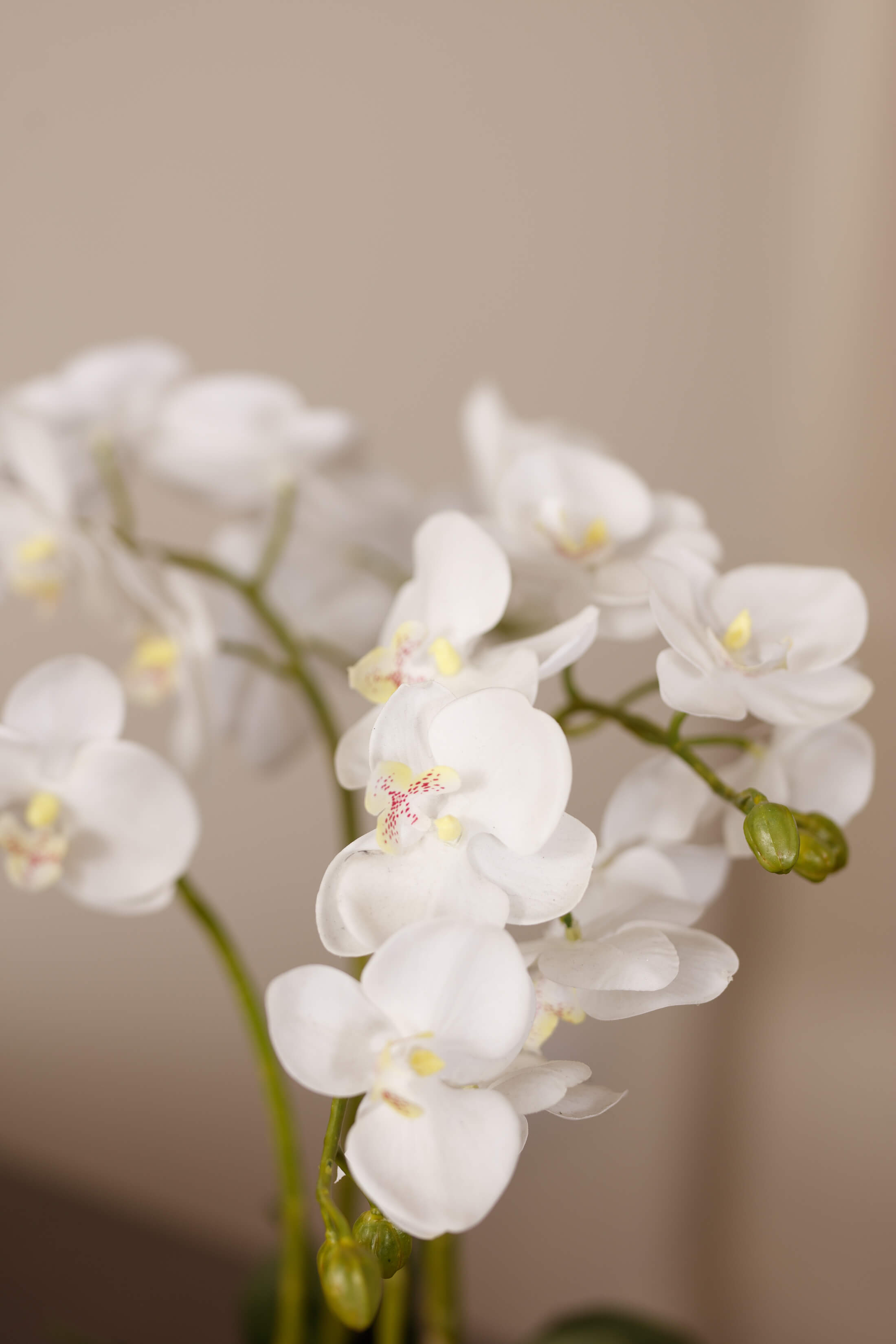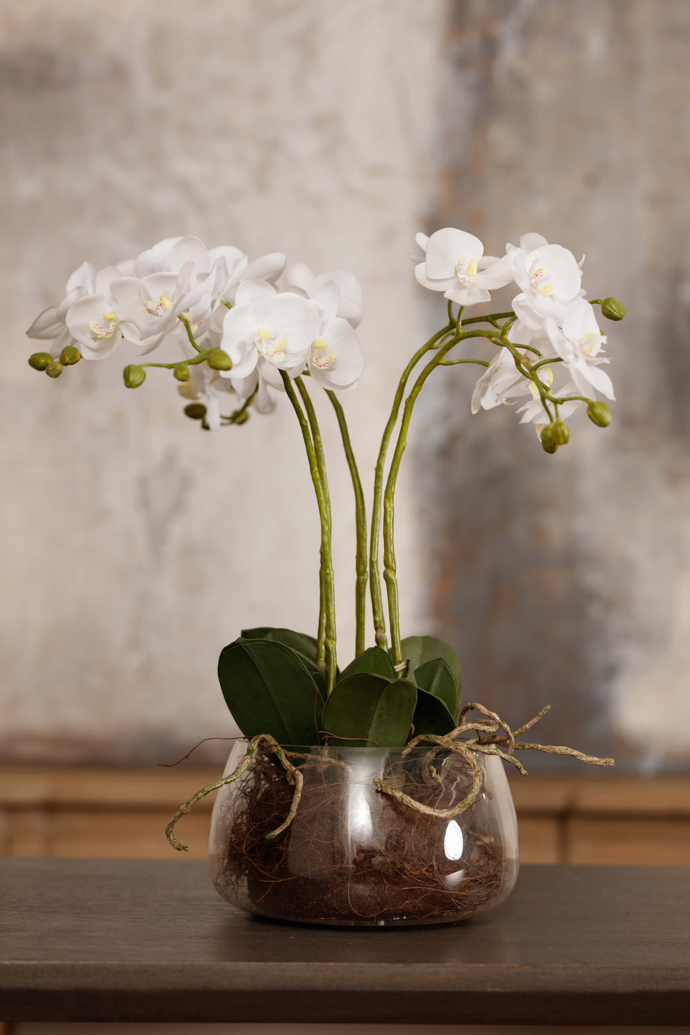 Introducing the Austen White Orchid in Glass Pot, a sophisticated masterpiece that infuses your living space with serenity and timeless elegance. This meticulously crafted faux orchid sets a new standard for botanical accuracy. From the lifelike root network cascading from the rustic clear glass vessel to the delicate balance of open blooms and closed buds, every detail has been meticulously considered. Whether gracing a dining table or serving as a captivating kitchen island centerpiece, this exquisite faux plant epitomizes refined beauty.