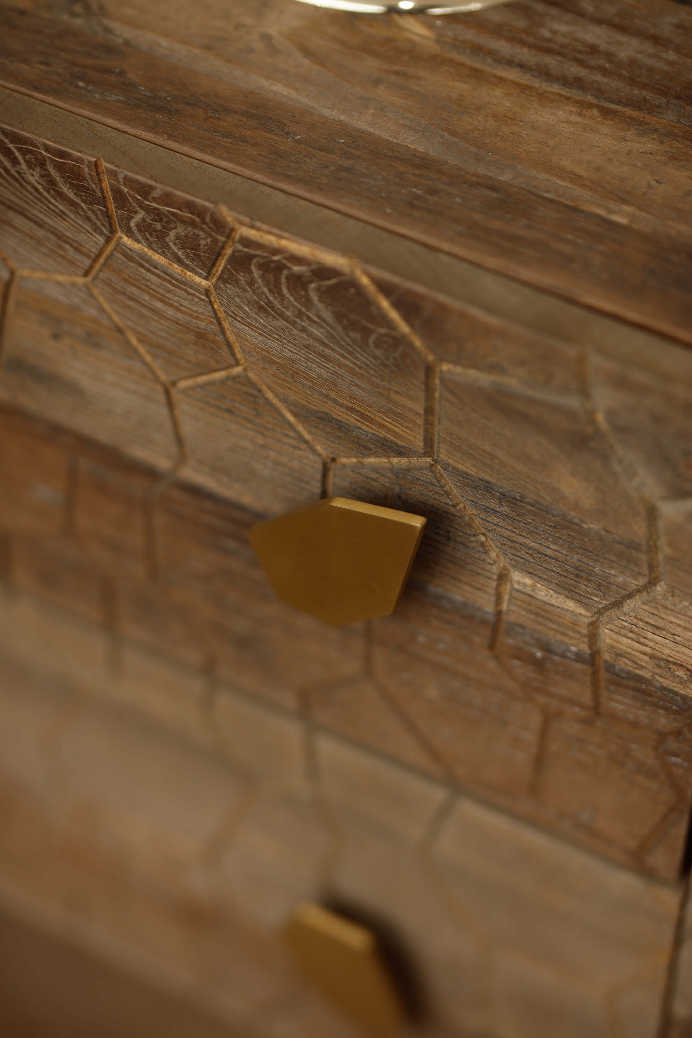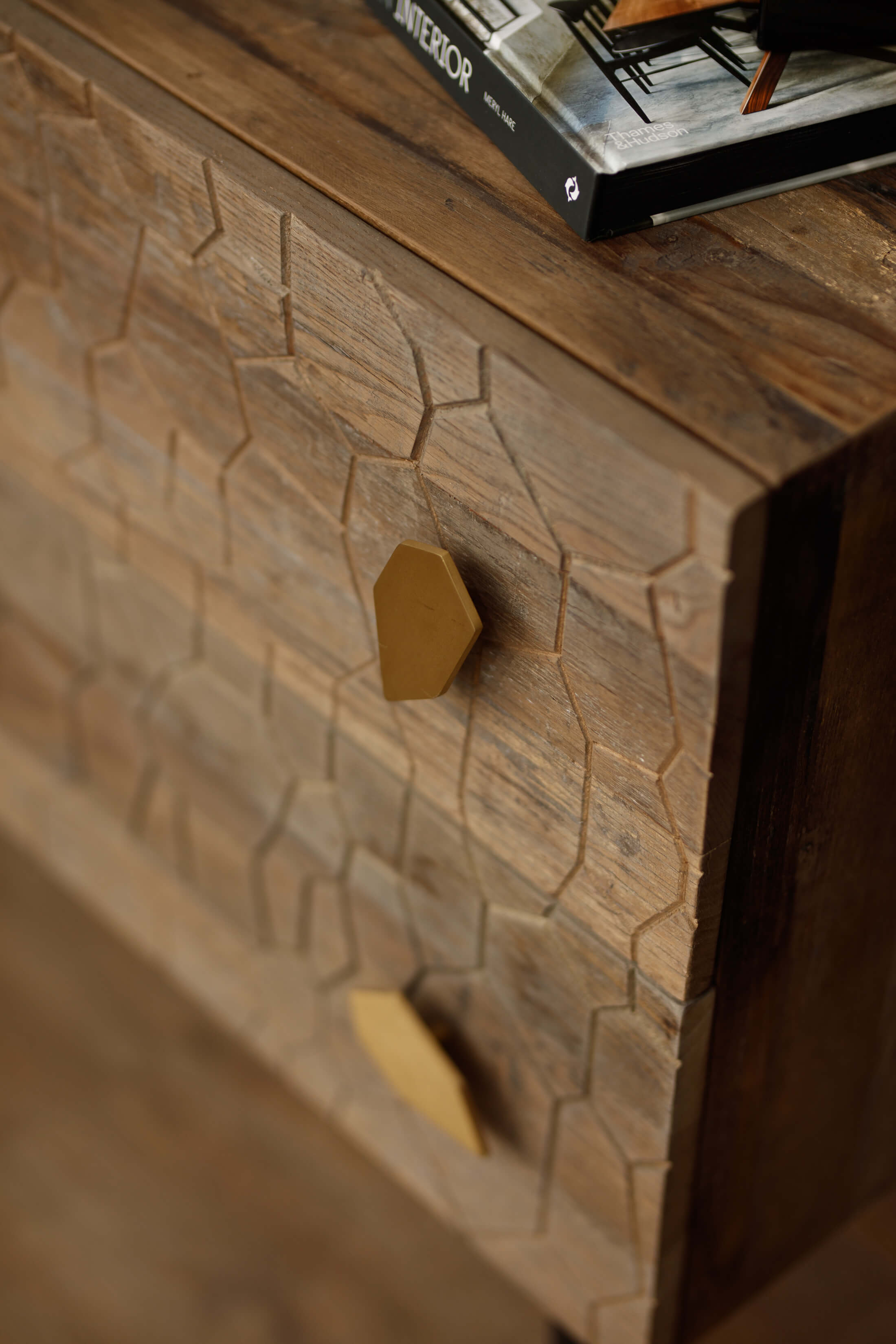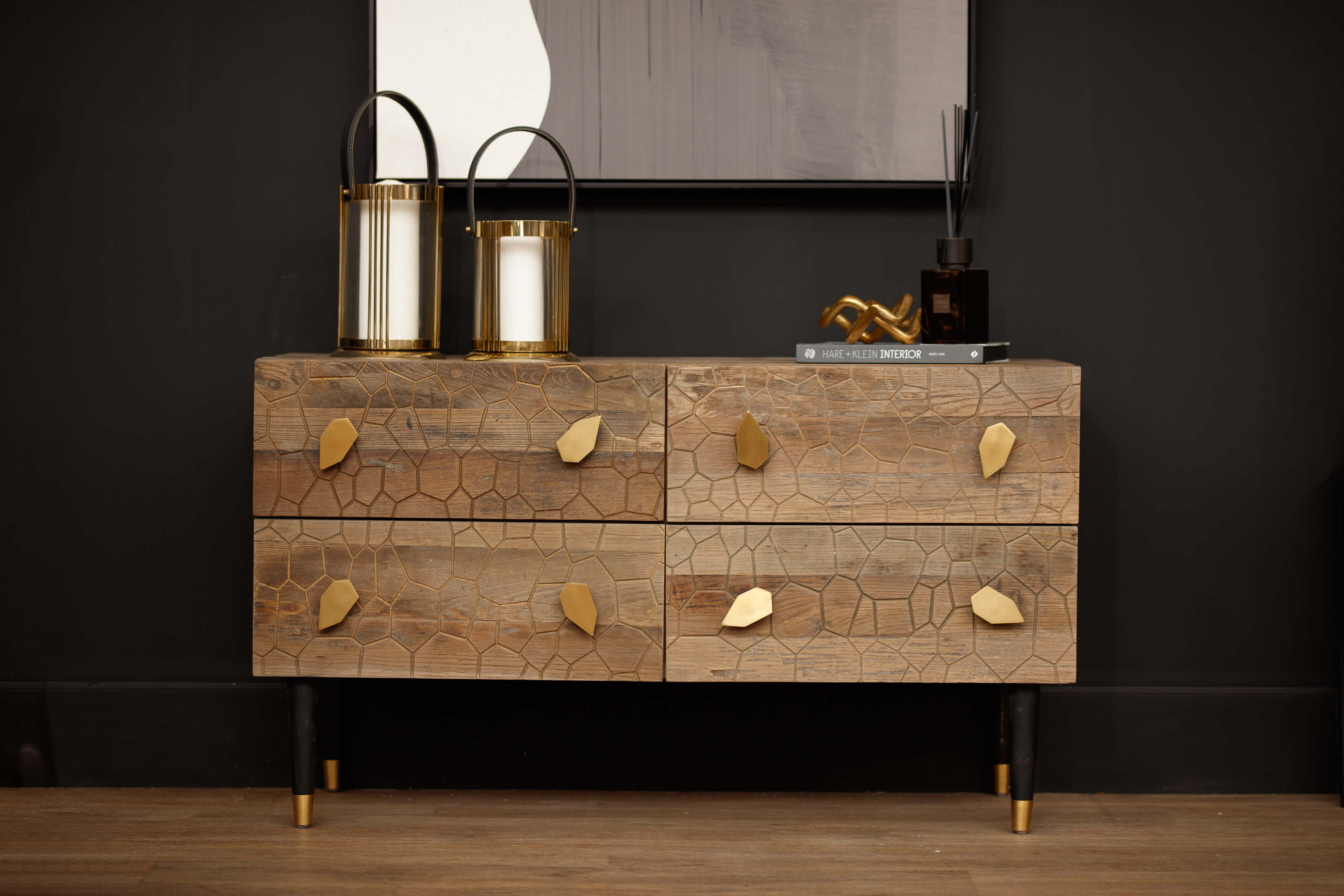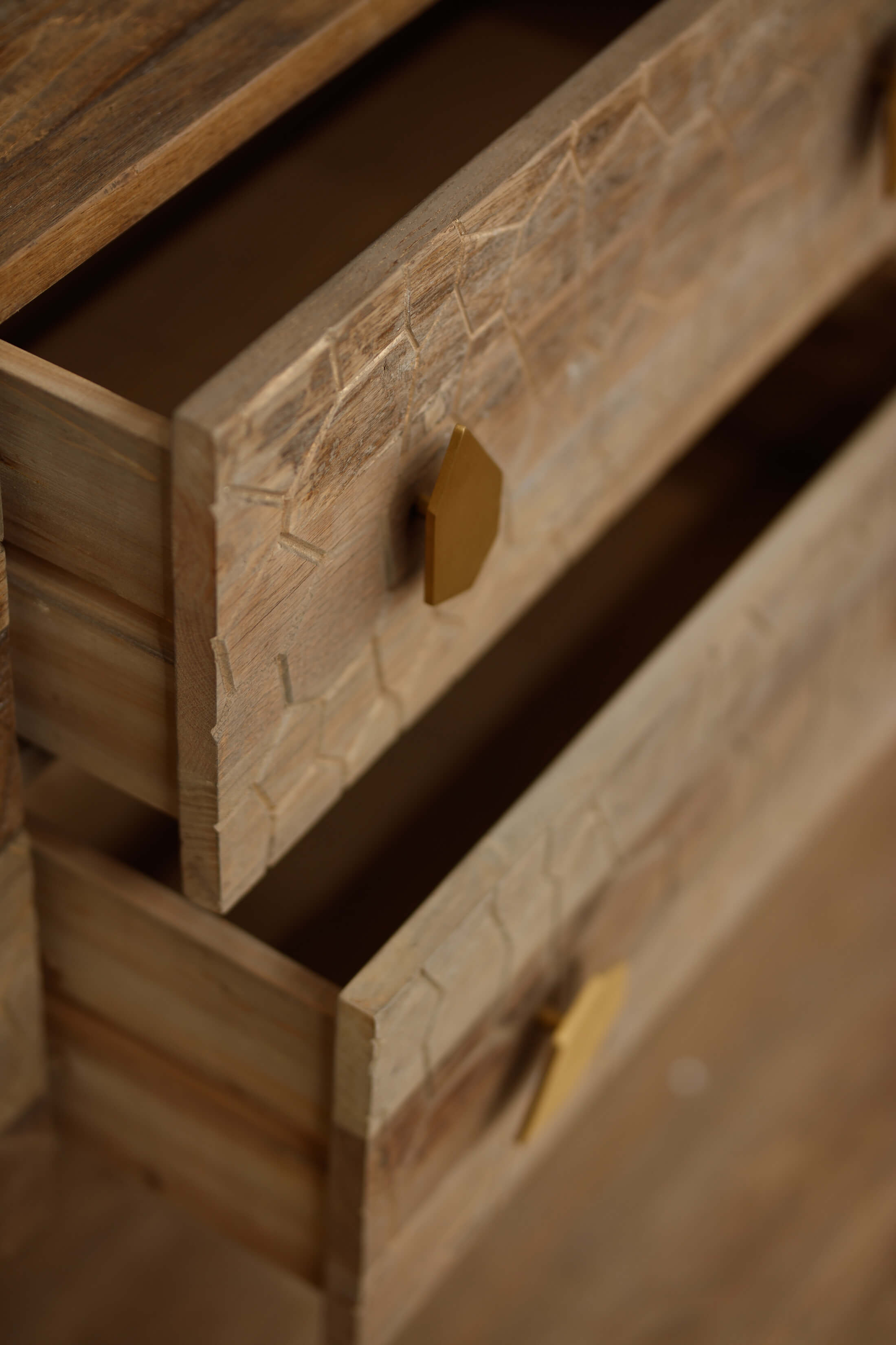 Introducing our Jude handcrafted elm wood chest of drawers, designed to offer ample storage and shelving space. This exquisite piece features four spacious drawers, perfect for organizing your essentials. The black-finish wooden legs provide a striking contrast to the natural tones of the understated top, making it an ideal addition to any rural-inspired home. Experience the perfect blend of rustic charm and modern elegance with our beautifully crafted chest of drawers.
