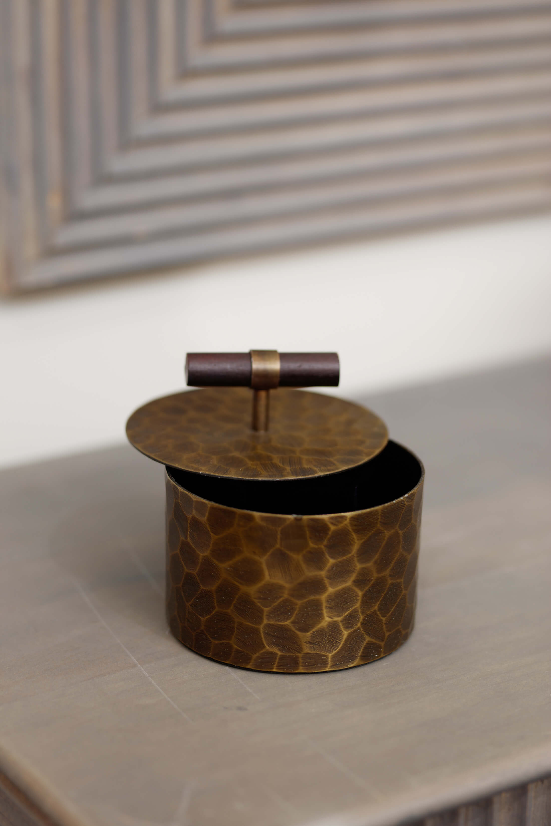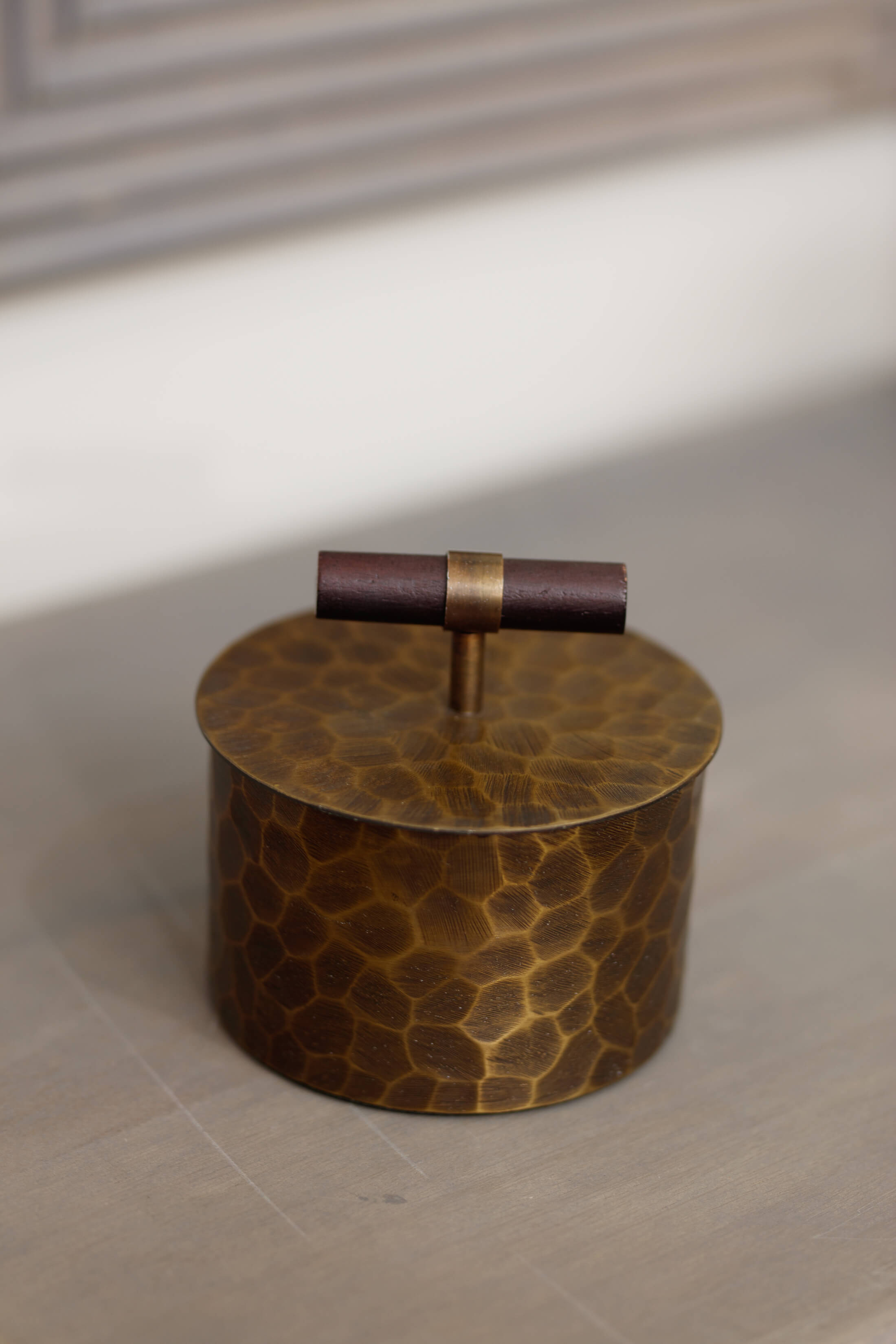 Introducing our Sula Small Trinket Box with Handle a luxurious addition to any space. This elegant piece boasts an antique gold finish, intricately hand-hammered patterns for a rich, deep texture, and a distinctive T-shaped wooden handle. Perfect for adding a touch of sophistication to your home decor.