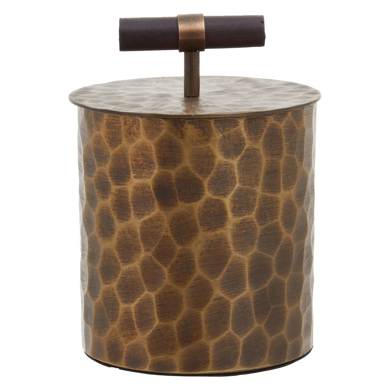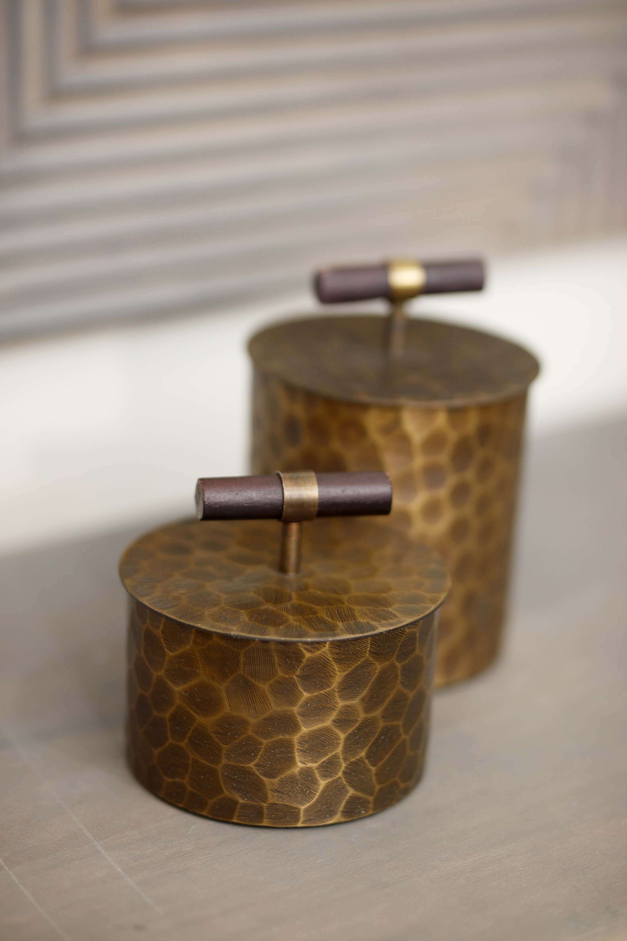 Introducing our Sula Trinket Box with Handle, a luxurious addition to any space. This elegant piece boasts an antique gold finish, intricately hand-hammered patterns for a rich, deep texture, and a distinctive T-shaped wooden handle. Perfect for adding a touch of sophistication to your home decor.