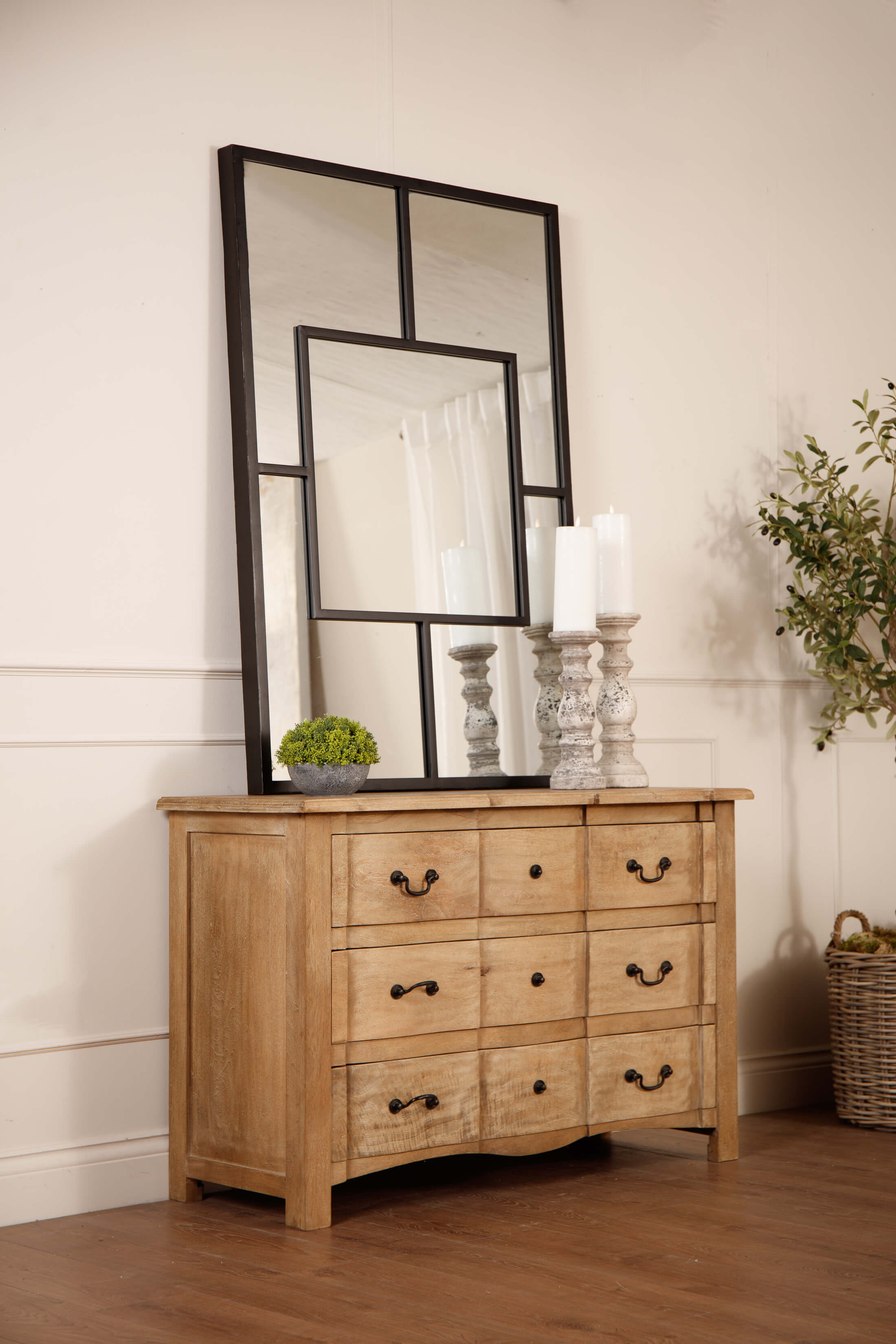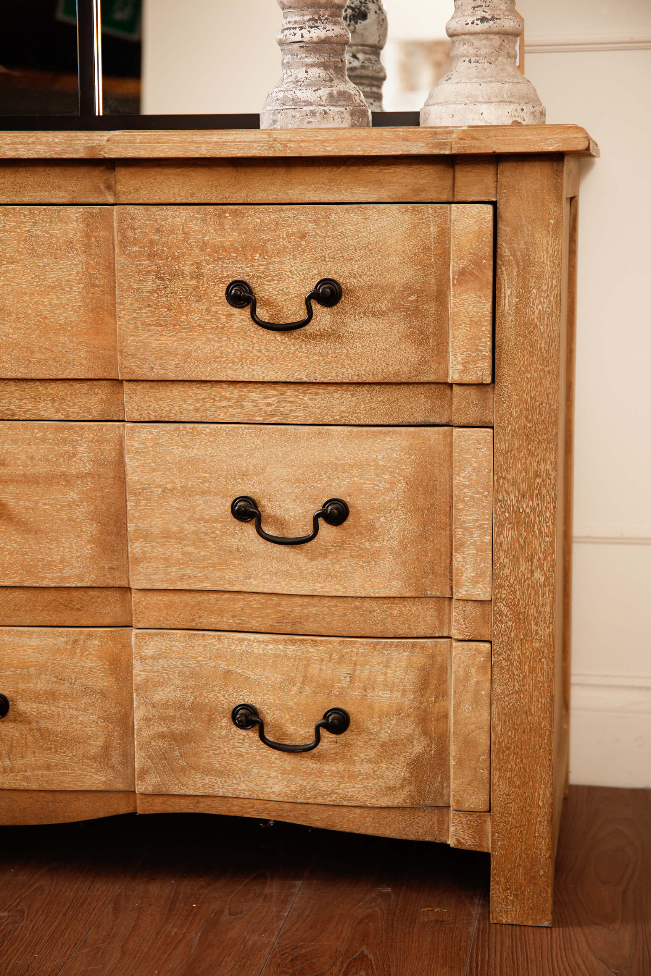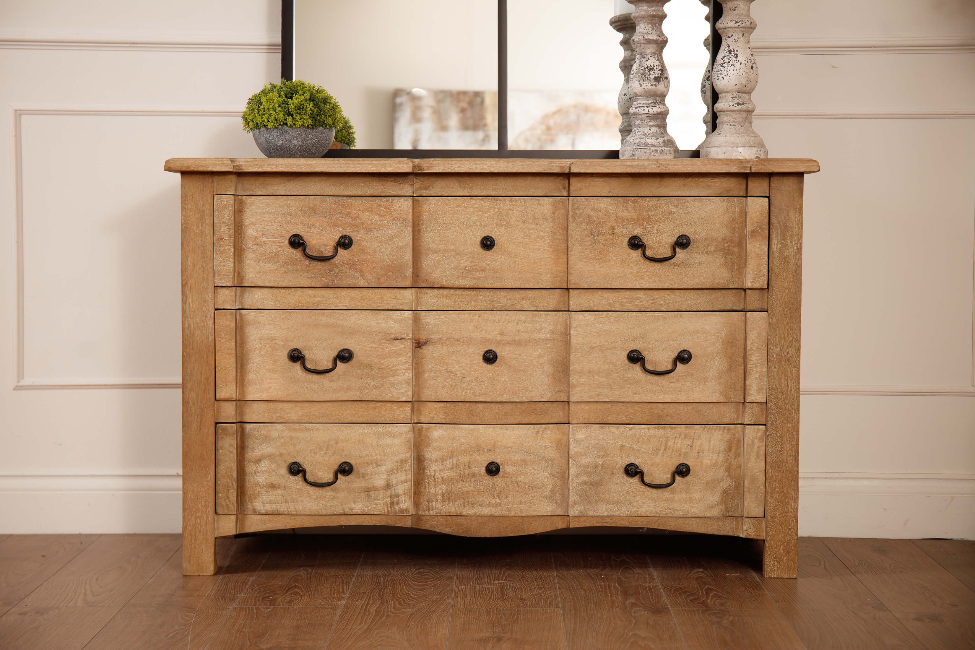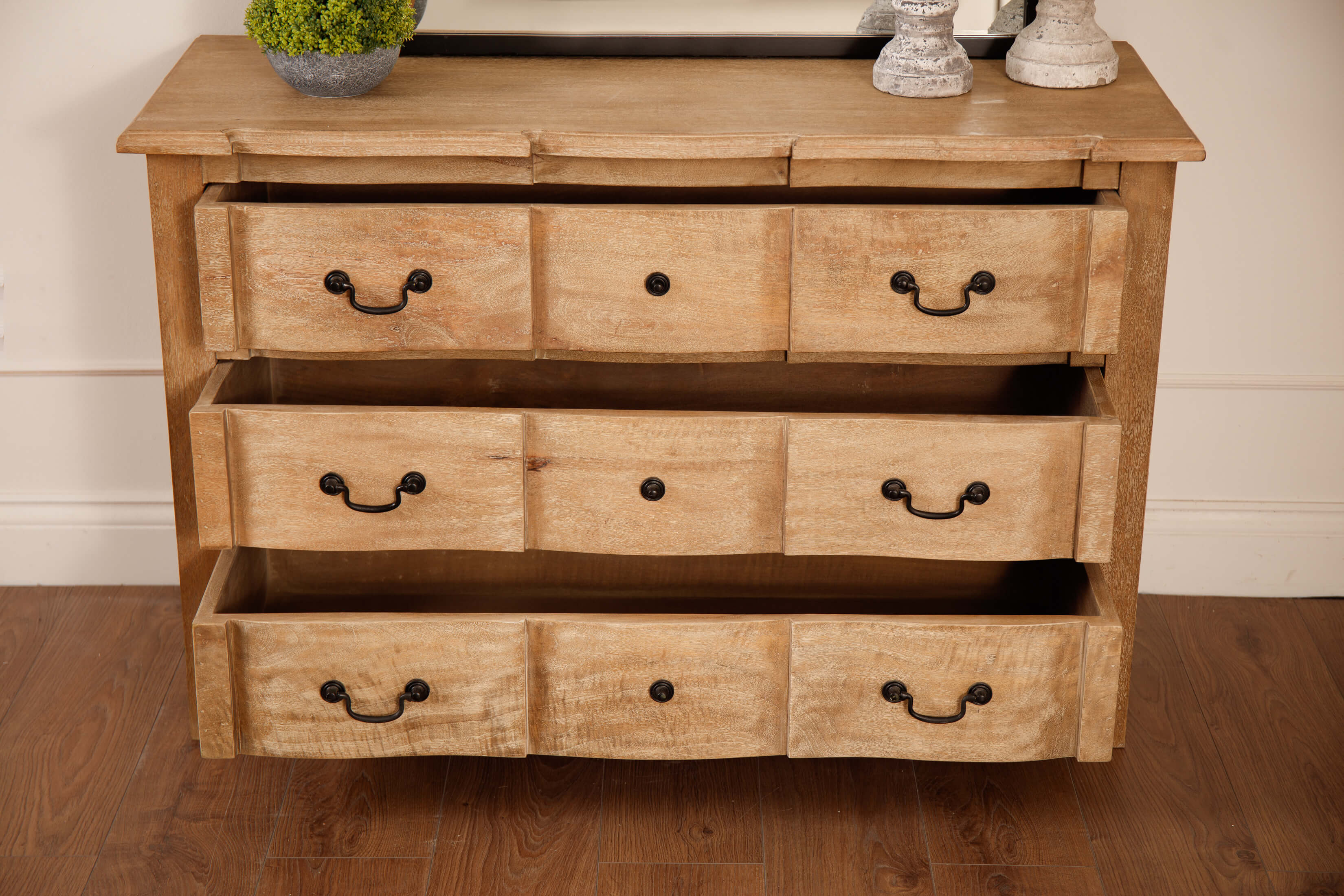 Introducing the Witley Collection 3 Drawer Chest: Crafted from hand-selected hardwood, this exquisite chest features three spacious, full-width drawers. Its elegant design seamlessly combines French-style sophistication with contemporary flair. The washed, bleached wood finish and black ironwork handles create a harmonious blend, allowing it to complement any evolving home decor.