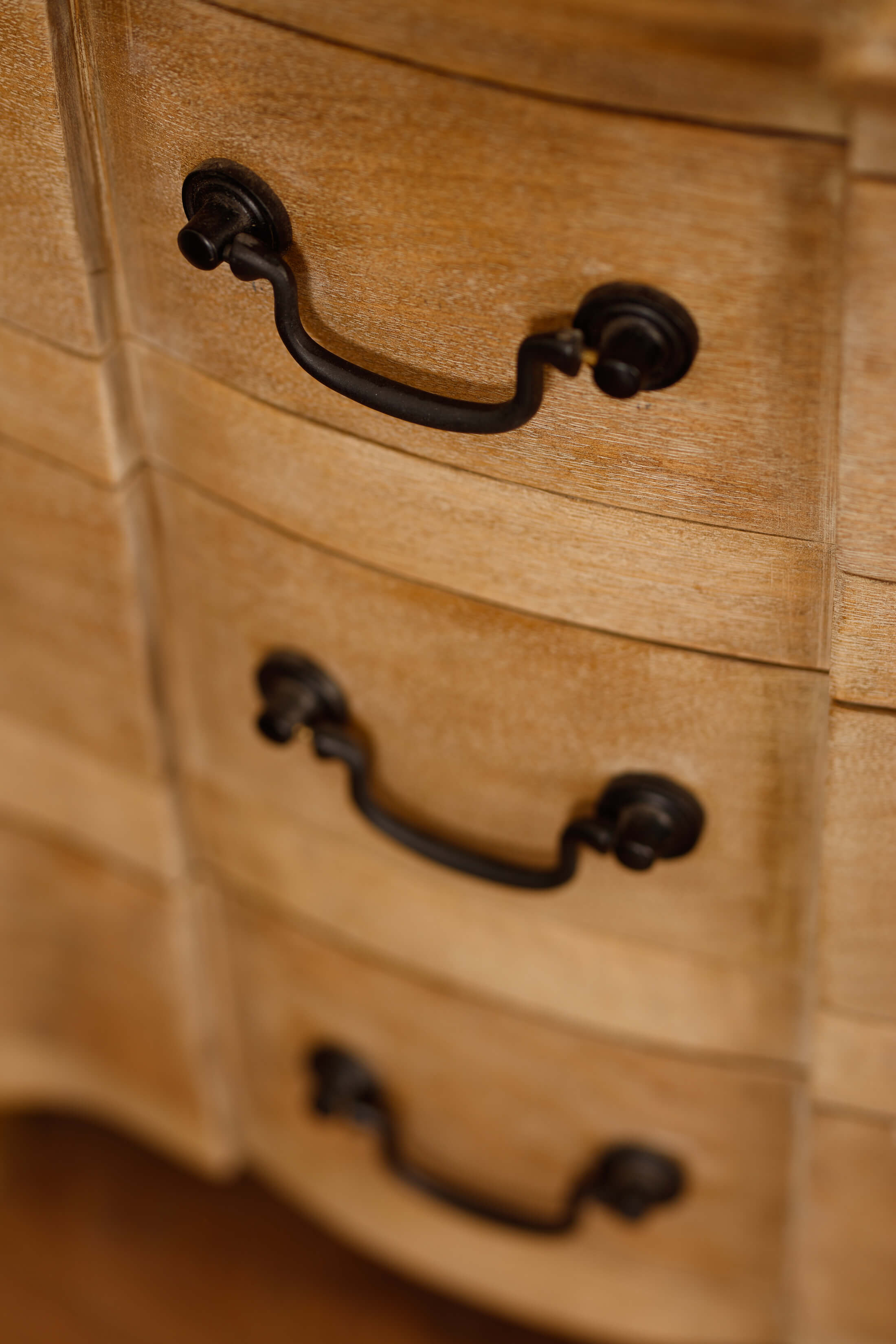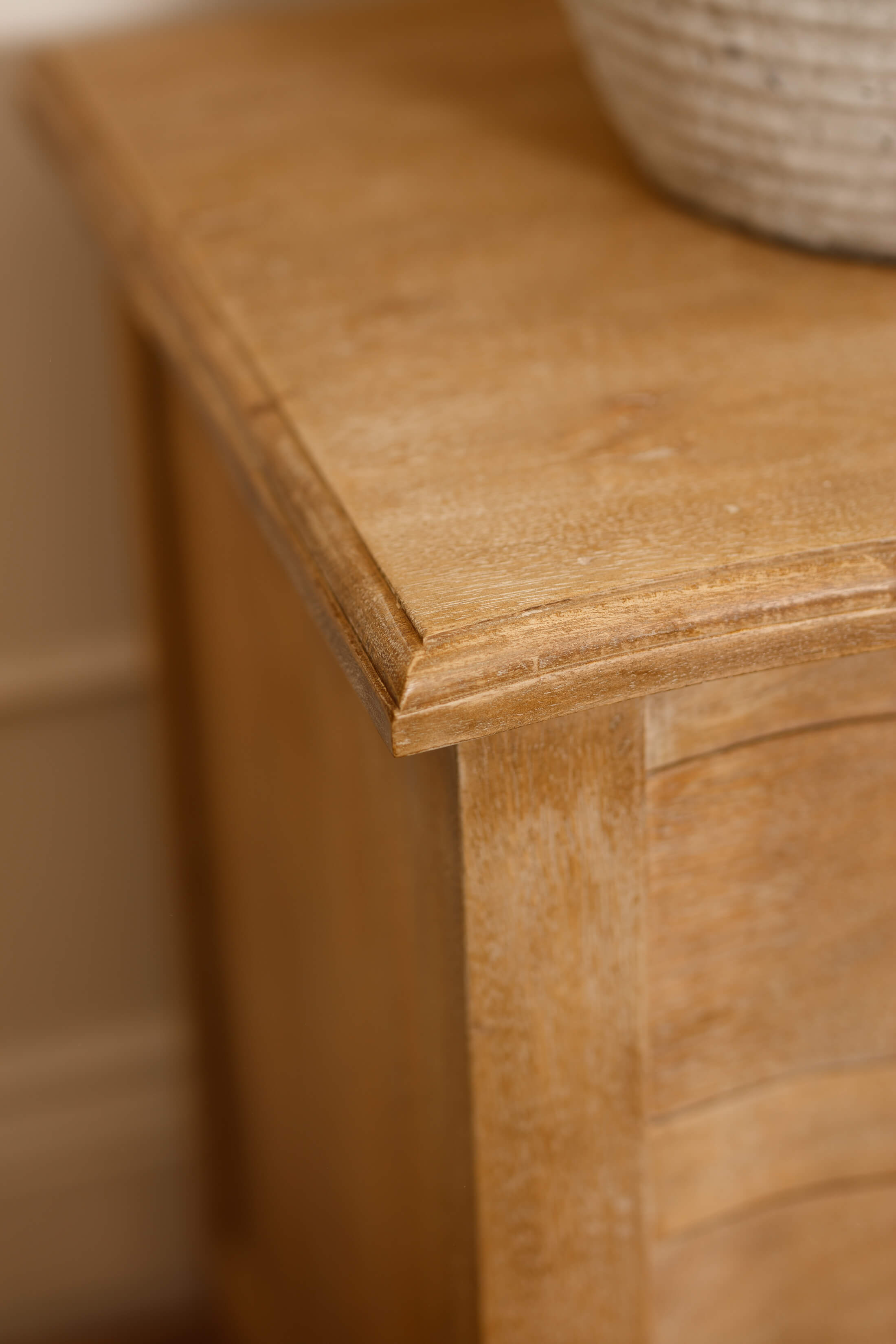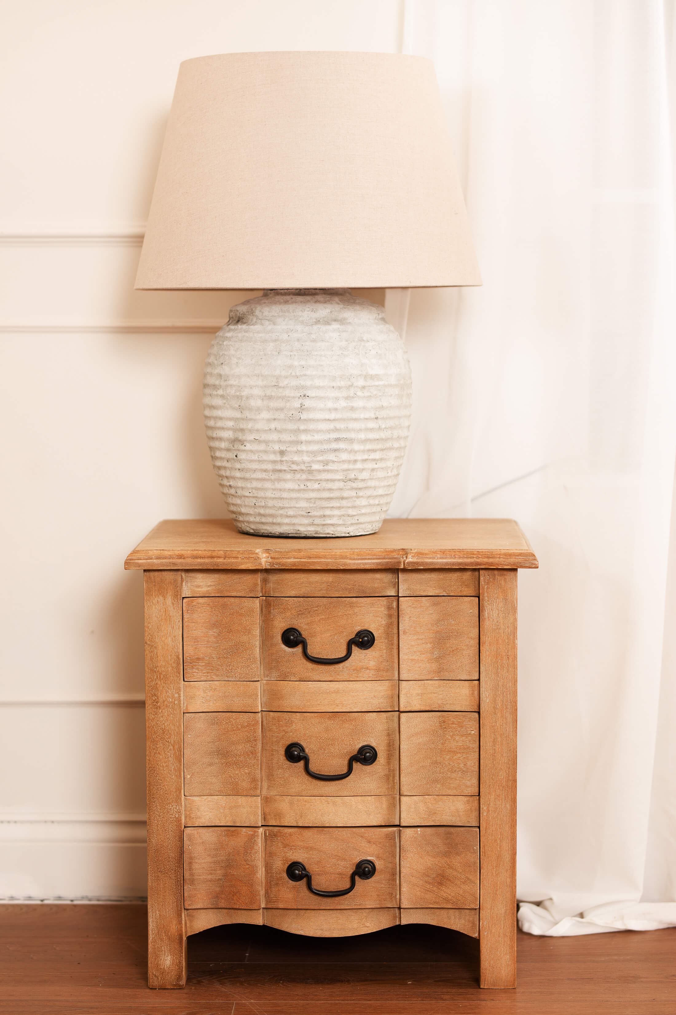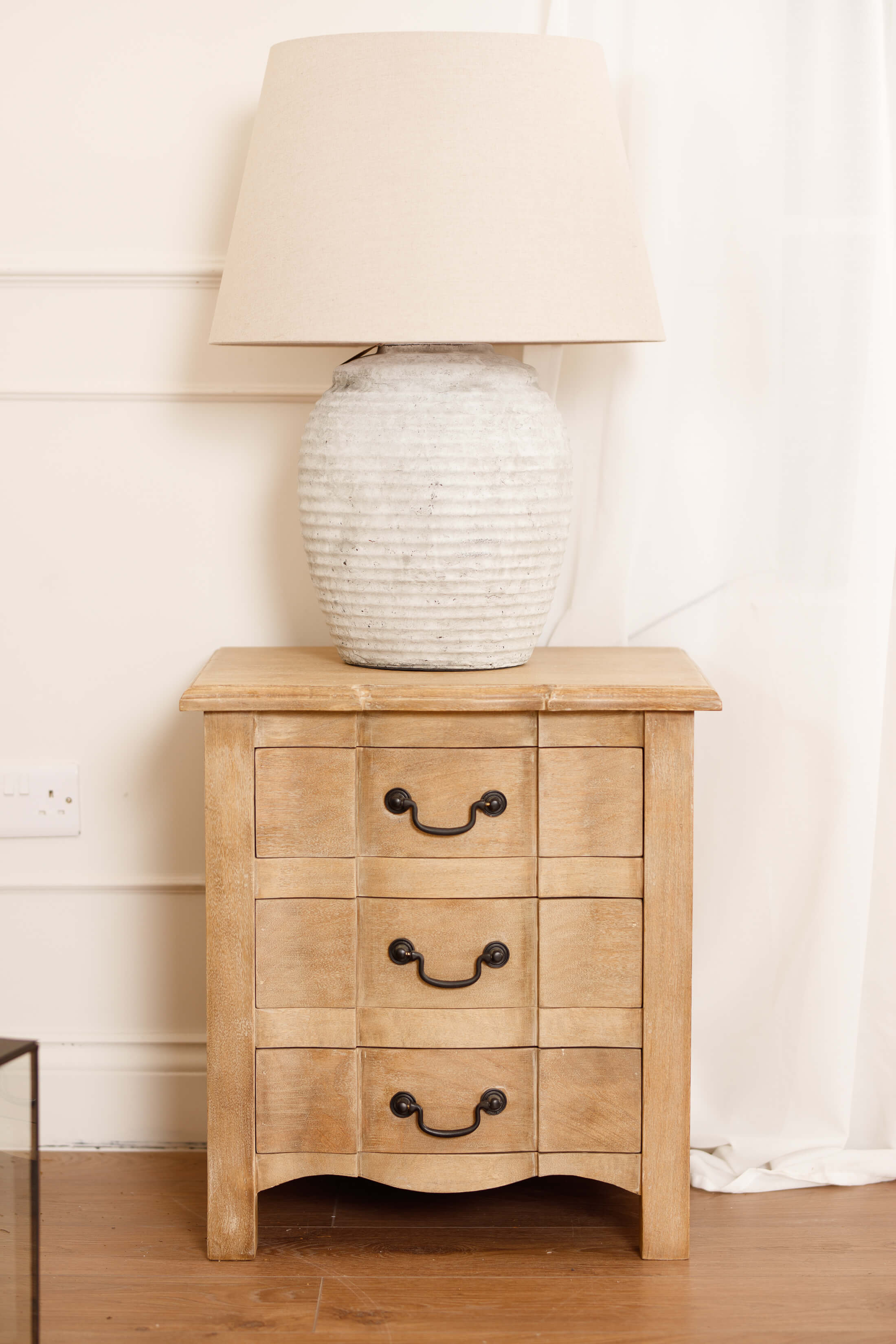 Introducing the Witley Collection 3 Drawer Side Table: Meticulously handcrafted from select hardwood, this exquisite side table features a spacious full-width drawers. The washed, bleached wood finish and black ironwork handles evoke timeless French elegance with a contemporary twist. Each piece is uniquely shaped and individually crafted, ensuring enduring quality.