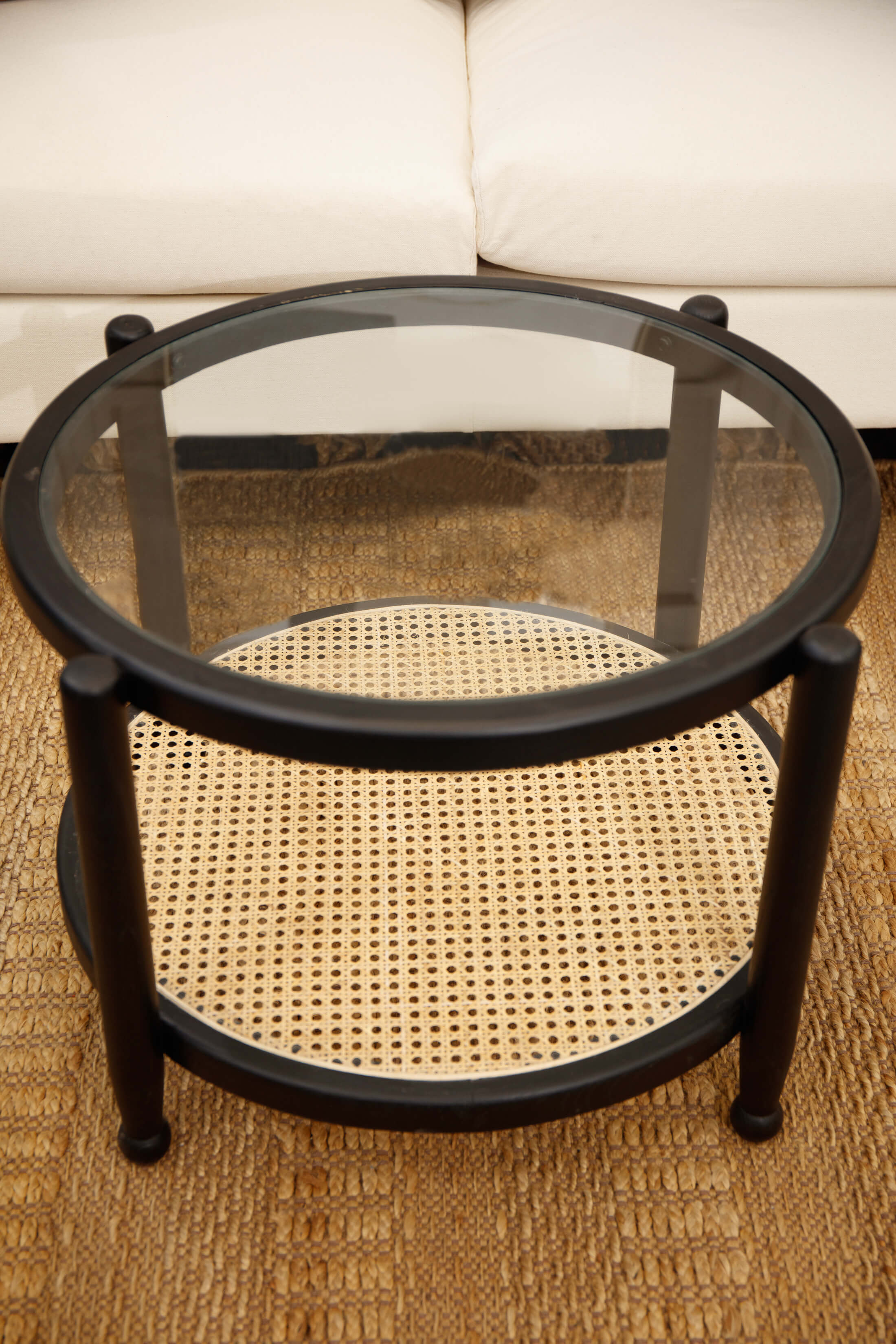 Introducing our Selby coffee table, crafted from premium elm wood. This luxurious piece embodies rustic charm with its black-finished frame, featuring clean lines and rounded corners. A clear glass top elegantly rests on the frame, while the lower shelf showcases a natural look with its open weave cane design. Elevate your living space with this sophisticated and stylish addition.