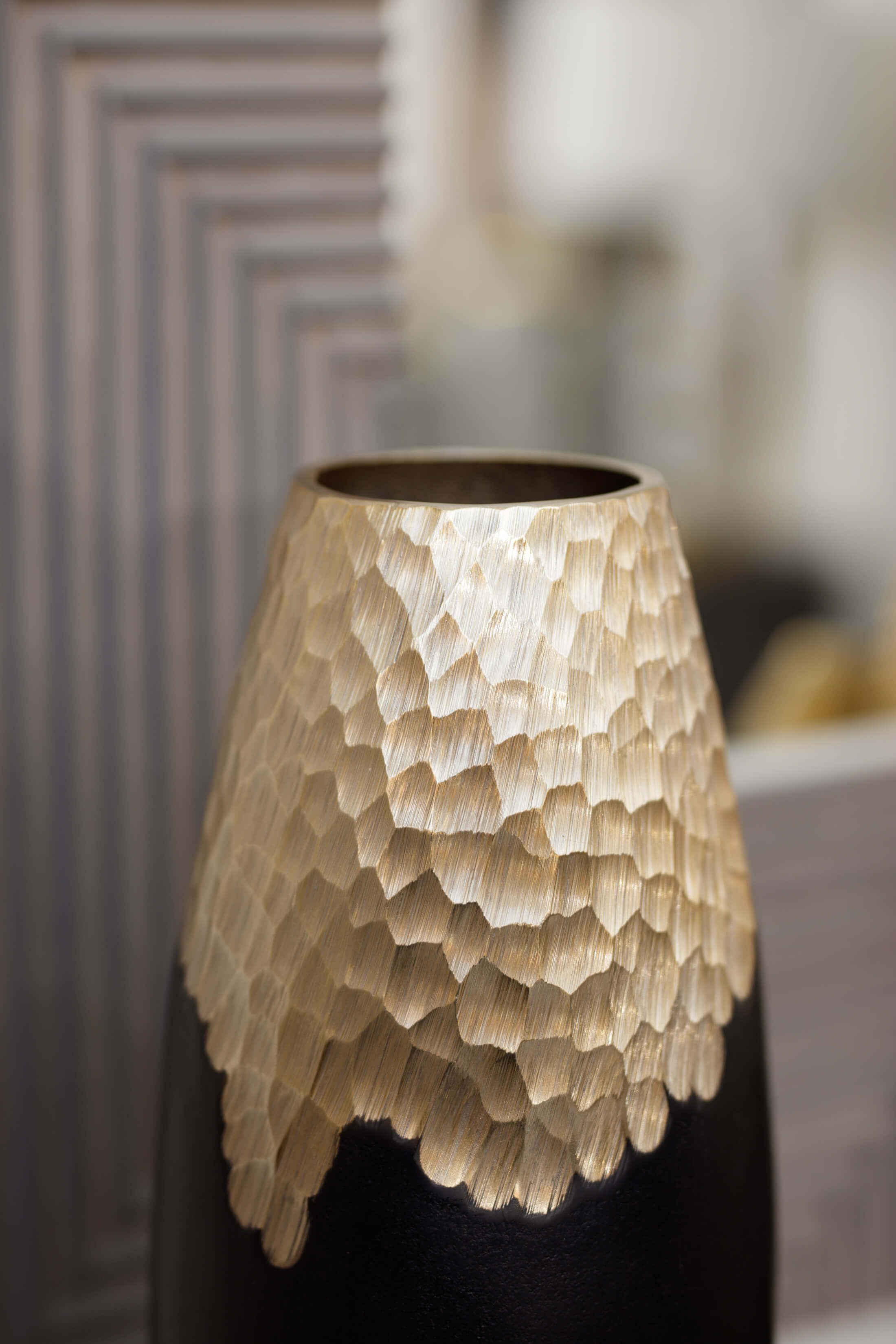 Introducing our luxurious Nova Large Vase, expertly hand-cast from the finest aluminium. This elegant piece showcases a sophisticated matte black finish, beautifully contrasted by a striking gold dimpled design, making it an eye-catching addition to any space. Whether used to display faux flowers or as a standalone statement piece, the Daito Vase adds a touch of opulence to your home decor.
