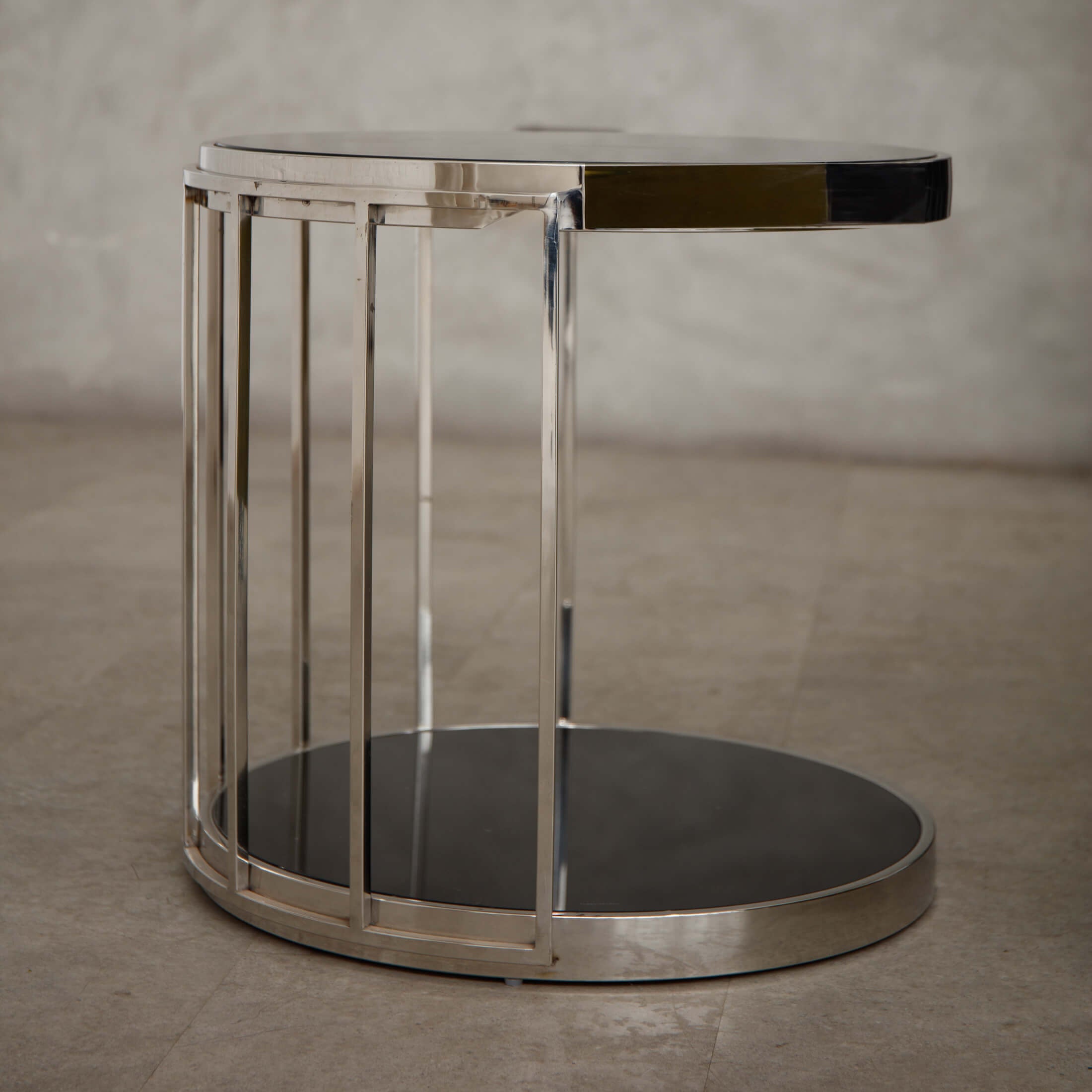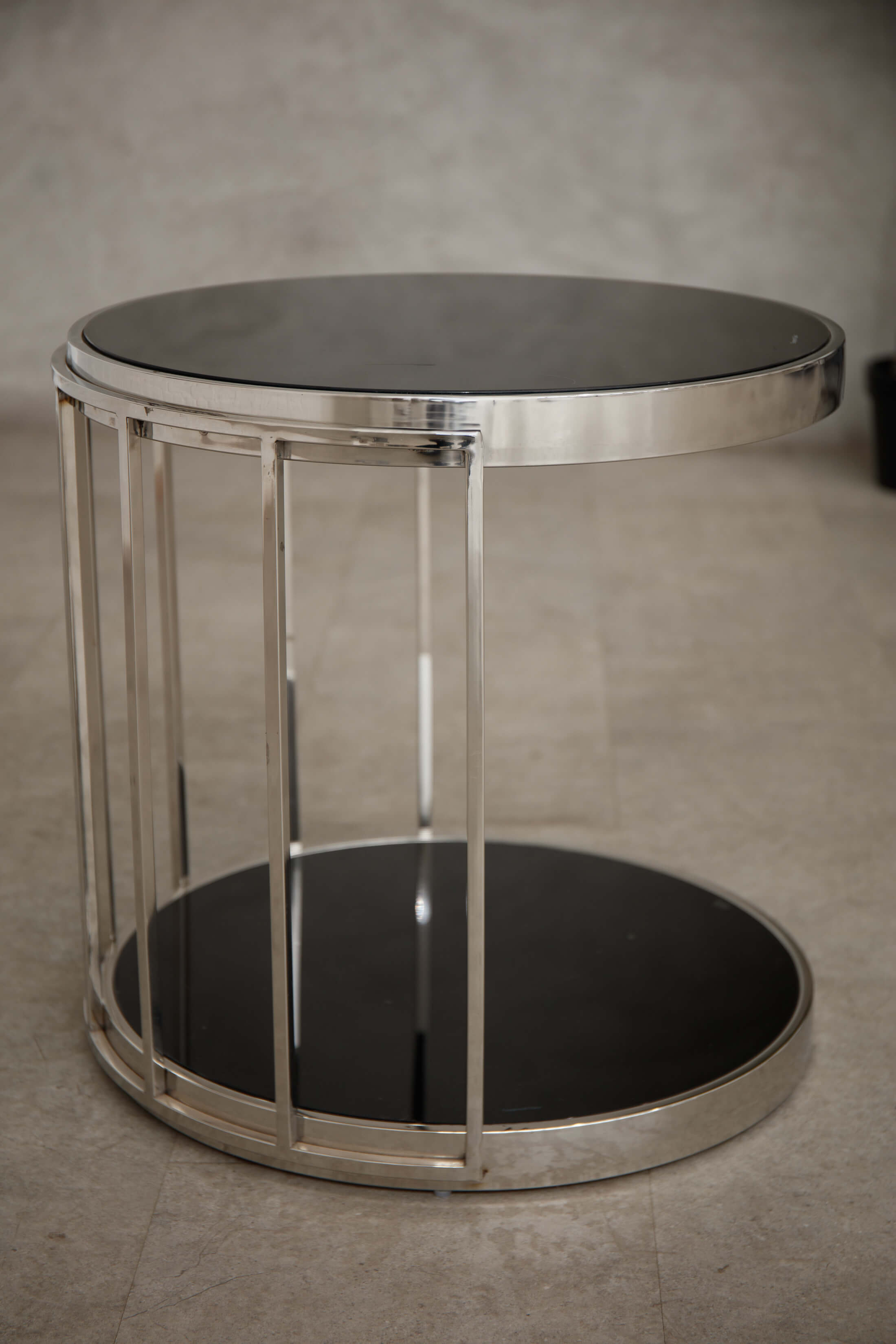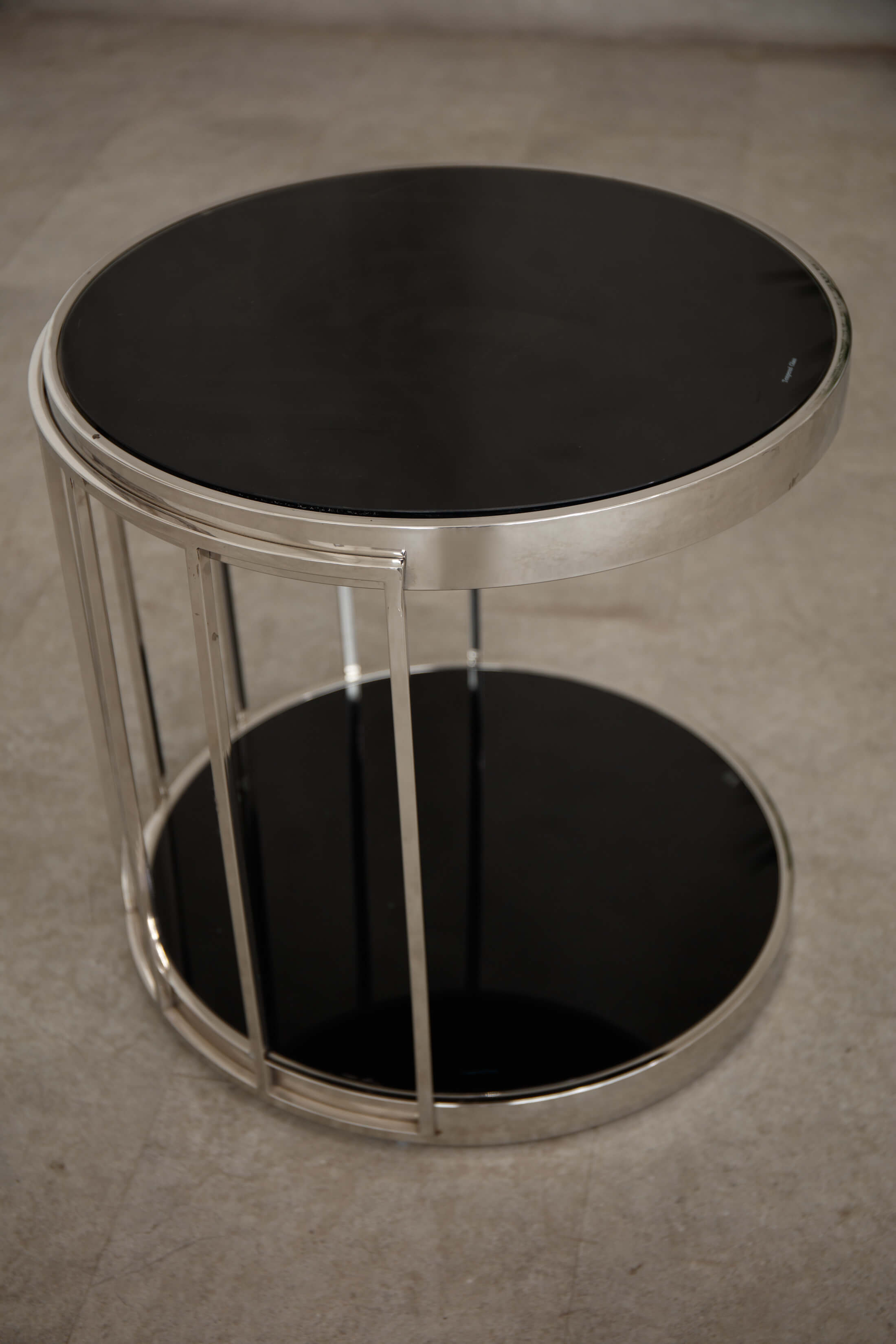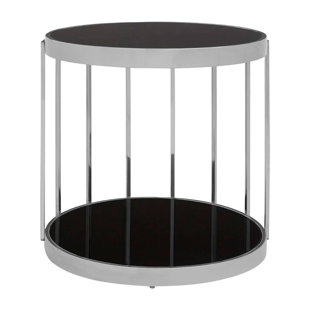 Introducing the Rusper Side Table , side table, meticulously crafted from smooth steel into a distinctive cage design with slender metal bars forming the frame. The round top and base, made from tempered glass with a sleek black finish, provide a striking contrast to the cool metallic structure. Enhance your space by styling it with chic metallic accessories for a coordinated and sophisticated look.