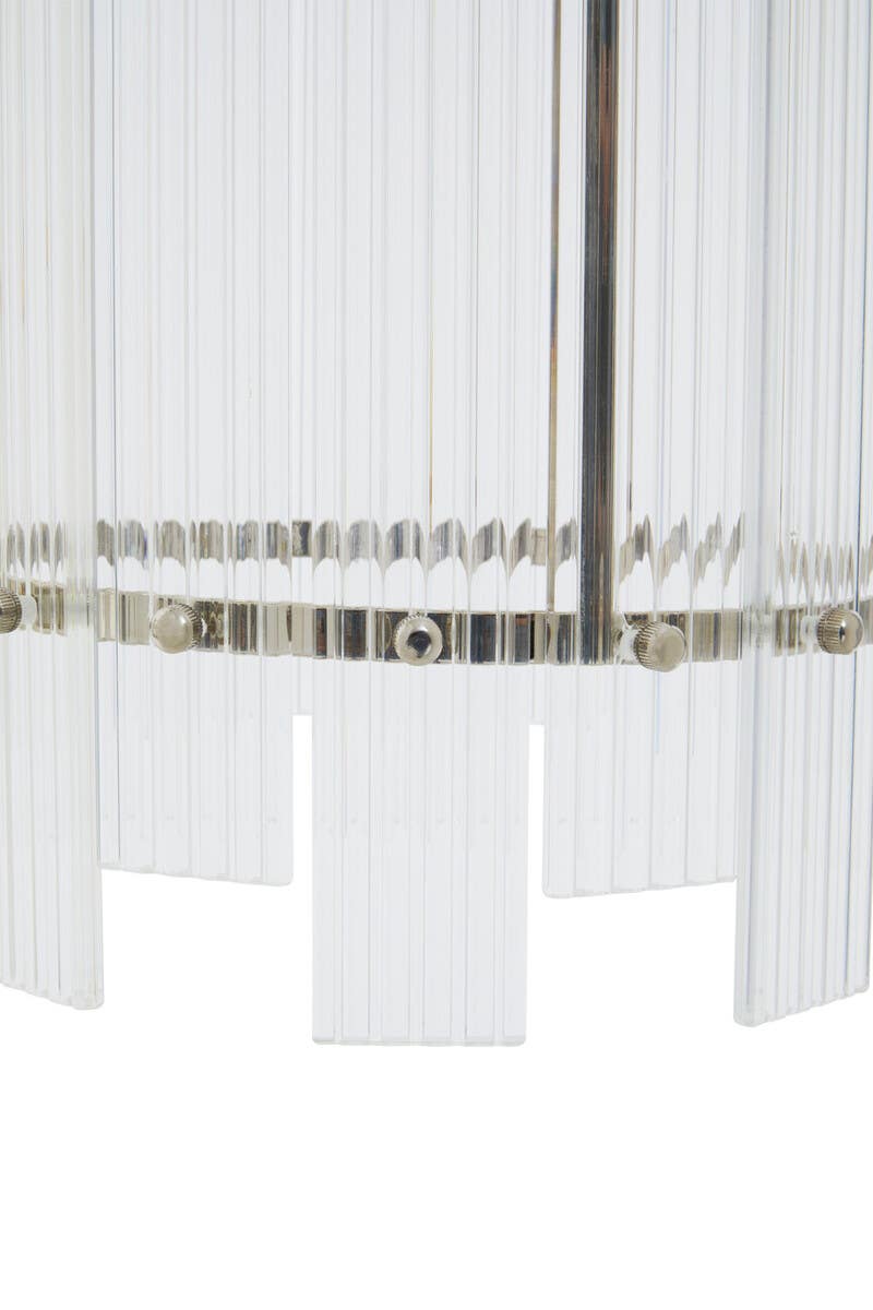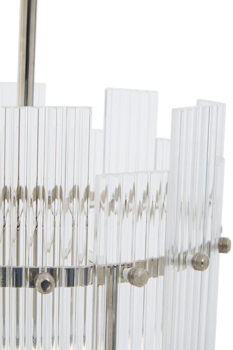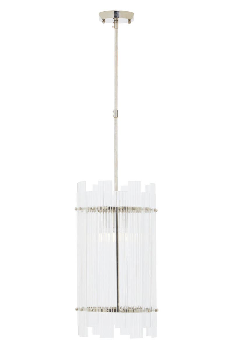 Introducing our Danby one bulb pendant light, a timeless accent piece that exudes chic character in any living space. Featuring a sleek metal frame with a sophisticated nickel finish, this elegant light is adorned with an array of fluted glass strips in a rectangular shape, creating a warm and inviting glow. Perfect for adding a touch of luxury to your home.