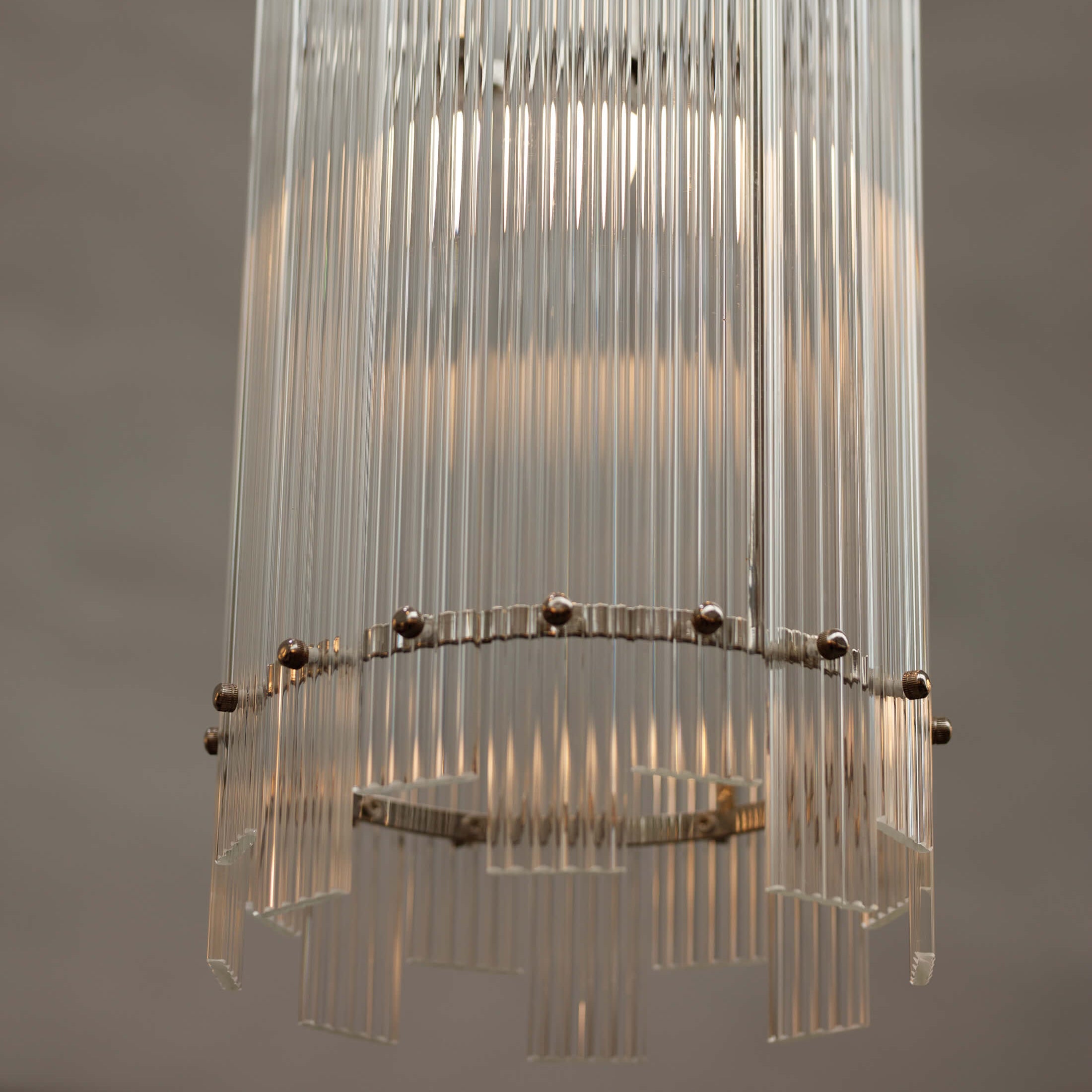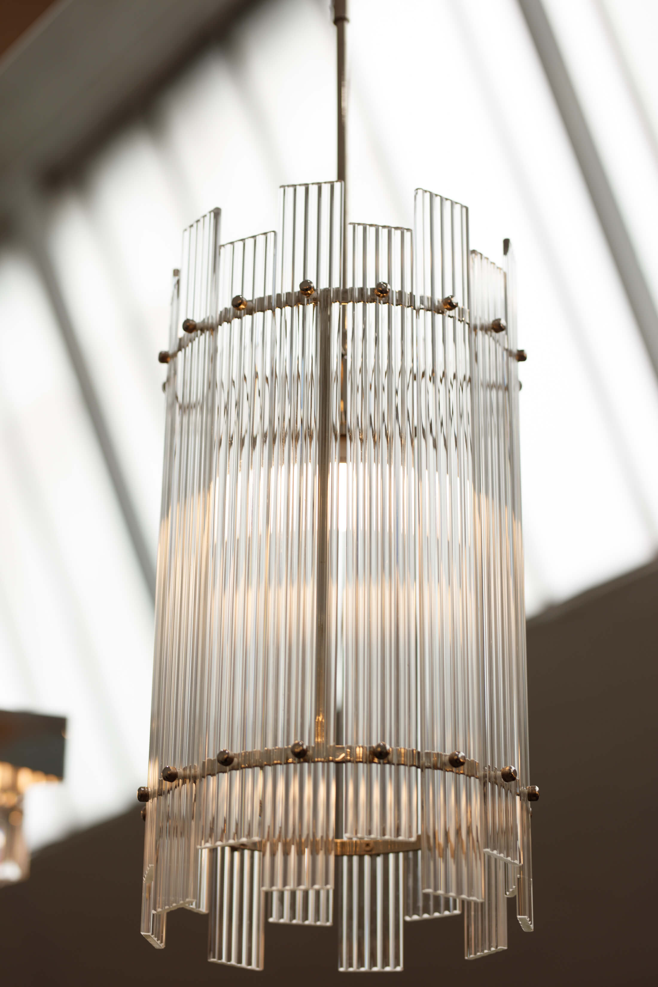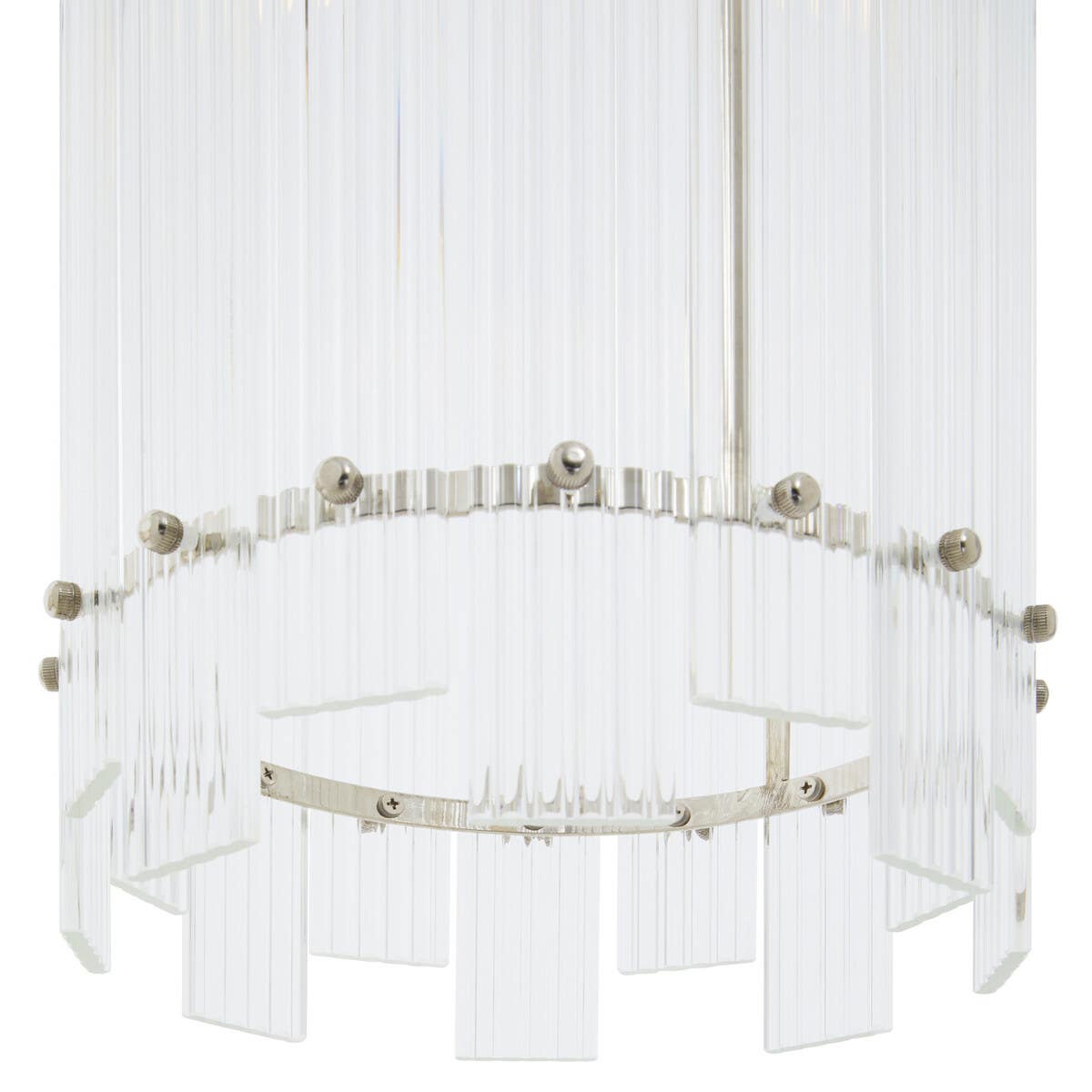 Introducing our Danby one bulb pendant light, a timeless accent piece that exudes chic character in any living space. Featuring a sleek metal frame with a sophisticated nickel finish, this elegant light is adorned with an array of fluted glass strips in a rectangular shape, creating a warm and inviting glow. Perfect for adding a touch of luxury to your home.