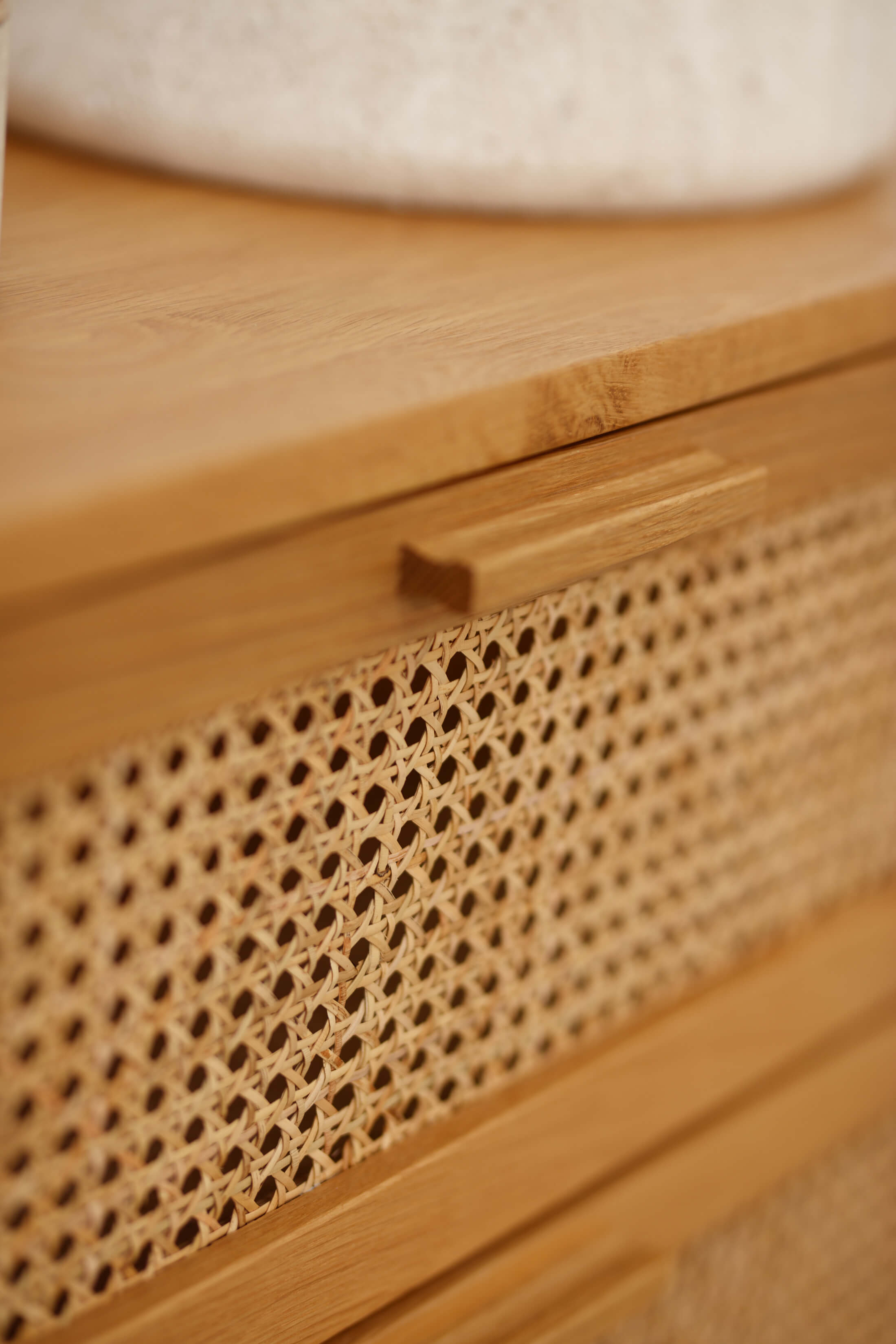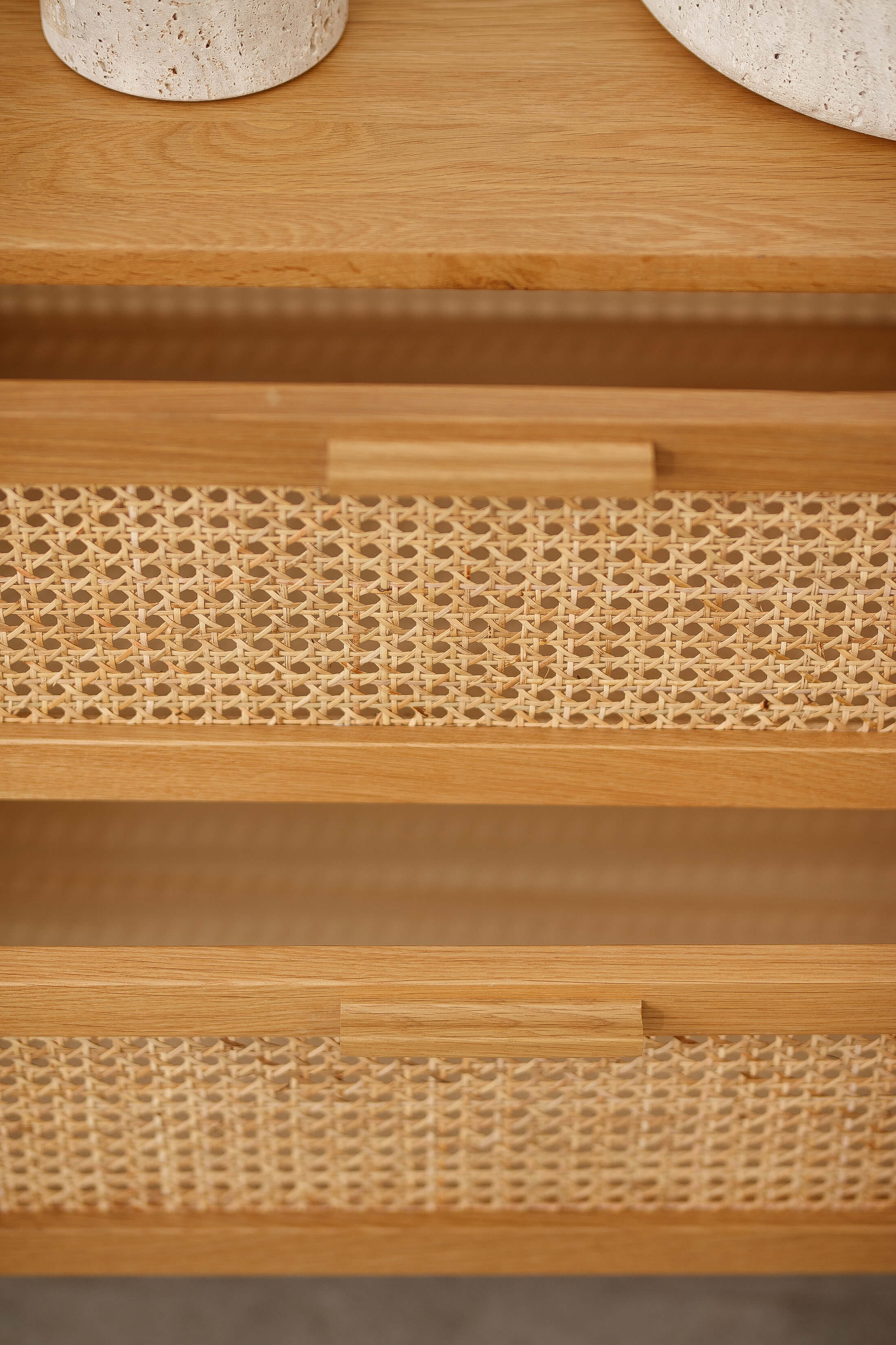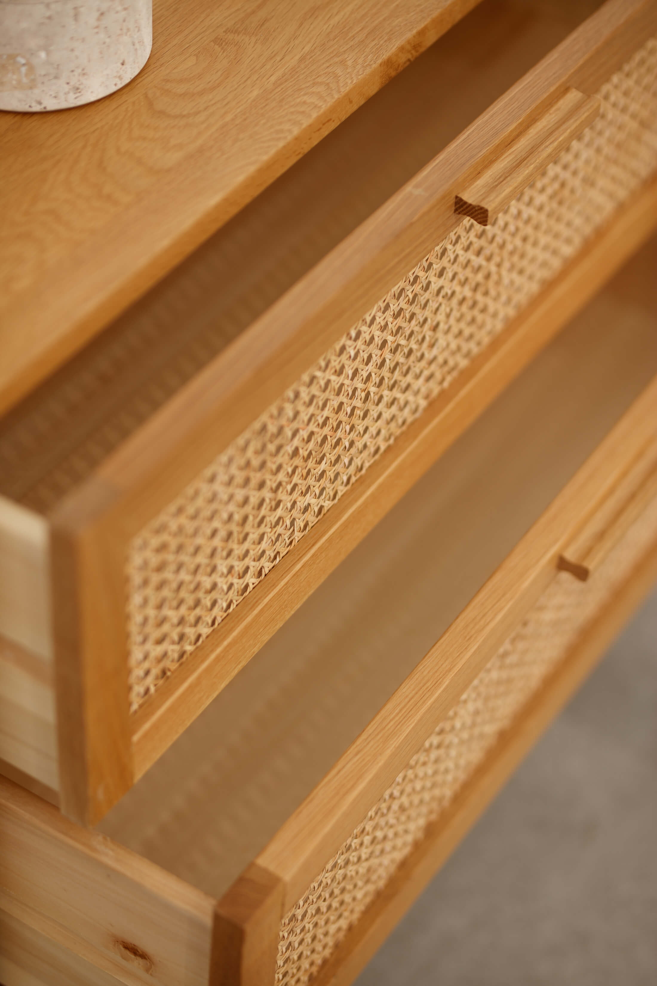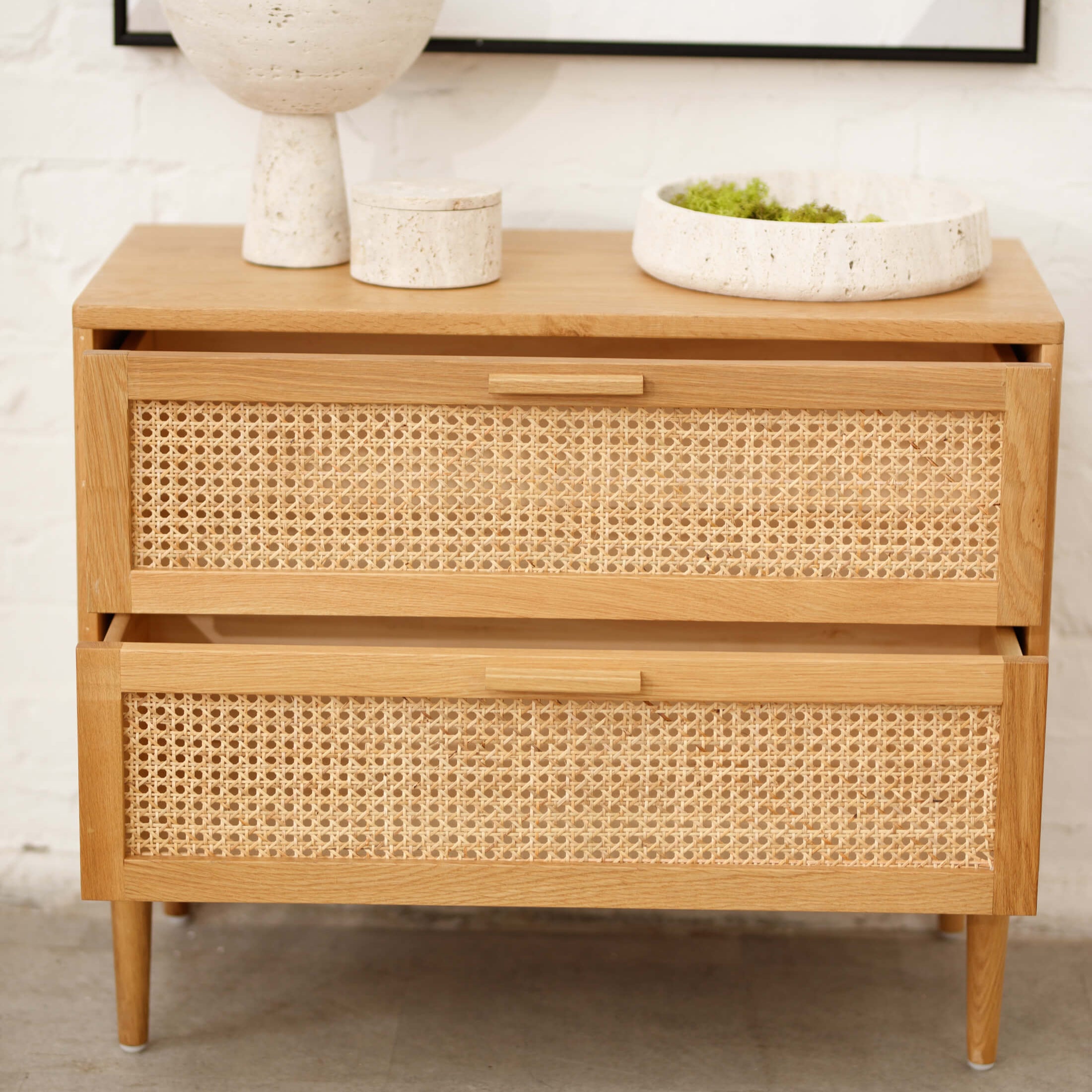 Introducing our Lowell chest, a perfect blend of mid-century modern style and versatile design. Ideal for boho chic, retro, and Scandinavian interiors, this piece features a clean structure with two drawers, each adorned with rattan fronts. Not only does it add a touch of sophistication to your space, but it also provides ample storage to keep your home organized in style. Elevate your decor with this luxurious and functional addition.