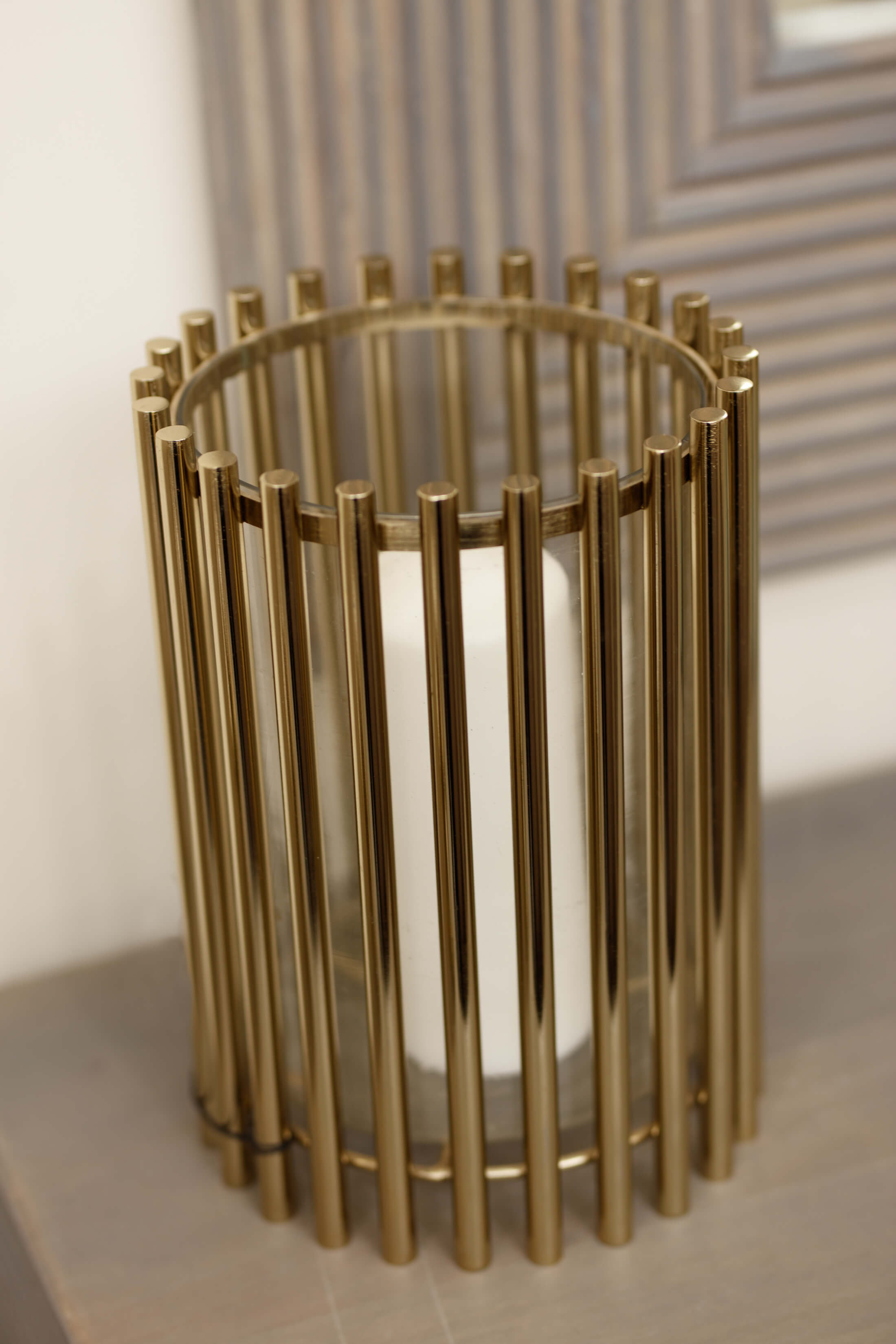 Introducing the Milland Medium Candle Holder, our exquisite medium sized candle holder, a contemporary masterpiece meticulously crafted with a round cage design frame featuring vertical metal rods. Within this elegant structure, a circular glass base awaits, providing the perfect foundation for your candle. A harmonious blend of form and function, this piece radiates sophistication