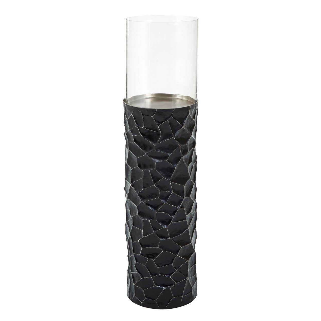 Introducing the Nala Tall Candle Holder, our meticulously crafted large floor-standing candle holder, a true statement piece. The cylindrical glass insert emits a soft, warm glow, creating an ambiance of refined elegance. The sturdy metal base, adorned with a hammered texture, not only ensures stability but also adds a captivating ?bling? effect when the candle is lit. Elevate your space with this exquisite blend of form and function.