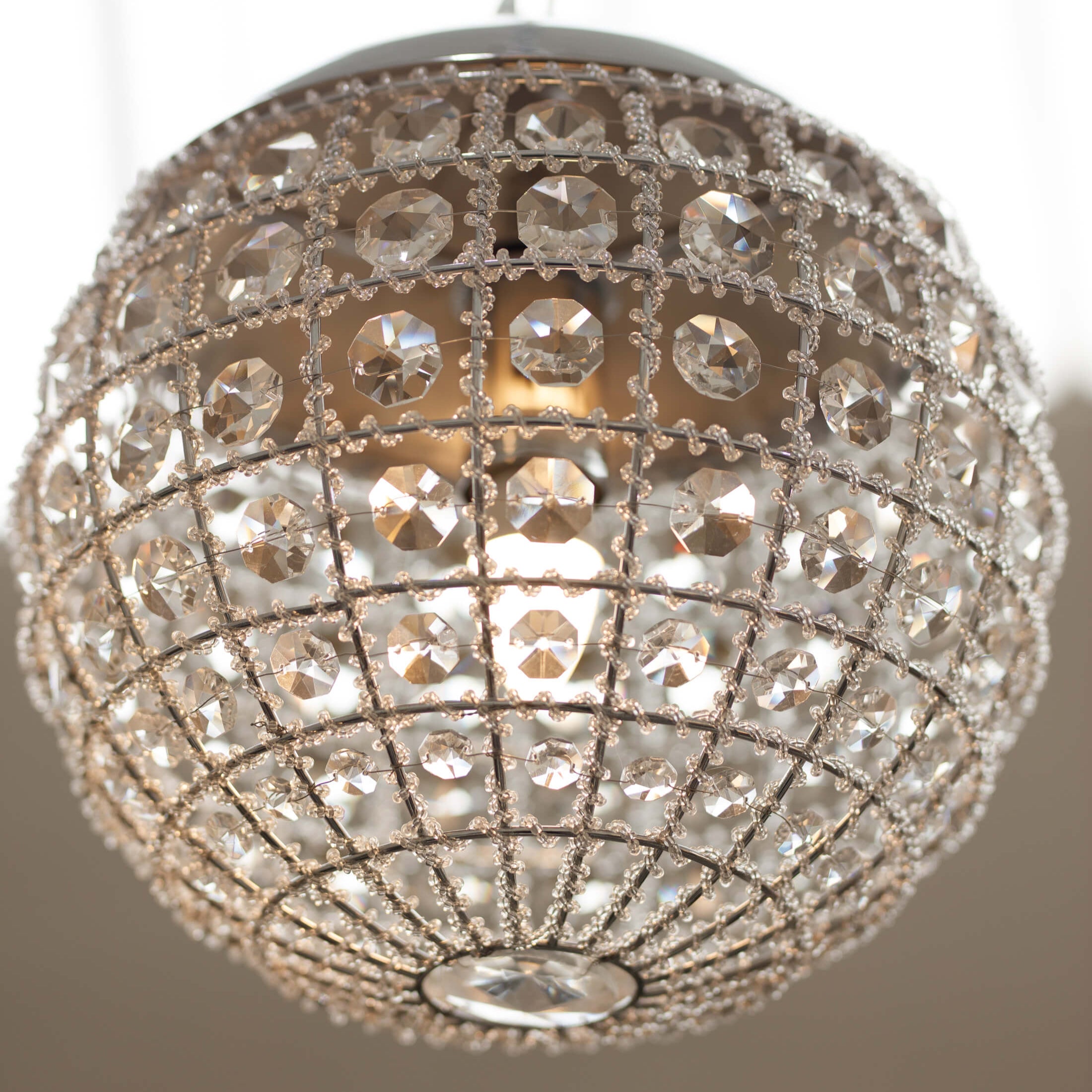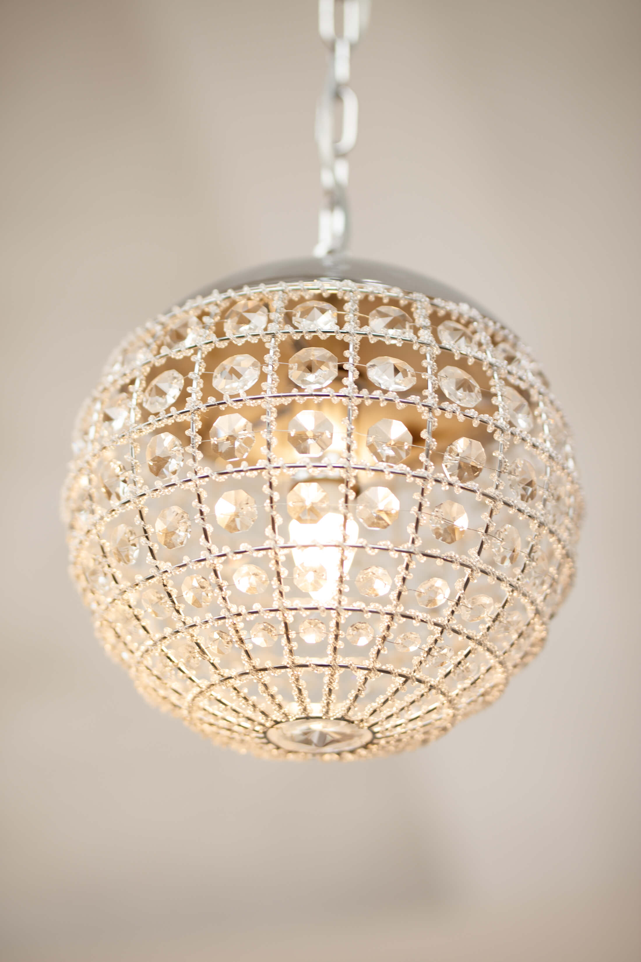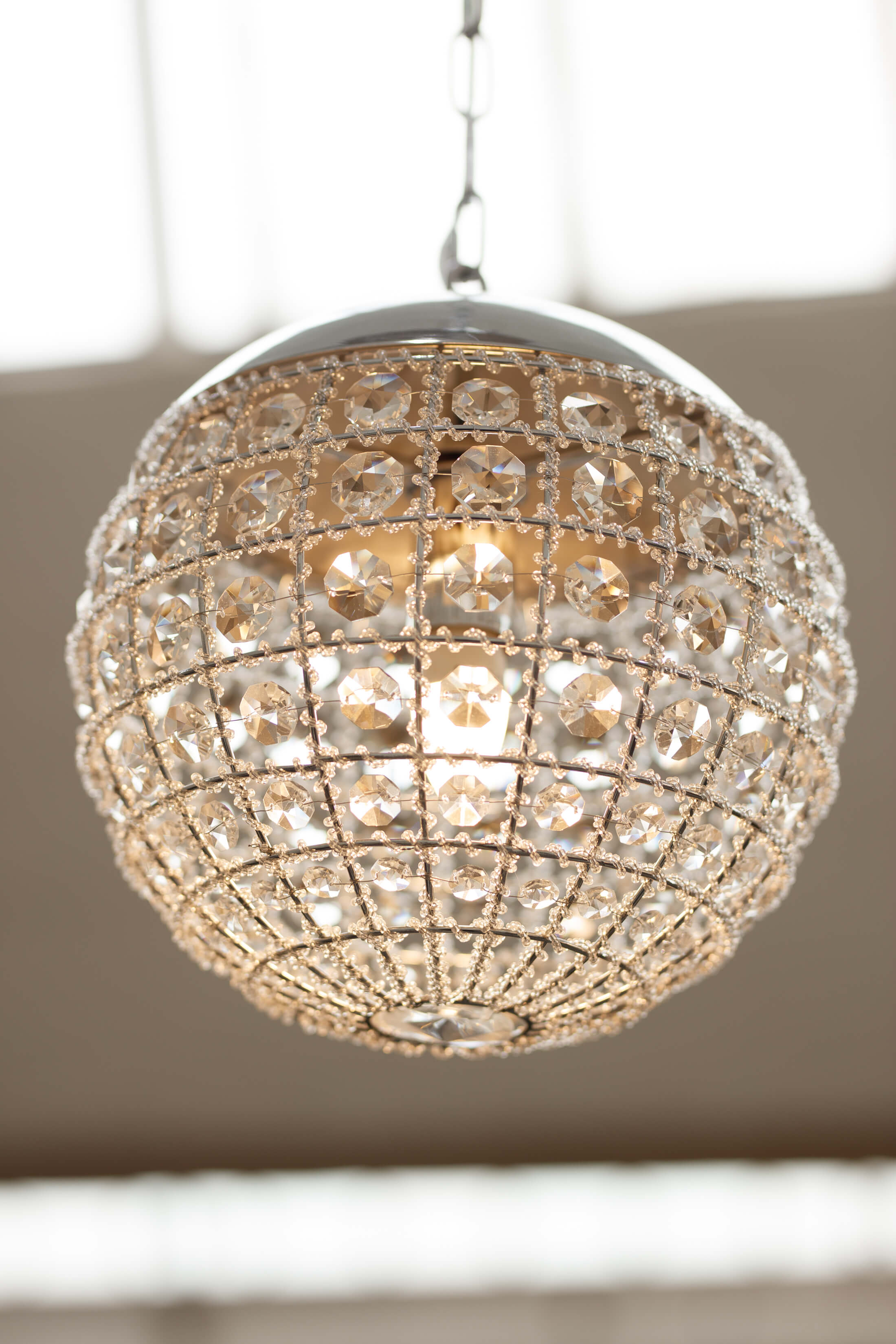 Introducing our Bora Orb Pendant, a stunning fusion of modern design and timeless elegance. Crafted with an iron framework, this exquisite piece is crowned with reflective chrome metal, adding a touch of sophistication. Beads of sparkling crystal glass are intricately entwined throughout the frame, with corresponding hexagons creating a mesmerizing refractive raiment.