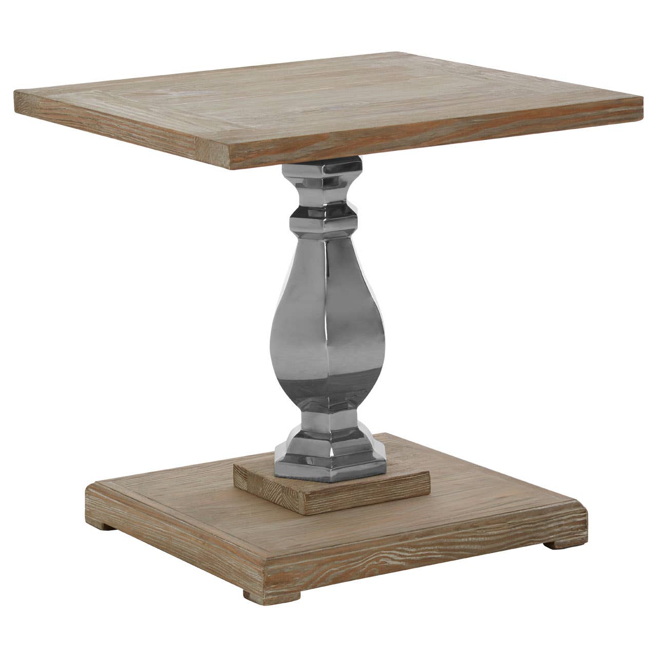 Introducing the Jaxon Side Table, crafted from whitewashed pine wood, exudes understated charm with its square top and base. The intricately carved, rounded single column post features a geometric texture, adding a touch of elegance. The metallic silver finish enhances its aesthetic, giving this table a striking visual appeal, perfect for any sophisticated interior.