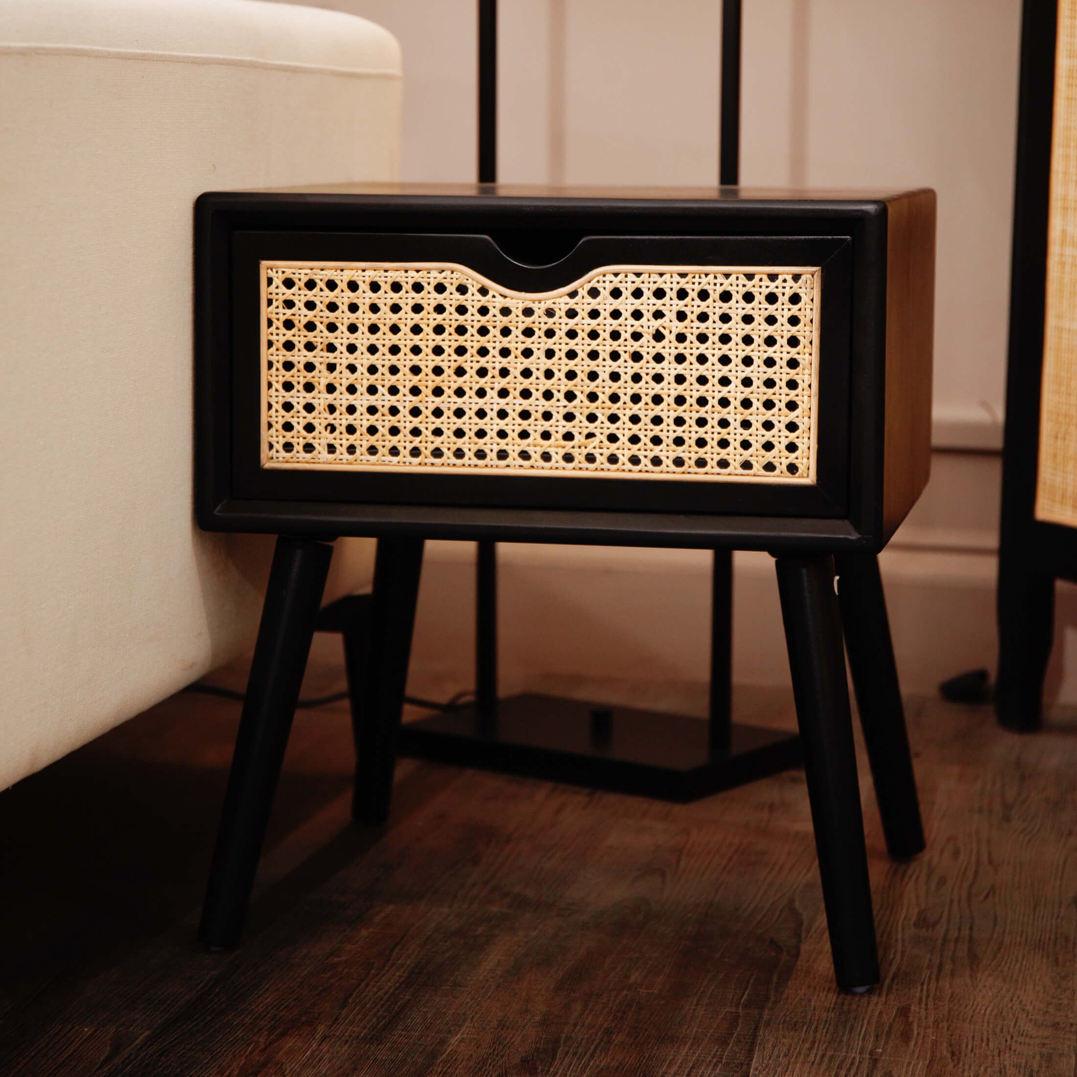 Introducing our Selby 1 drawer side table, crafted from sustainably sourced elm wood. This elegant piece features a single storage drawer with a rattan weave inset, adding a touch of natural sophistication. The black-finished wooden frame, complemented by angular legs, creates a timeless aesthetic. Elevate your living space with this luxurious and stylish addition.