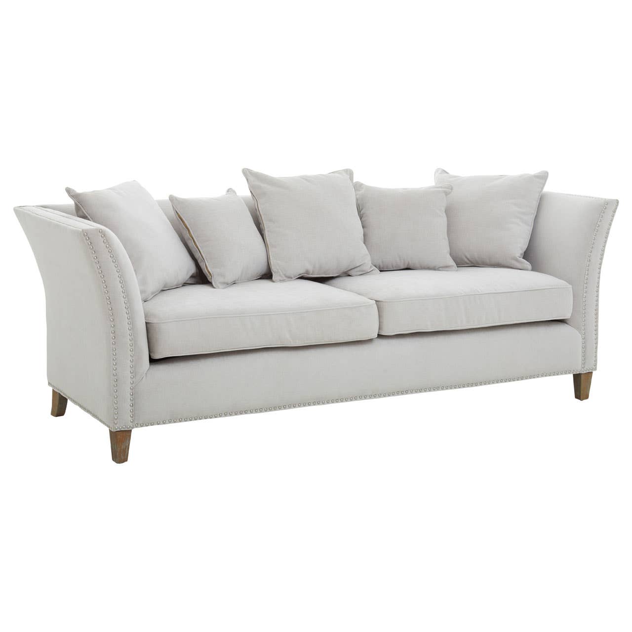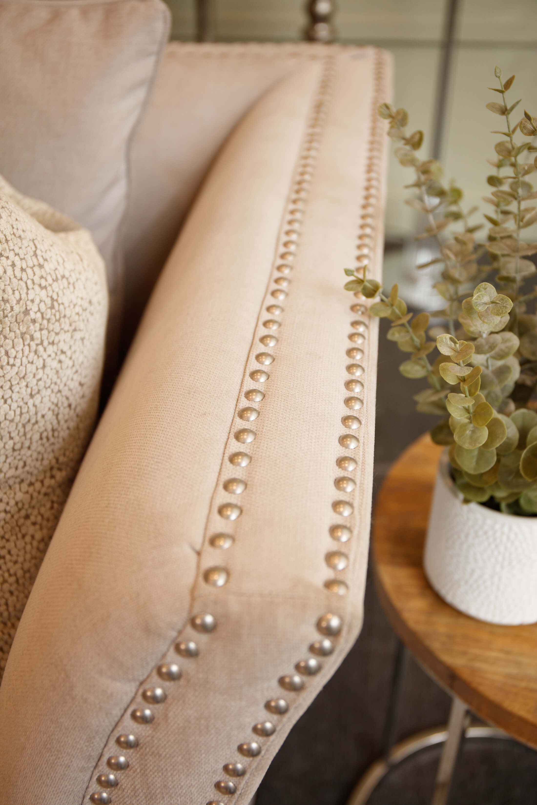 Introducing our Beaumont three-seat sofa, designed to bring modern elegance to your living space. Upholstered in smooth grey fabric with plush cushions, this piece offers both comfort and style. The arching arms, adorned with stud detailing, enhance its refined look, while the brown wooden legs provide a striking contrast, grounding the design with a touch of warmth. Elevate your home decor with this luxurious and stylish addition.