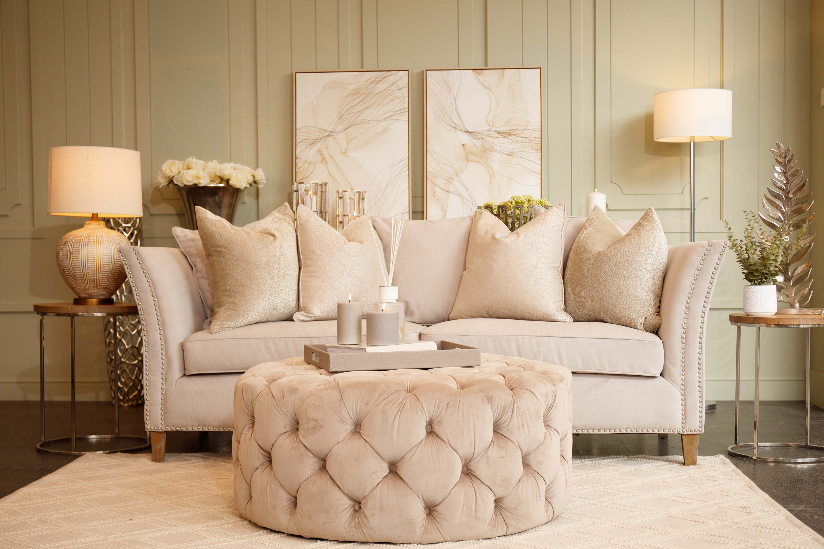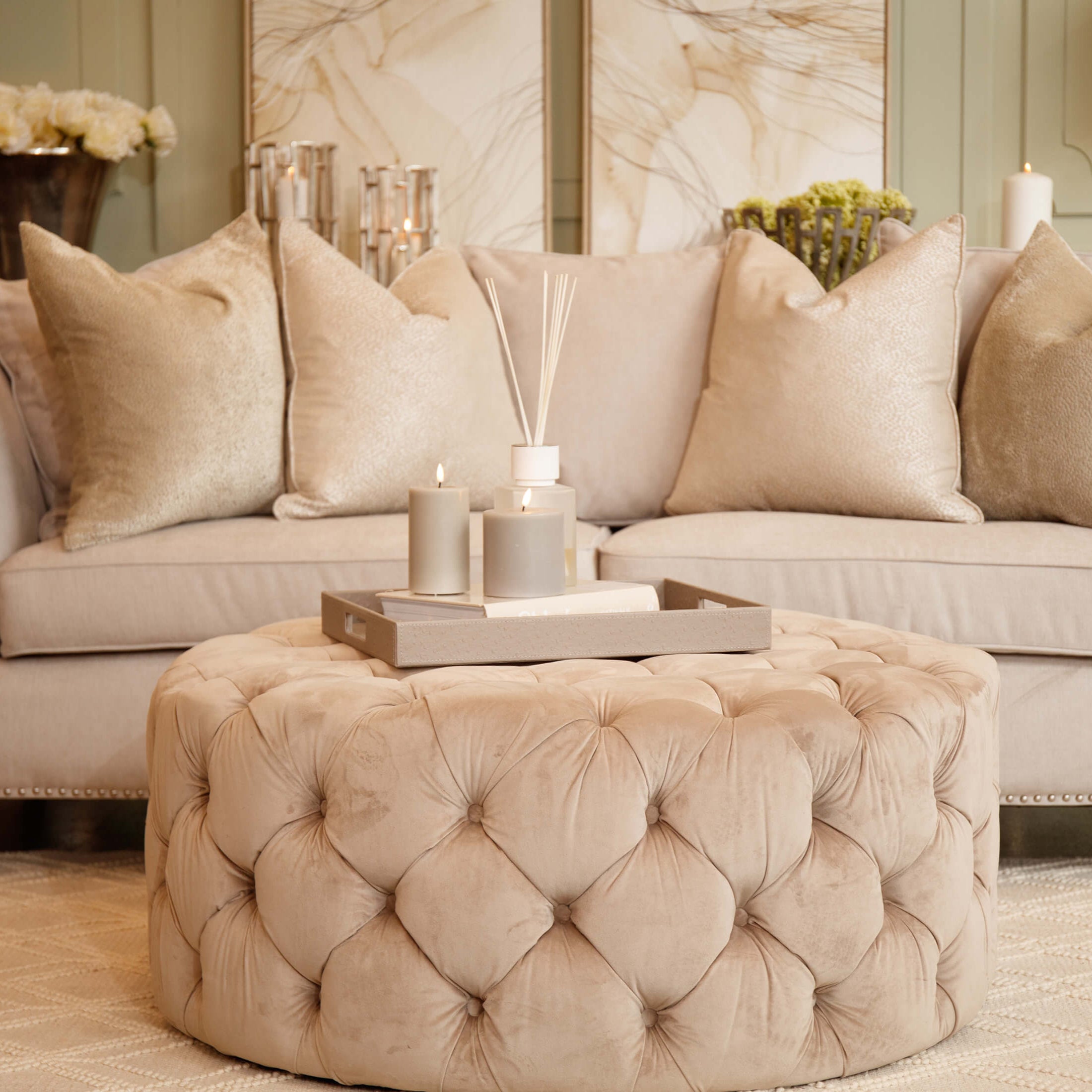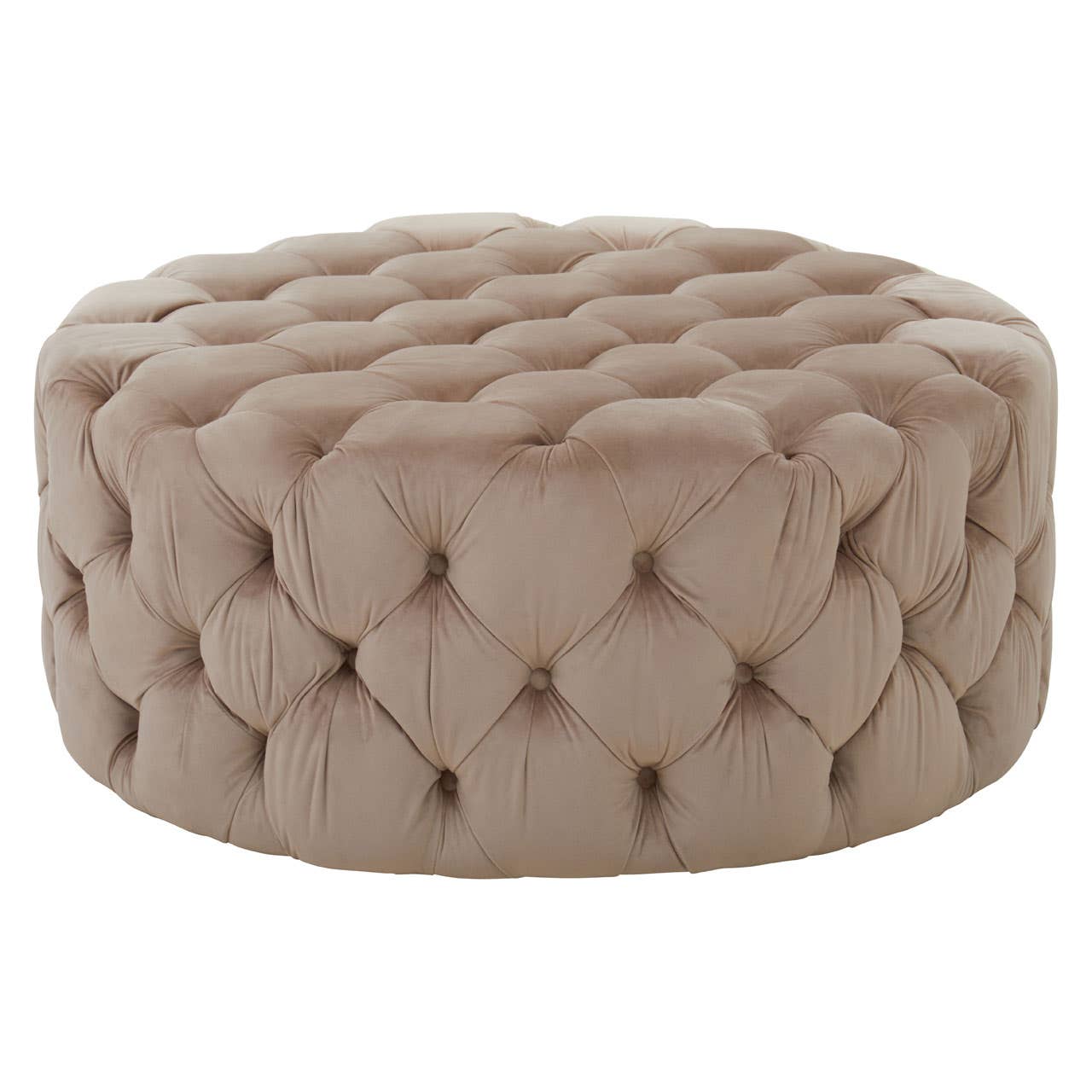 Introducing our Elmore round footstool, elegantly upholstered in soft natural velvet fabric for a tactile and sumptuous finish. The thick foam padding envelops a sturdy frame crafted from solid larch wood, ensuring both comfort and durability. The plush velvet is beautifully accentuated by button tuft detailing, forming a sophisticated diamond pattern. Elevate your living space with this exquisite and stylish piece, perfect for any refined home.