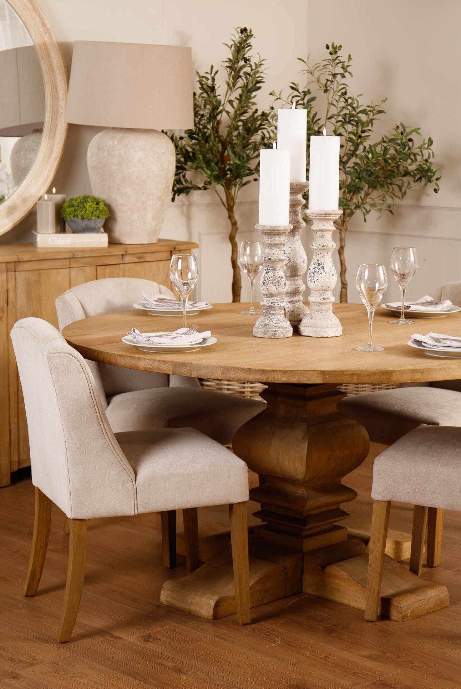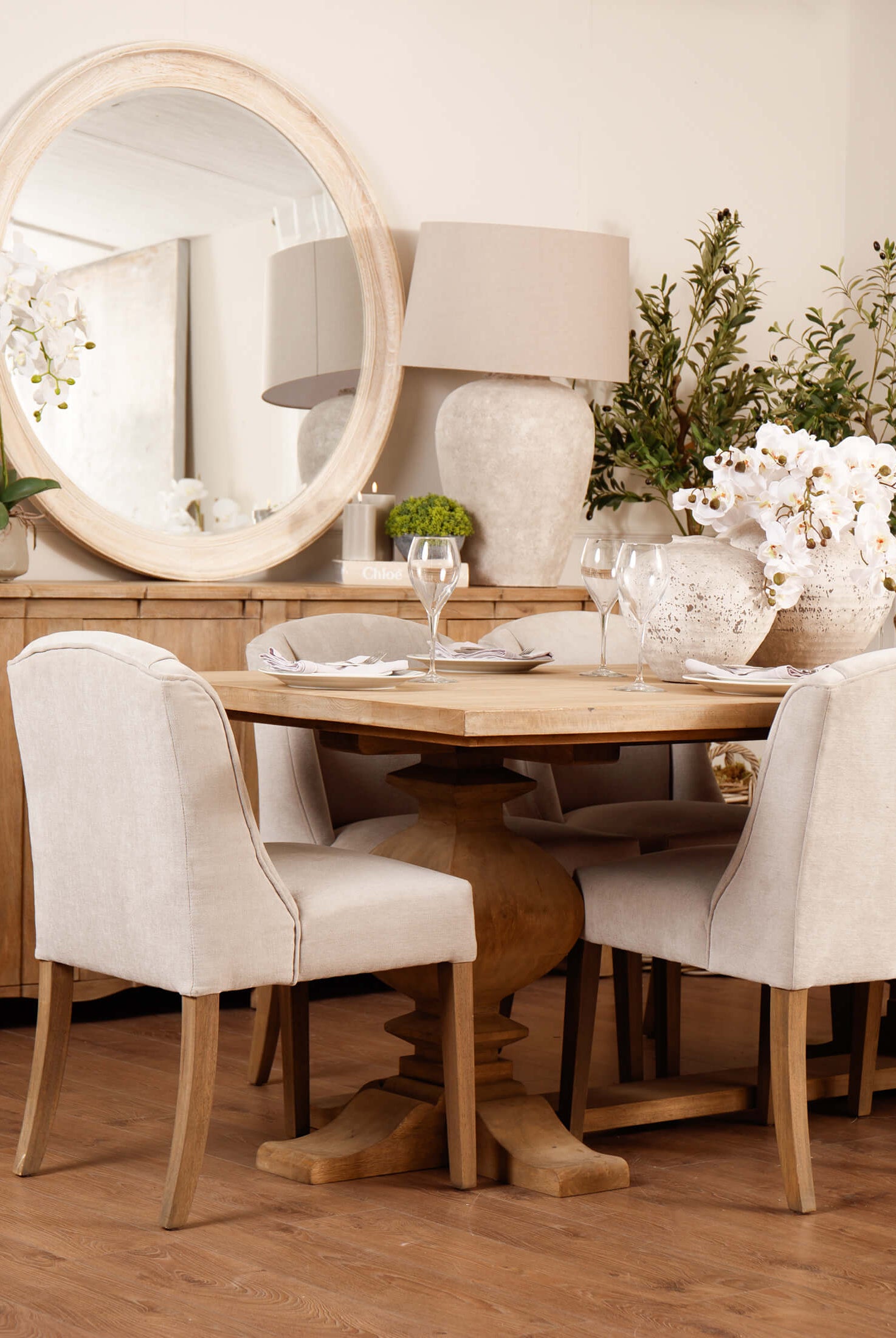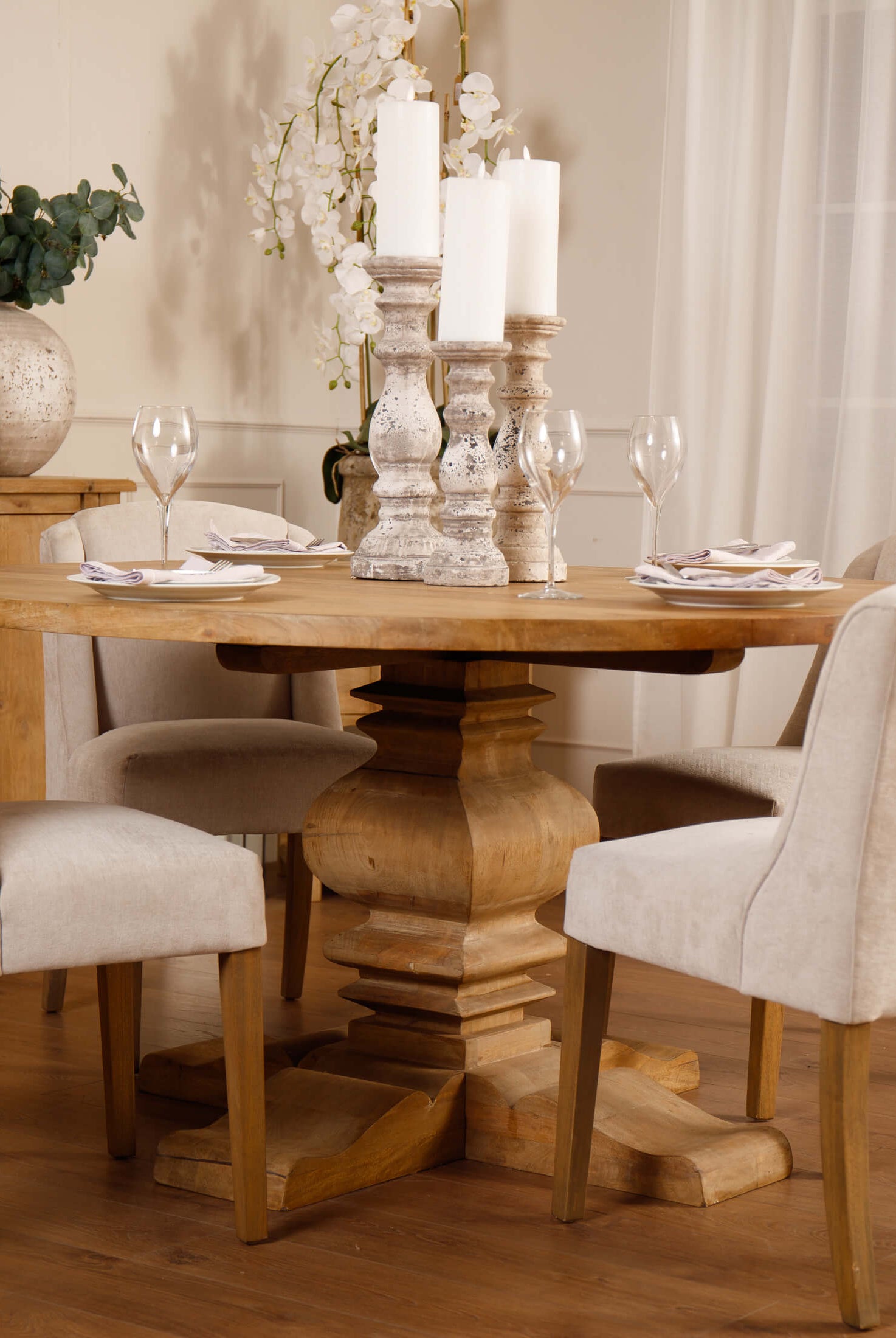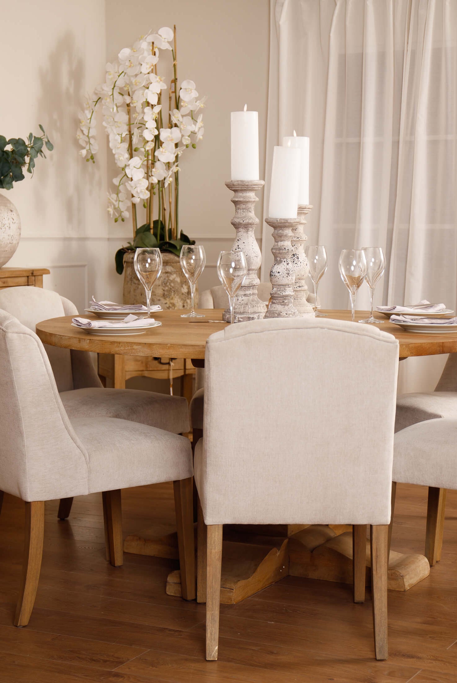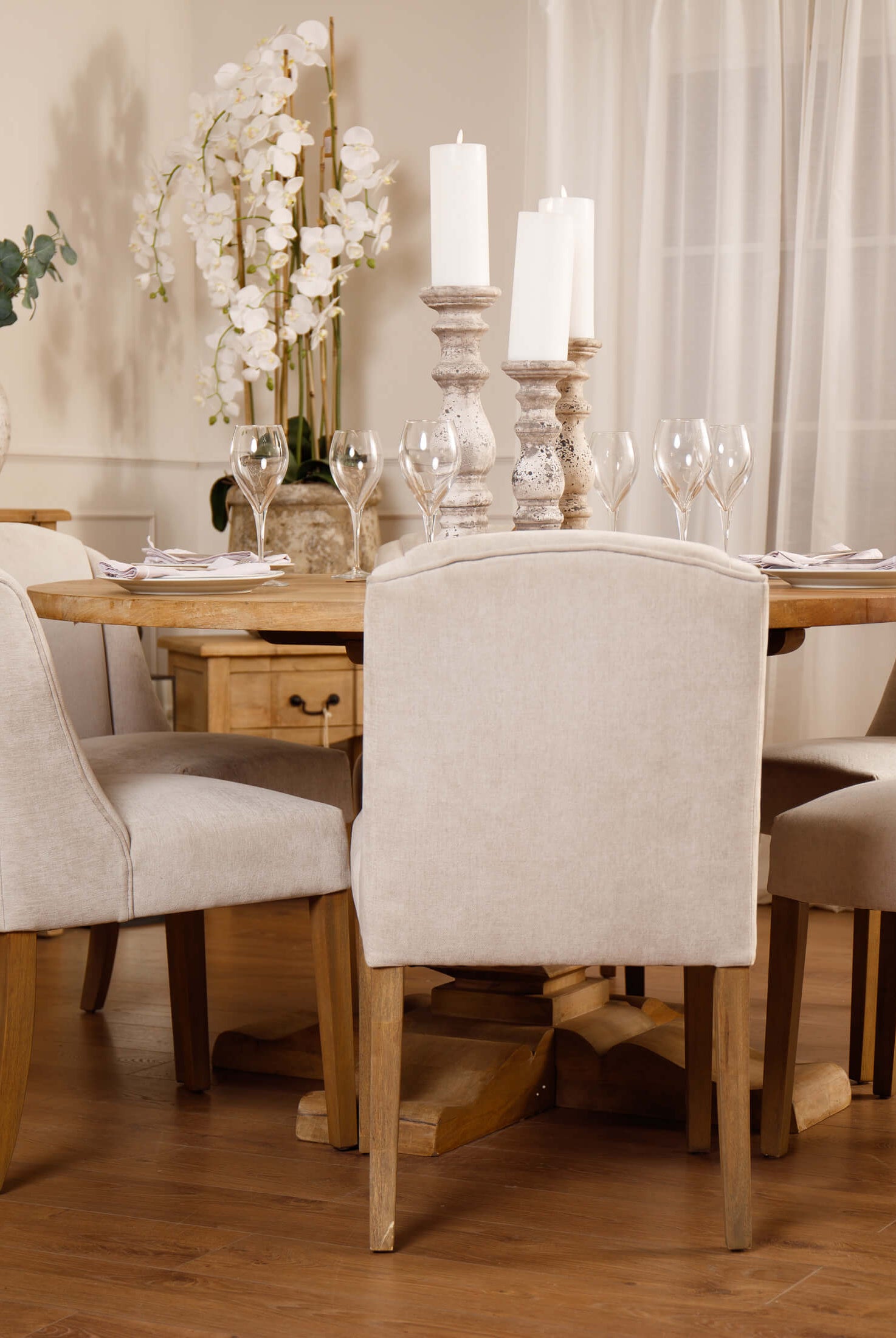 Welcome timeless charm into your dining space with our Sutton collection. Featuring a beautifully crafted round wooden table paired with upholstered dining chairs in a soft, neutral tone, this setting is all about understated elegance and inviting warmth. The look is grounded in earthy textures and elevated with sculptural candleholders, delicate glassware, and graceful floral accents. Soft, filtered light through sheer curtains creates a calm, serene atmosphere, perfect for intimate dinners or relaxed gatherings.
