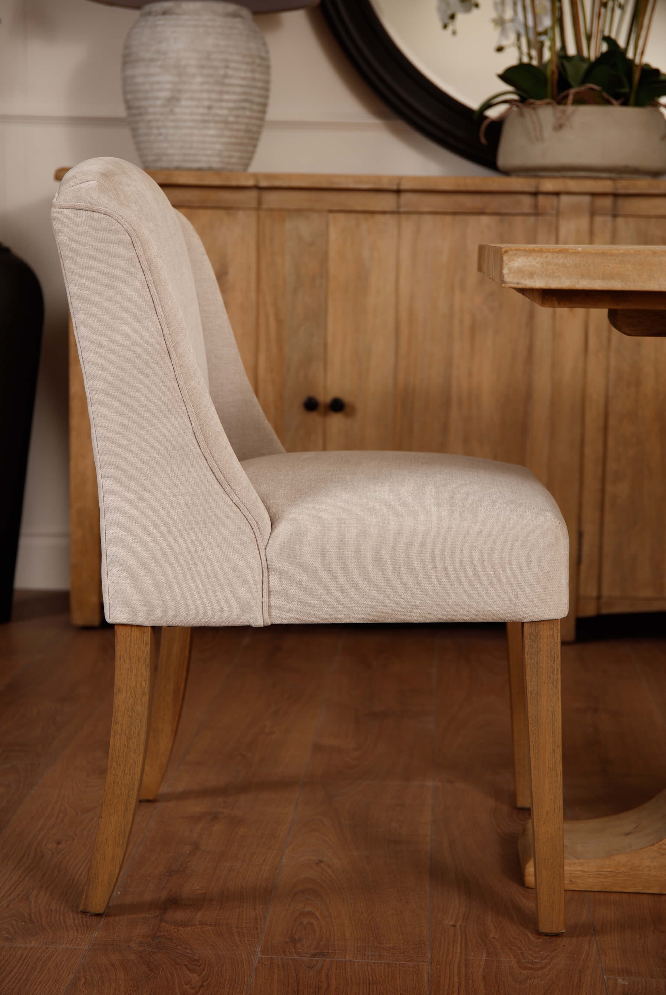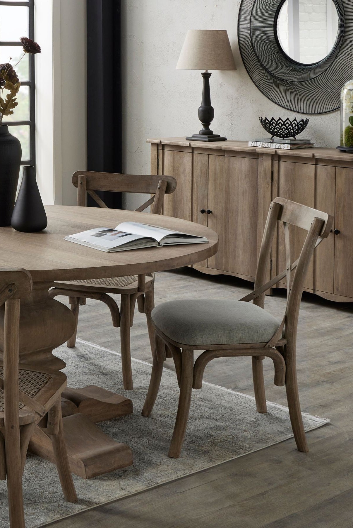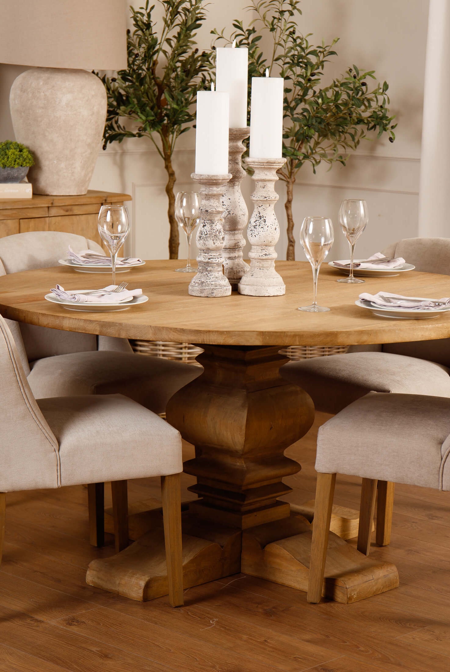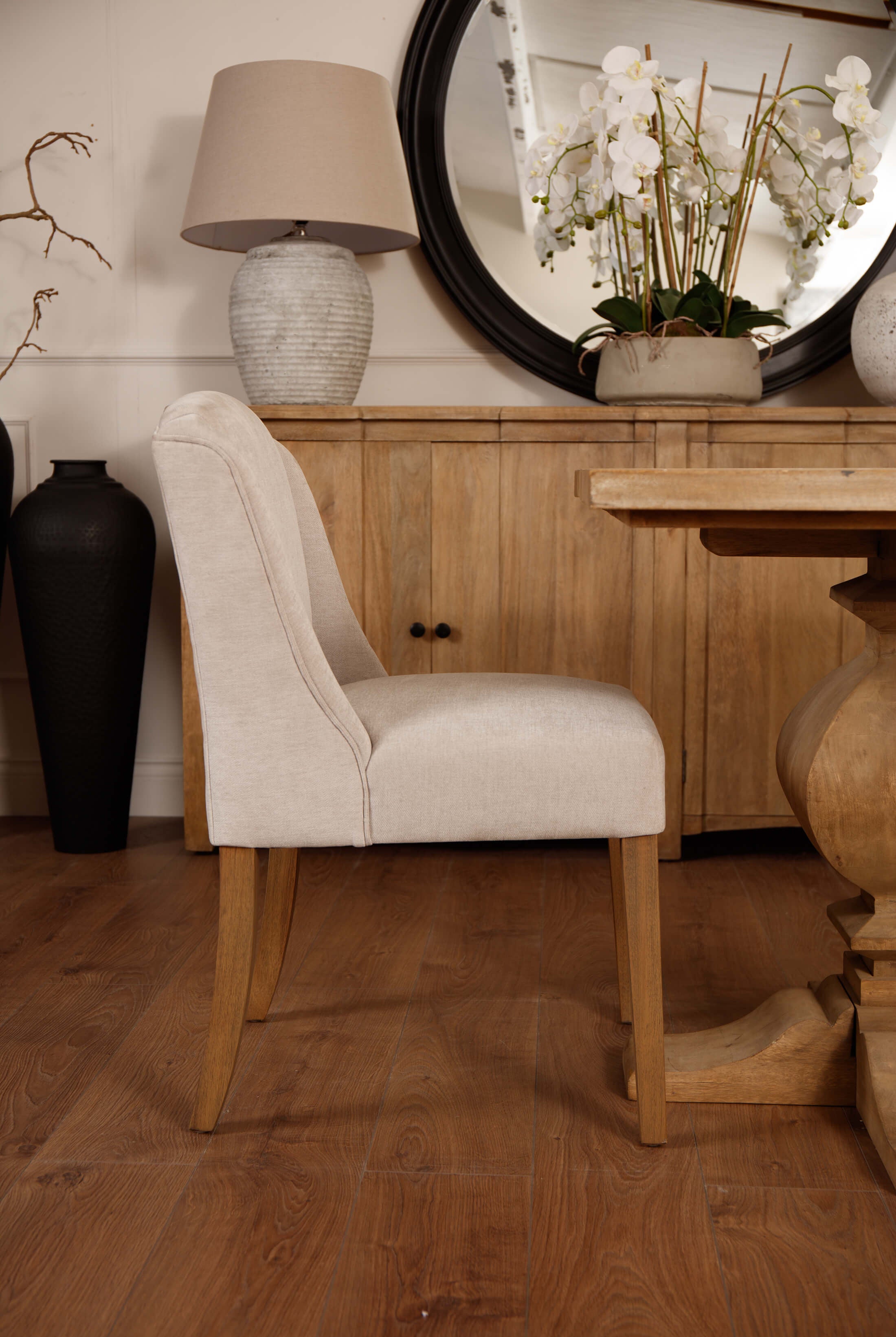 Welcome timeless charm into your dining space with our Sutton collection. Featuring a beautifully crafted round wooden table paired with upholstered dining chairs in a soft, neutral tone, this setting is all about understated elegance and inviting warmth. The look is grounded in earthy textures and elevated with sculptural candleholders, delicate glassware, and graceful floral accents. Soft, filtered light through sheer curtains creates a calm, serene atmosphere, perfect for intimate dinners or relaxed gatherings.