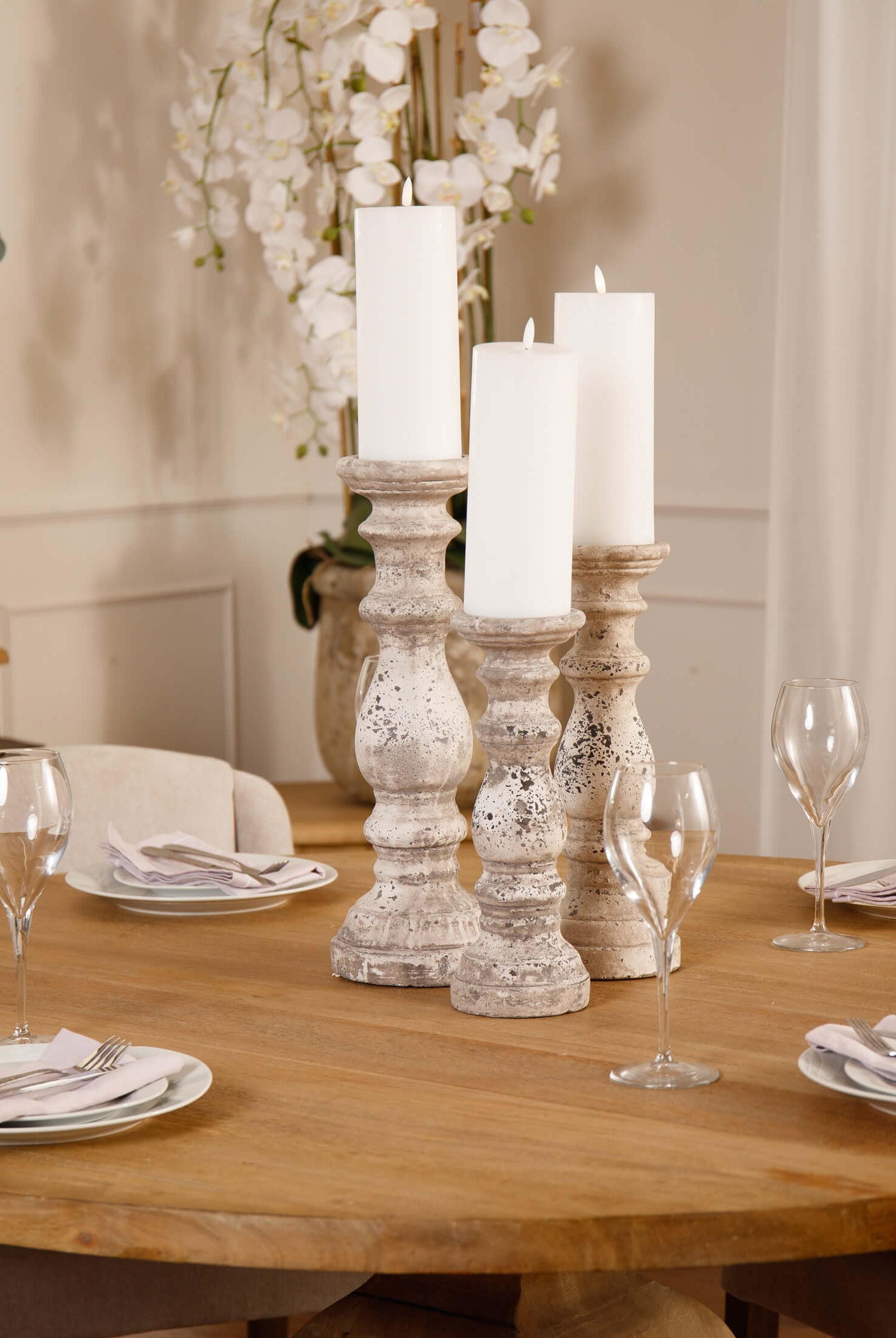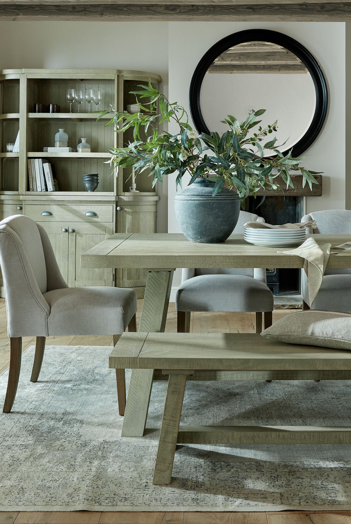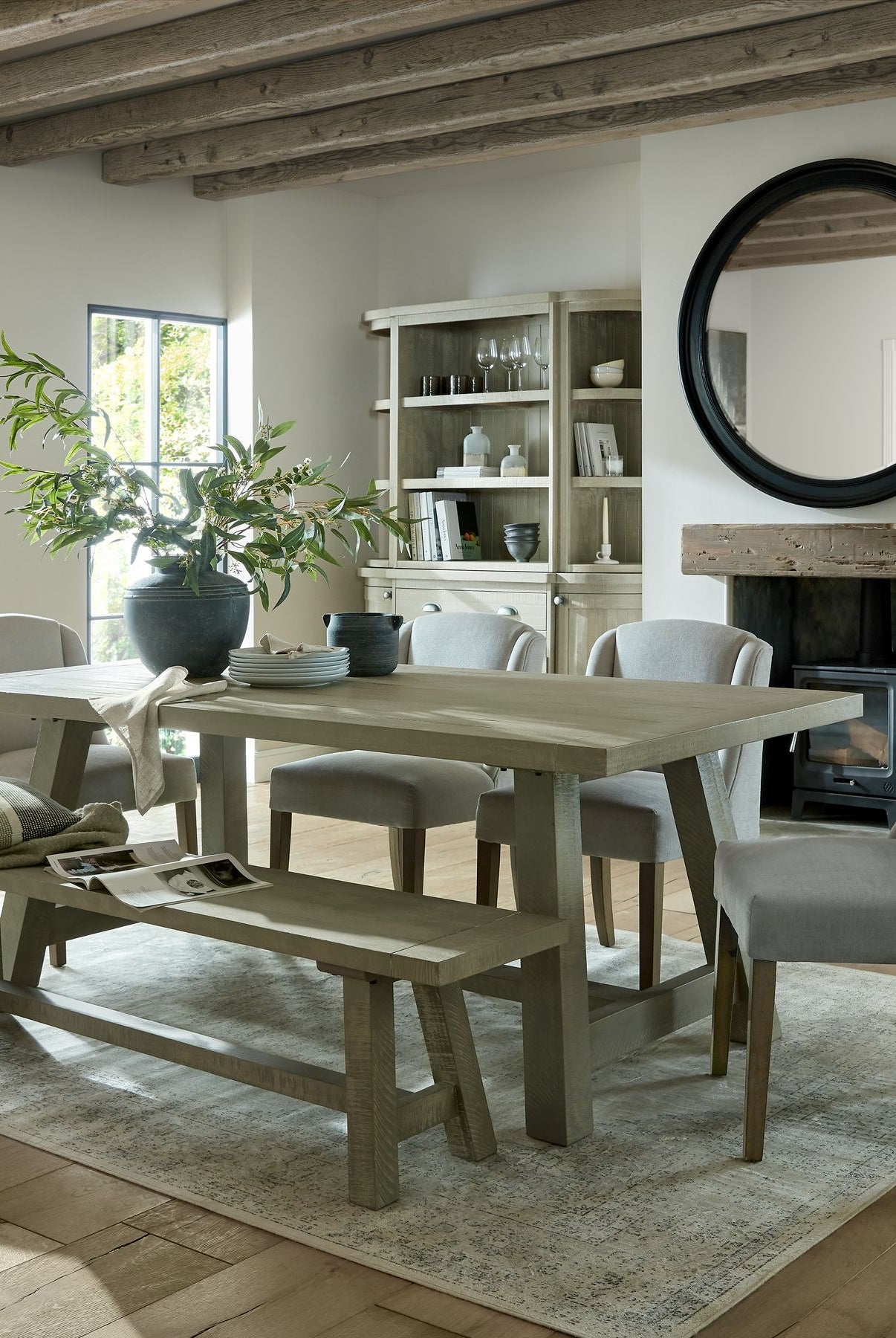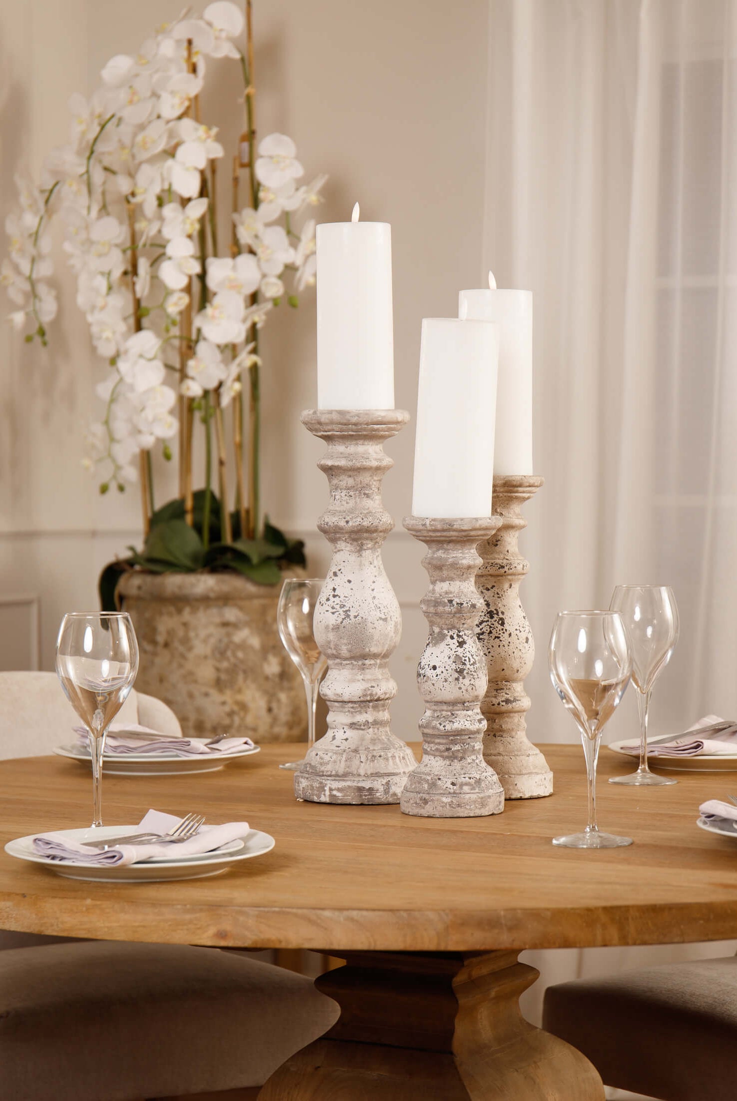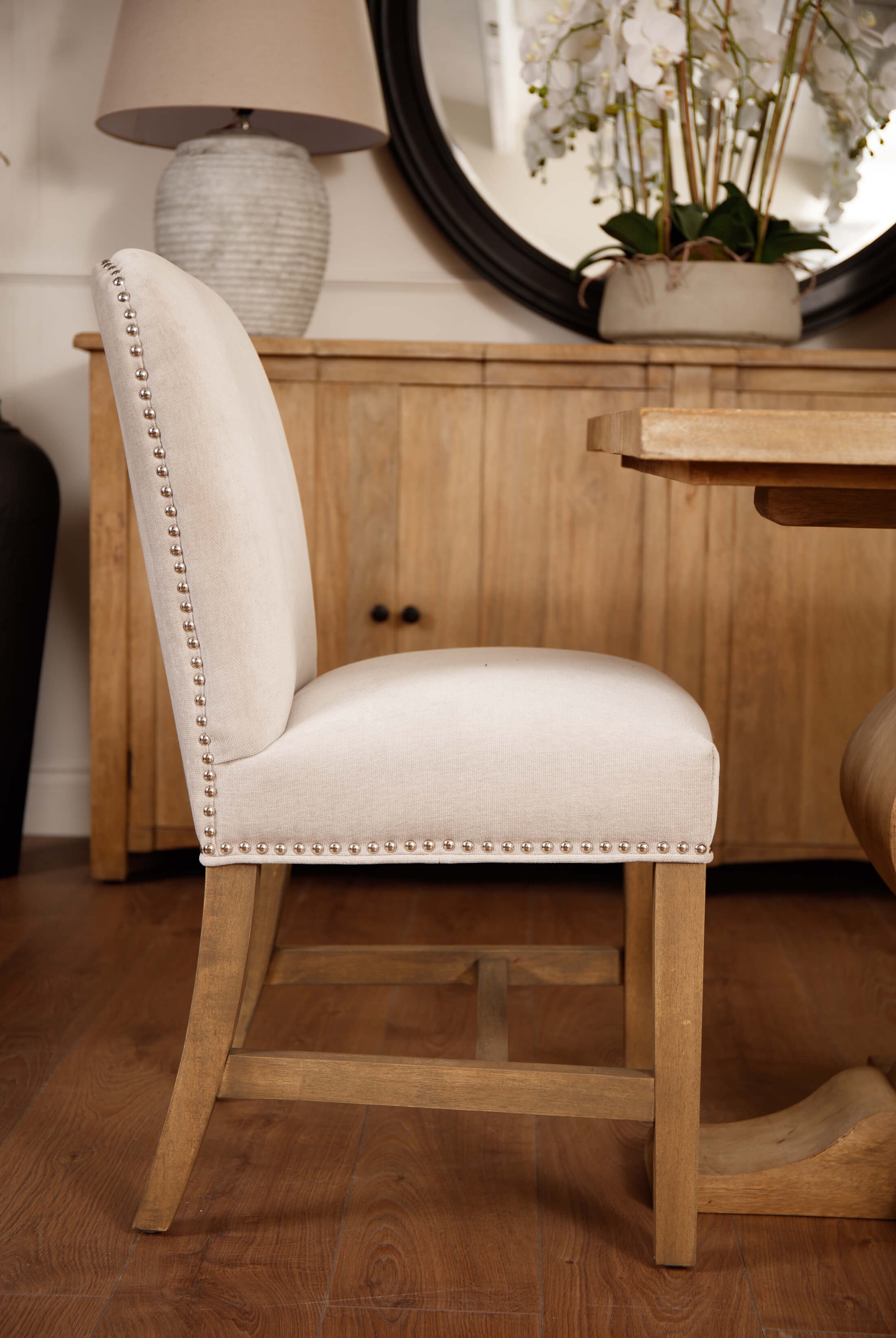 Welcome timeless charm into your dining space with our Sutton collection. Featuring a beautifully crafted round wooden table paired with upholstered dining chairs in a soft, neutral tone, this setting is all about understated elegance and inviting warmth. The look is grounded in earthy textures and elevated with sculptural candleholders, delicate glassware, and graceful floral accents. Soft, filtered light through sheer curtains creates a calm, serene atmosphere, perfect for intimate dinners or relaxed gatherings.