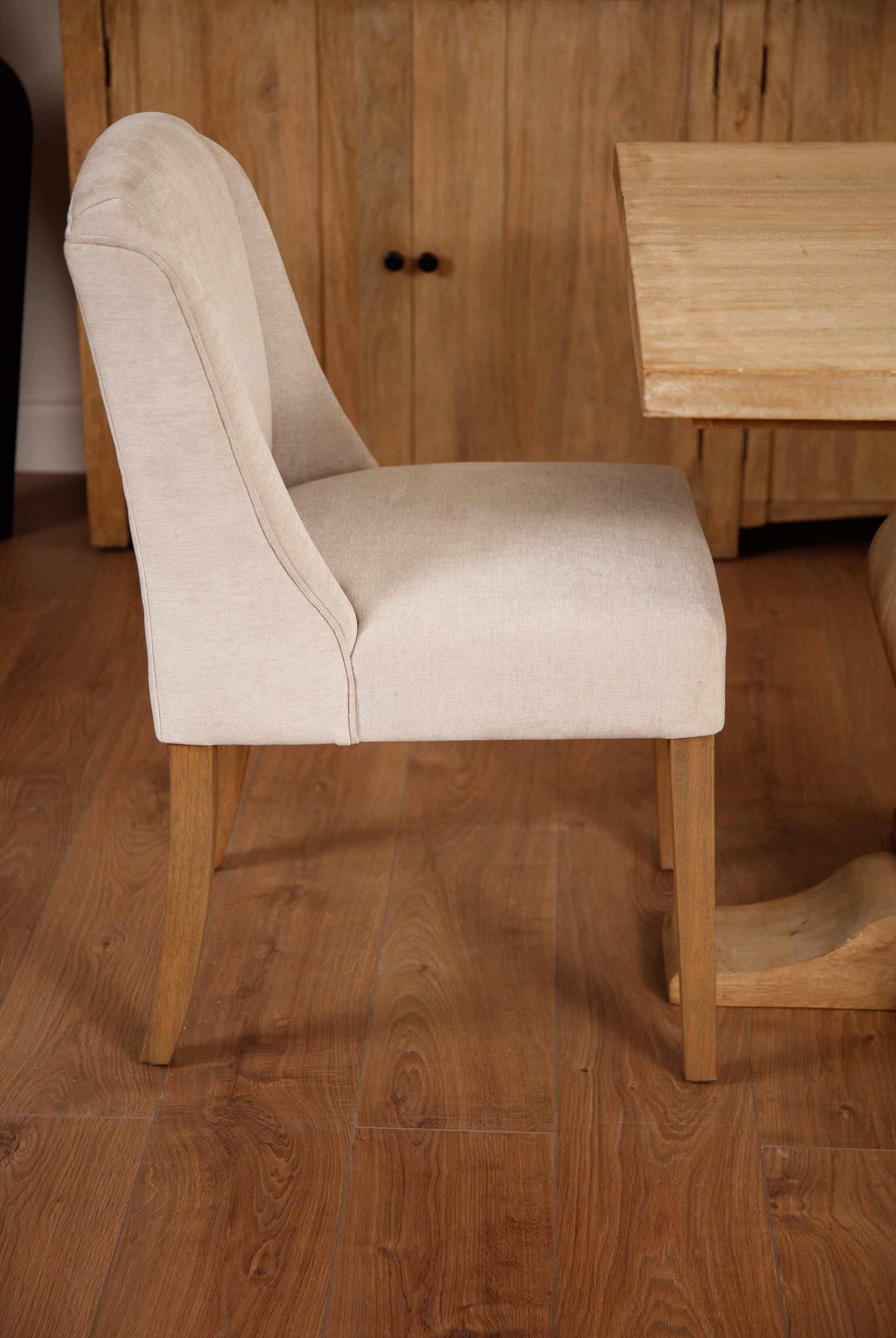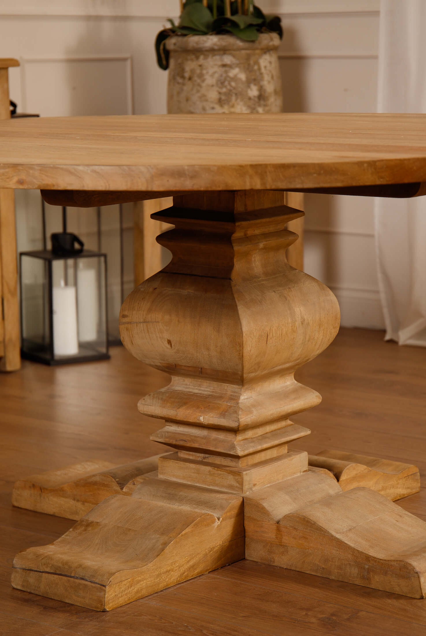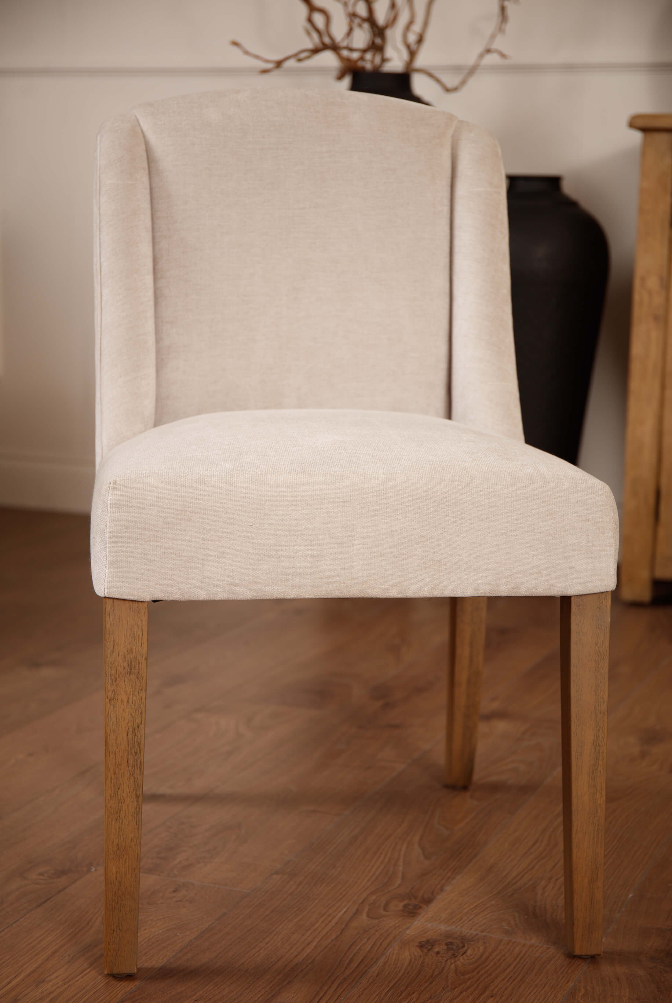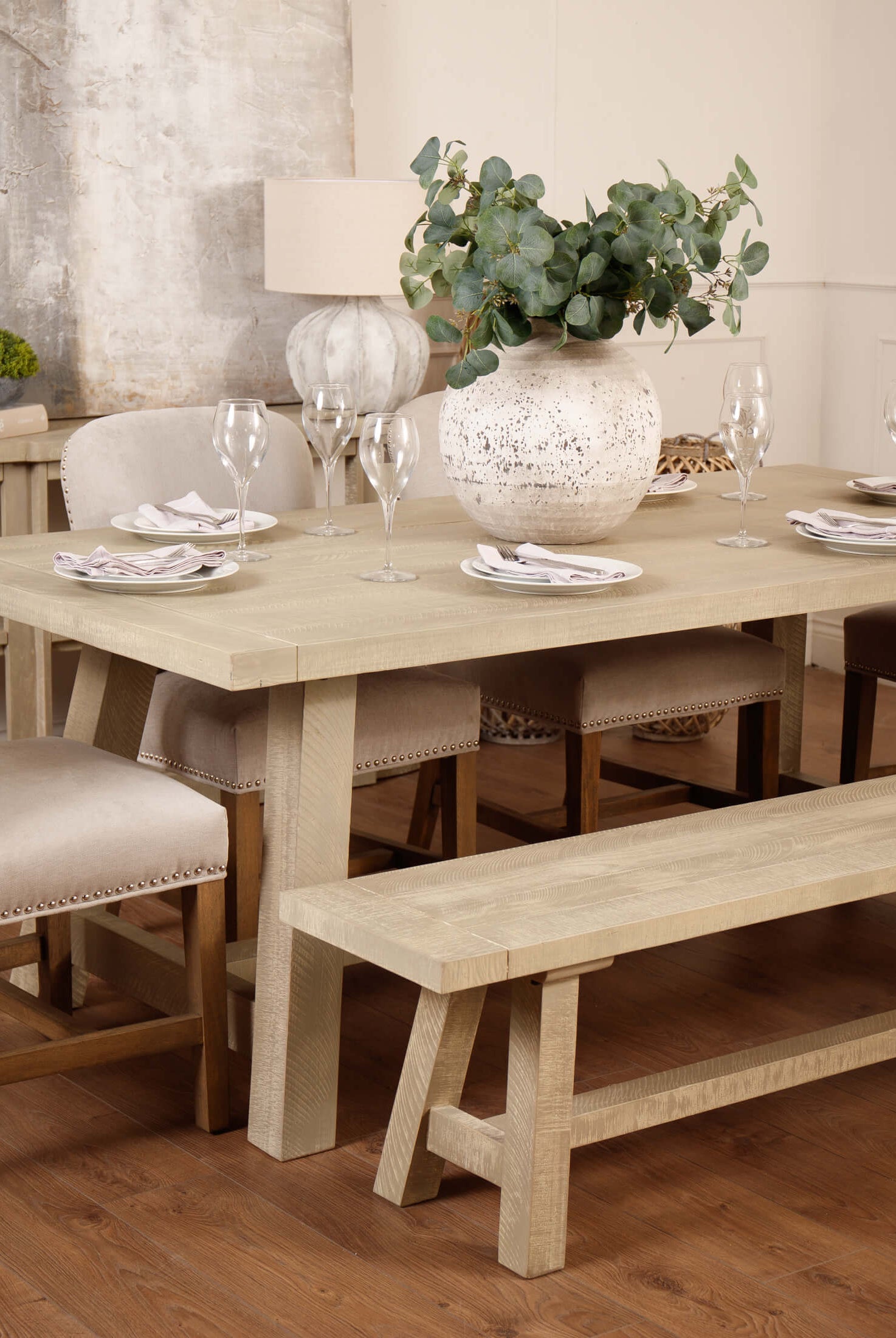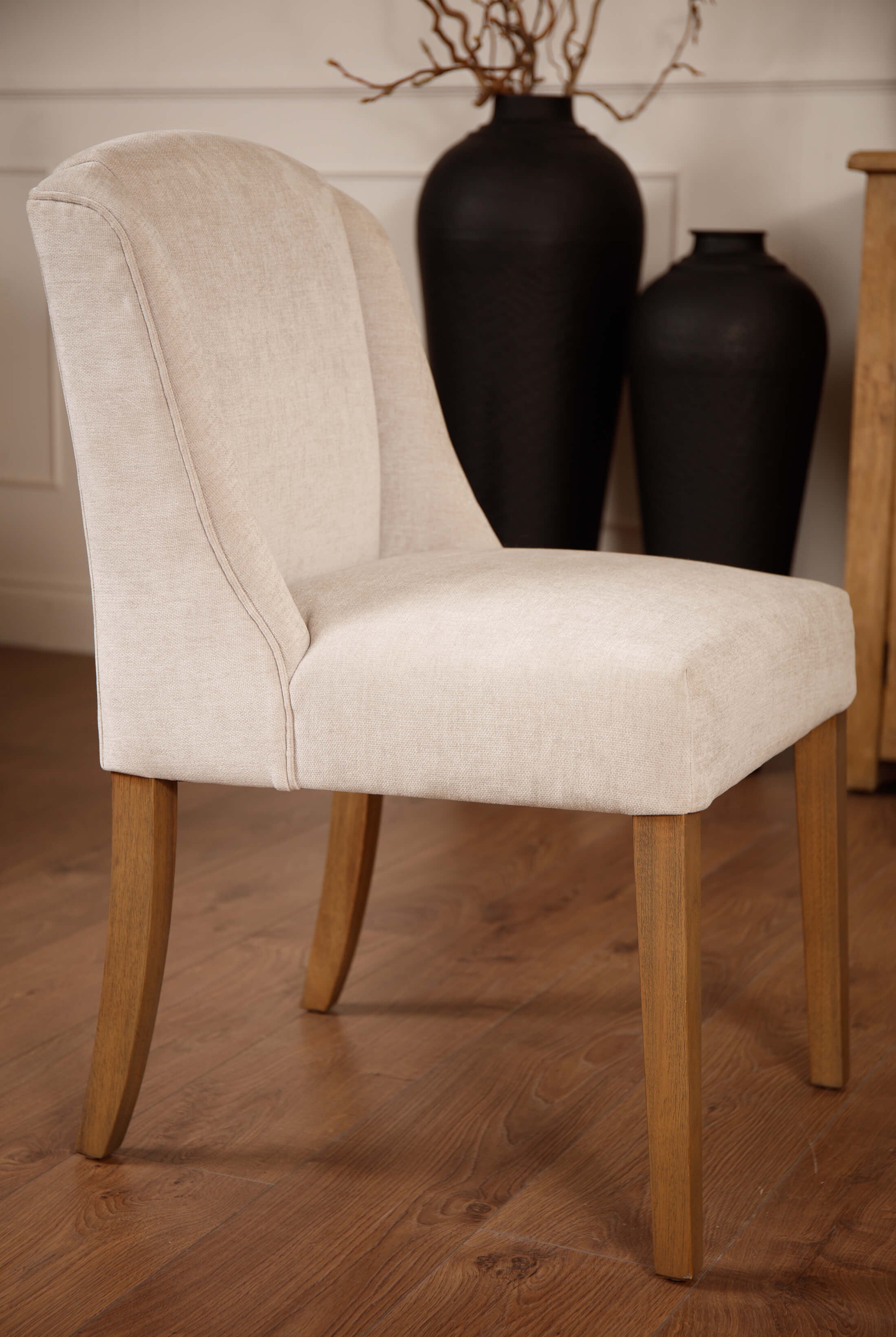Welcome timeless charm into your dining space with our Sutton collection. Featuring a beautifully crafted round wooden table paired with upholstered dining chairs in a soft, neutral tone, this setting is all about understated elegance and inviting warmth. The look is grounded in earthy textures and elevated with sculptural candleholders, delicate glassware, and graceful floral accents. Soft, filtered light through sheer curtains creates a calm, serene atmosphere, perfect for intimate dinners or relaxed gatherings.