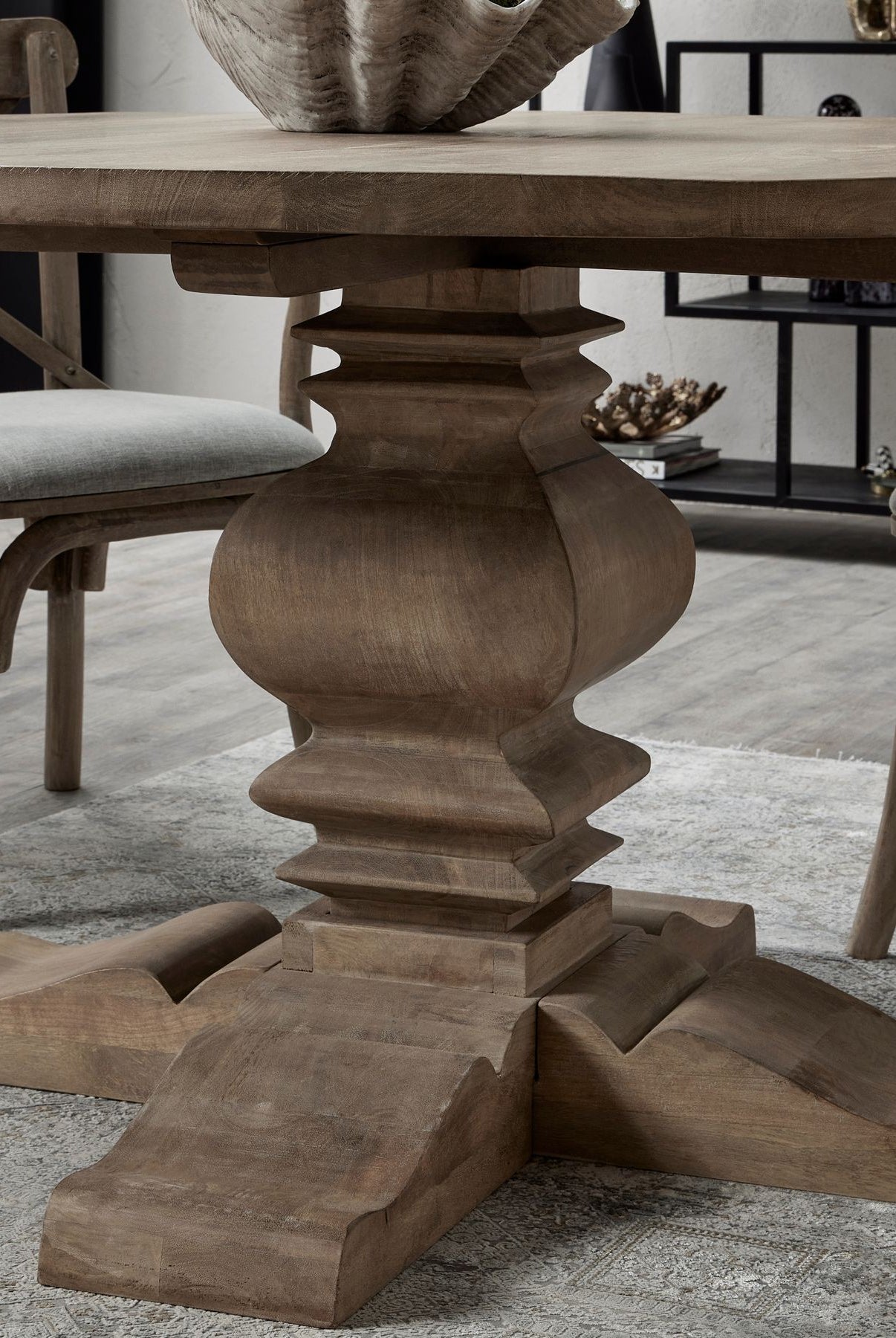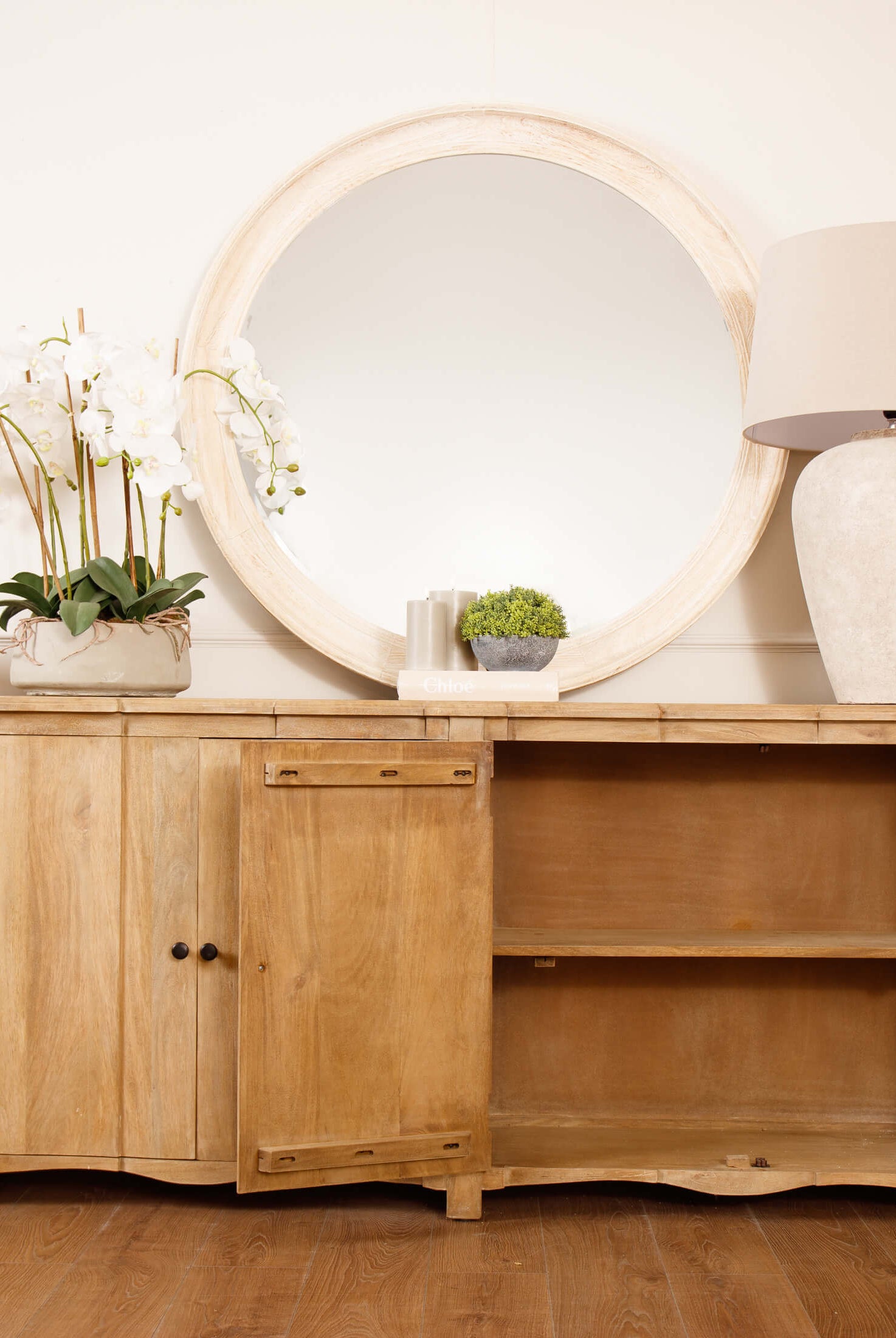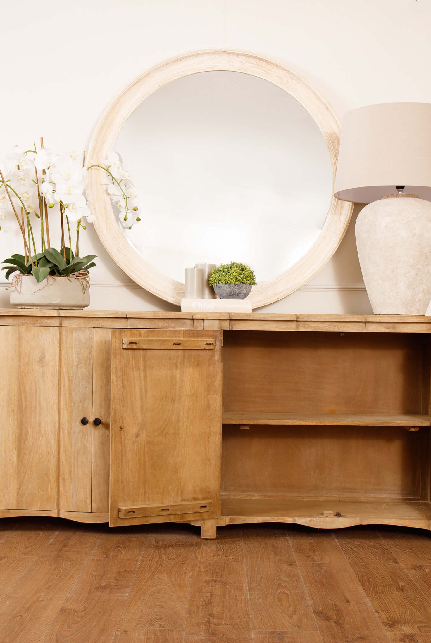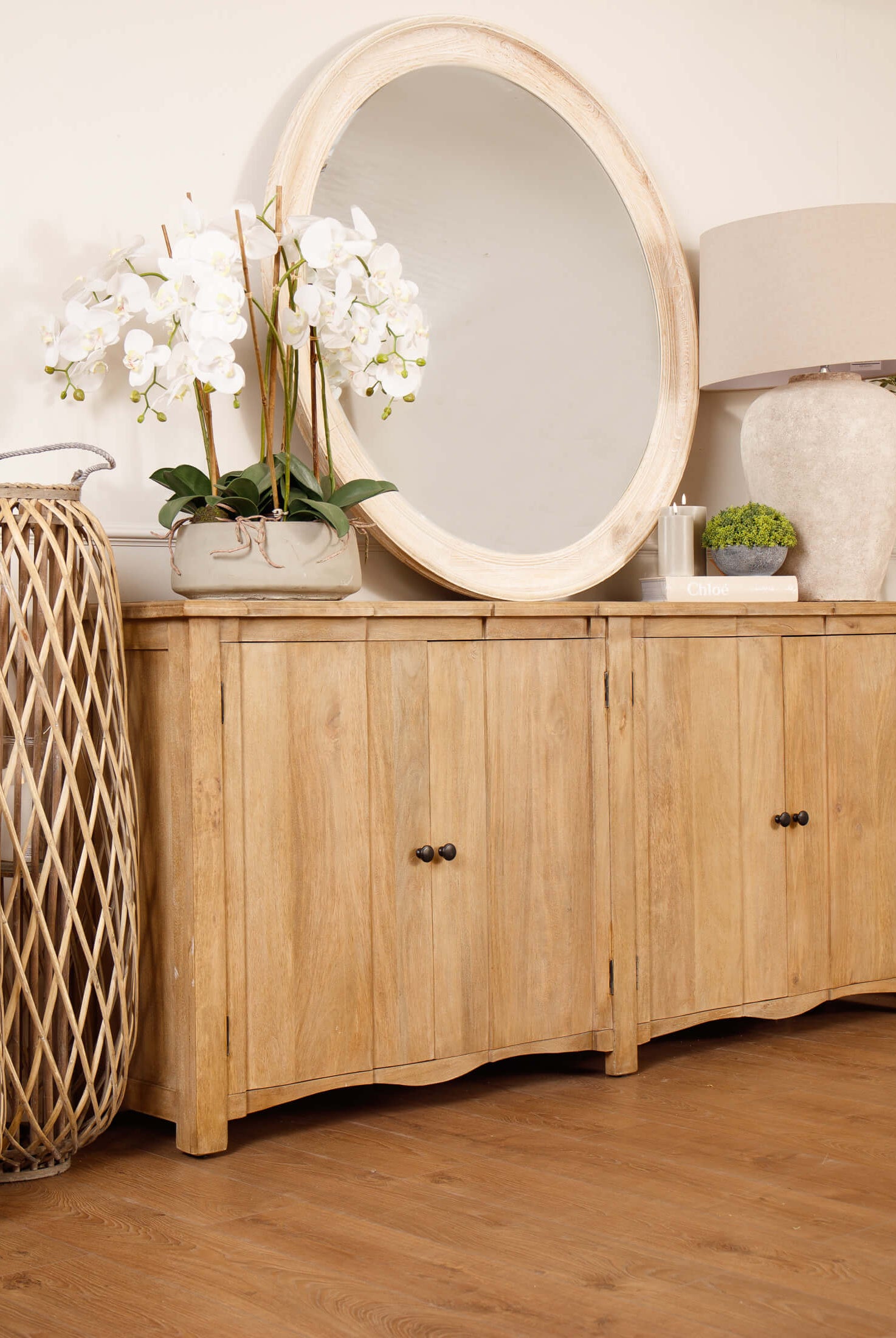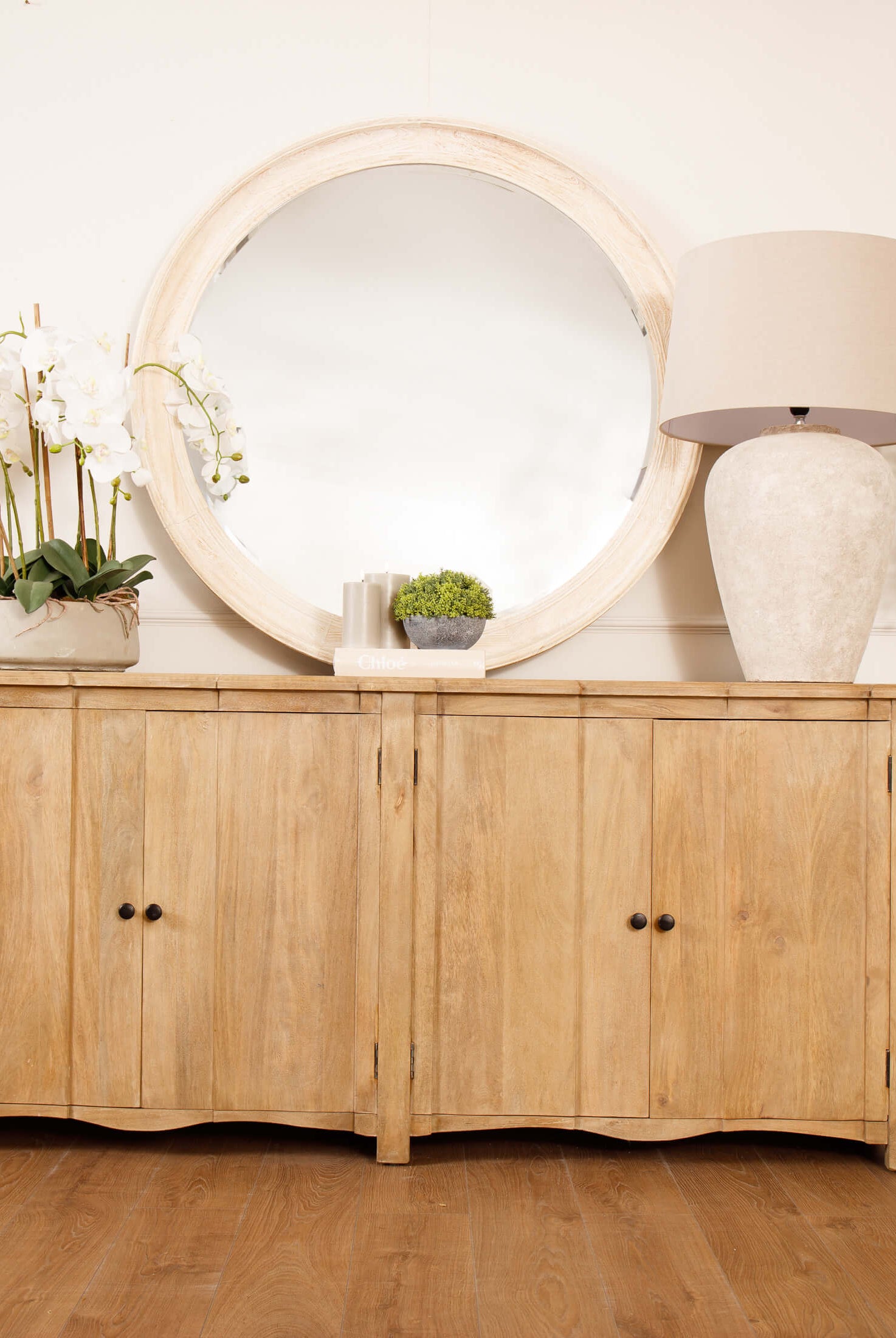 Welcome timeless charm into your dining space with our Sutton collection. Featuring a beautifully crafted round wooden table paired with upholstered dining chairs in a soft, neutral tone, this setting is all about understated elegance and inviting warmth. The look is grounded in earthy textures and elevated with sculptural candleholders, delicate glassware, and graceful floral accents. Soft, filtered light through sheer curtains creates a calm, serene atmosphere, perfect for intimate dinners or relaxed gatherings.