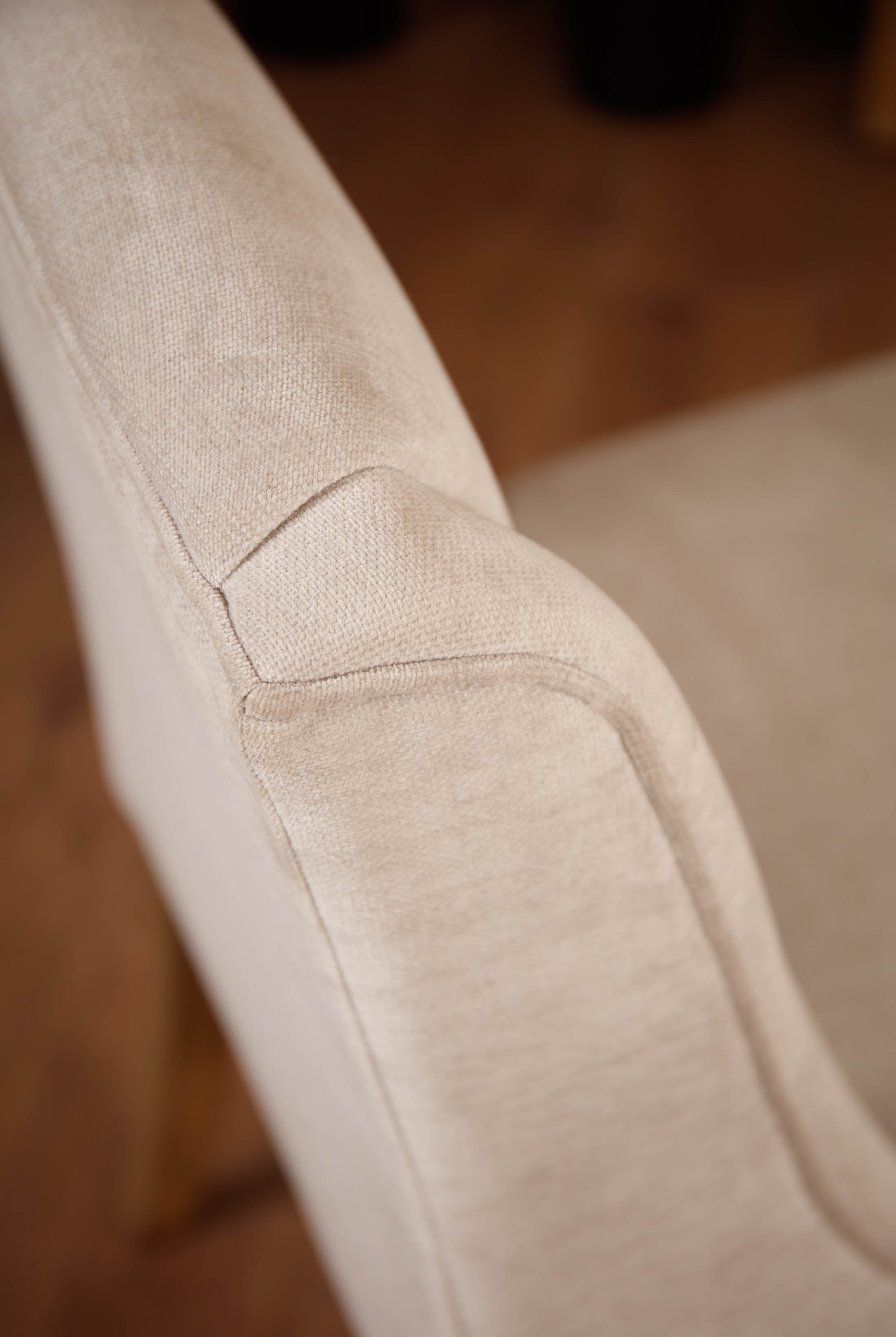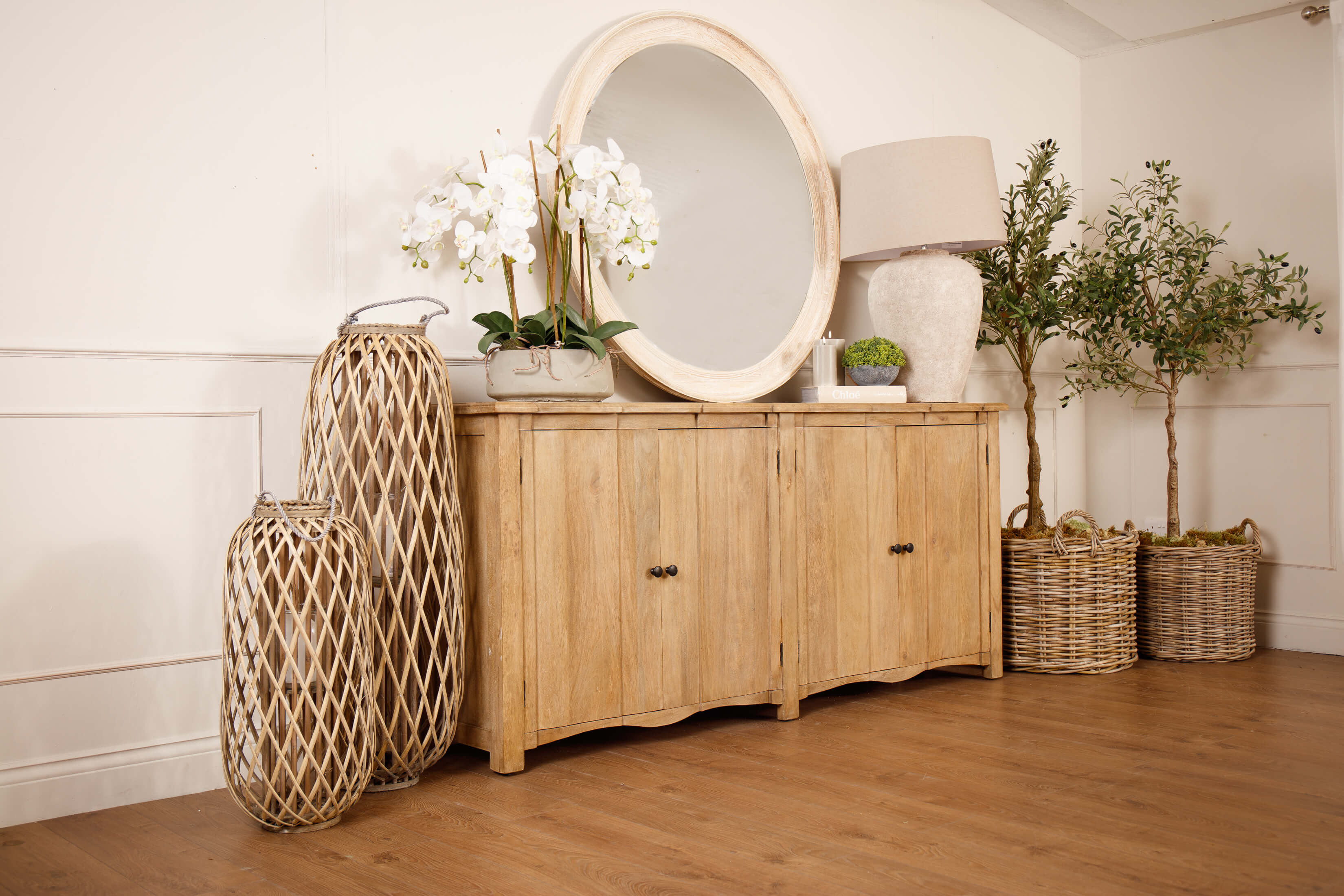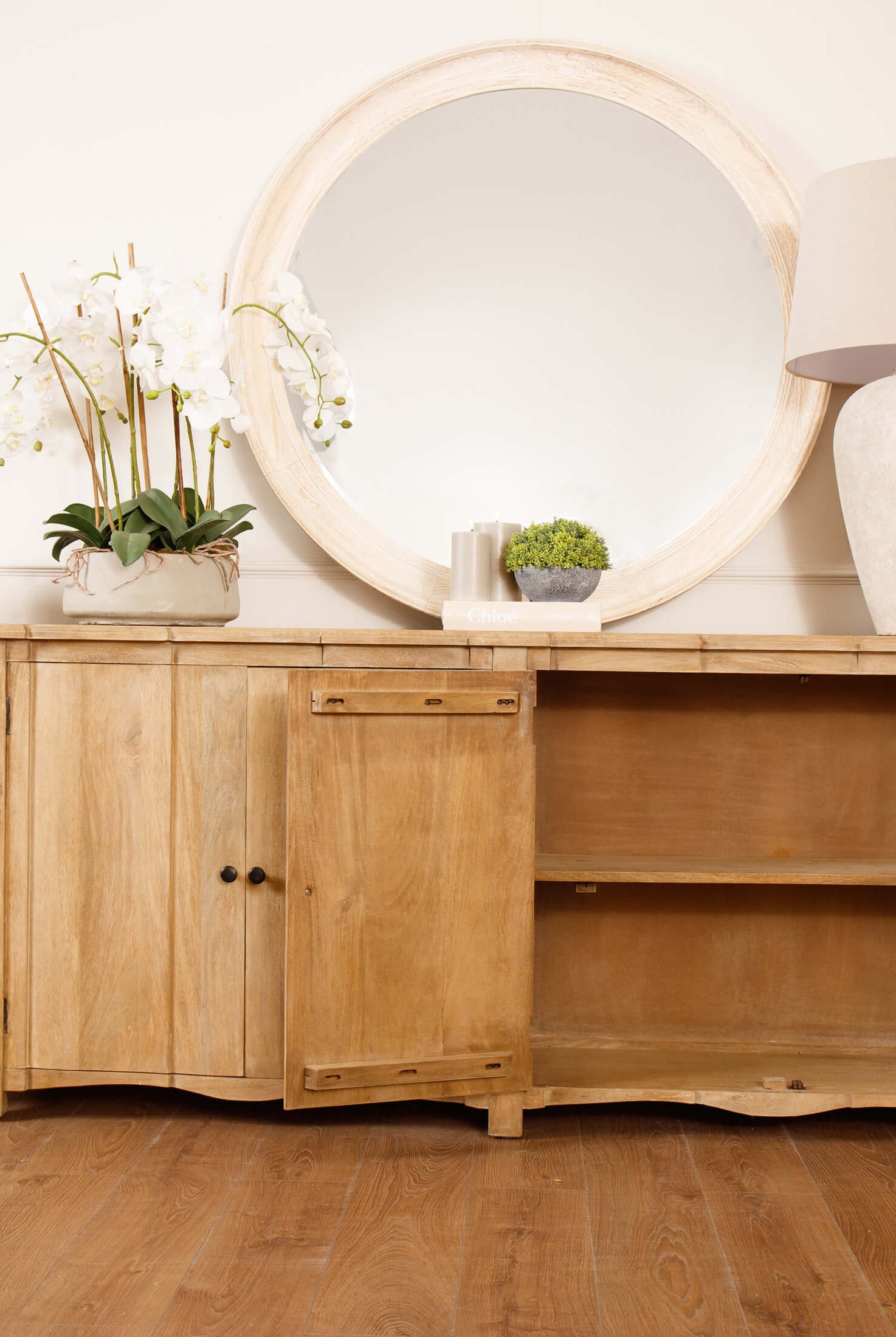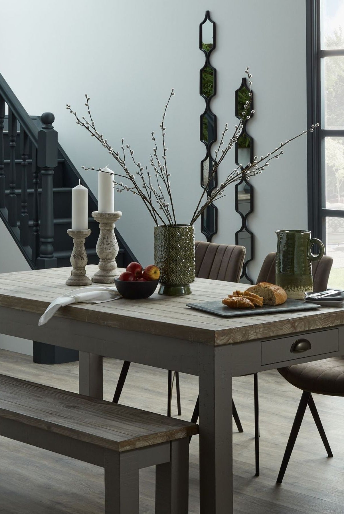 Welcome timeless charm into your dining space with our Sutton collection. Featuring a beautifully crafted round wooden table paired with upholstered dining chairs in a soft, neutral tone, this setting is all about understated elegance and inviting warmth. The look is grounded in earthy textures and elevated with sculptural candleholders, delicate glassware, and graceful floral accents. Soft, filtered light through sheer curtains creates a calm, serene atmosphere, perfect for intimate dinners or relaxed gatherings.
