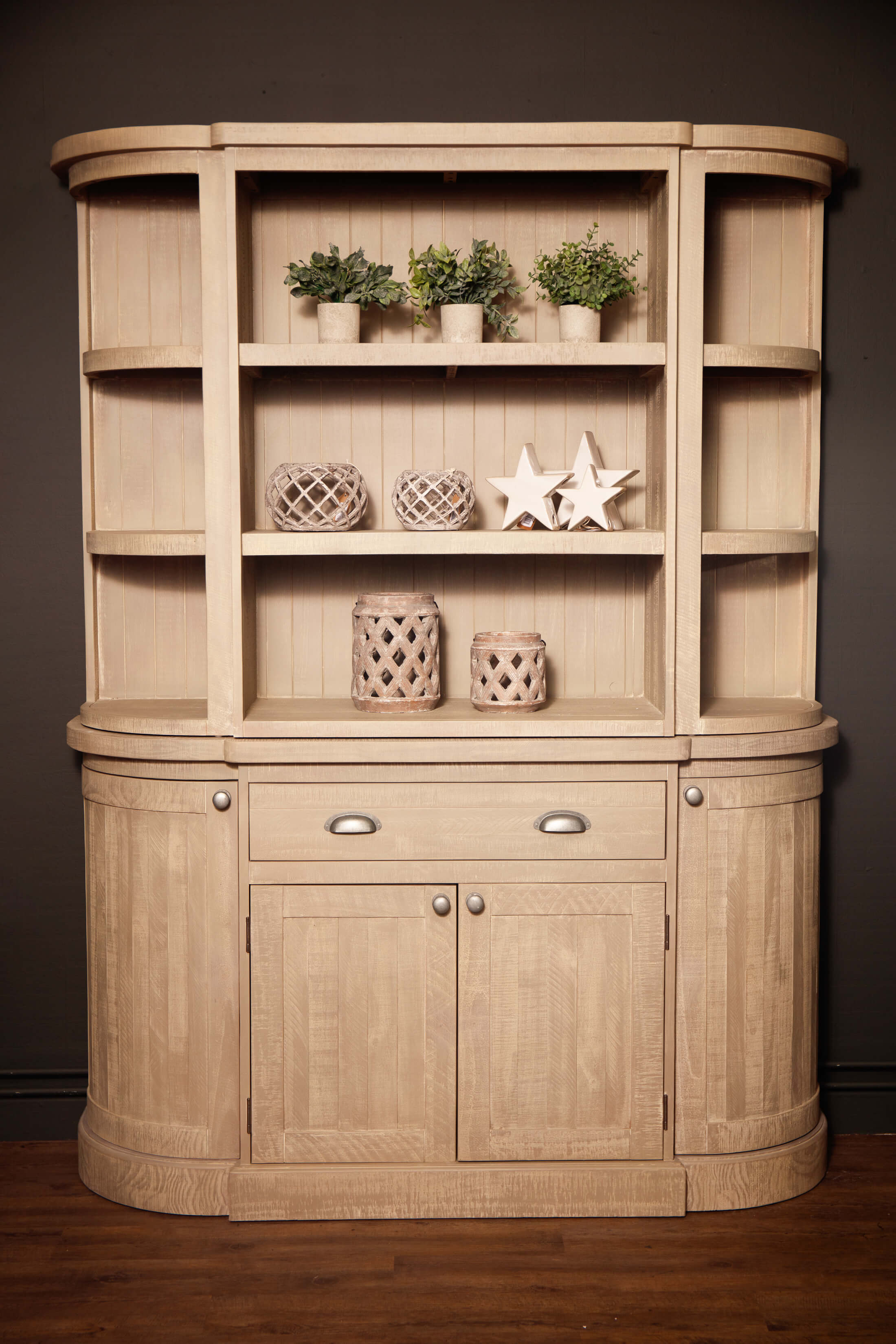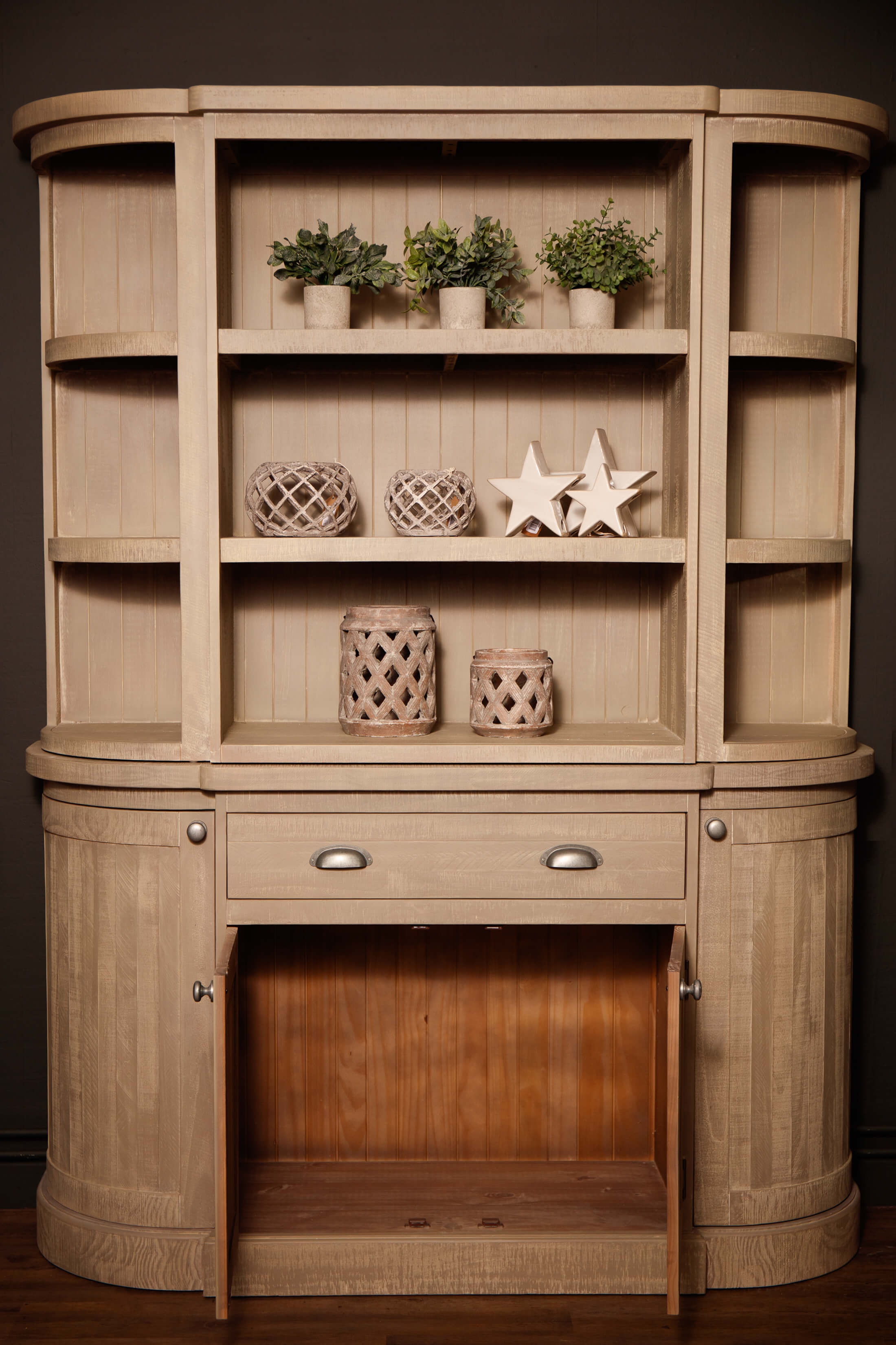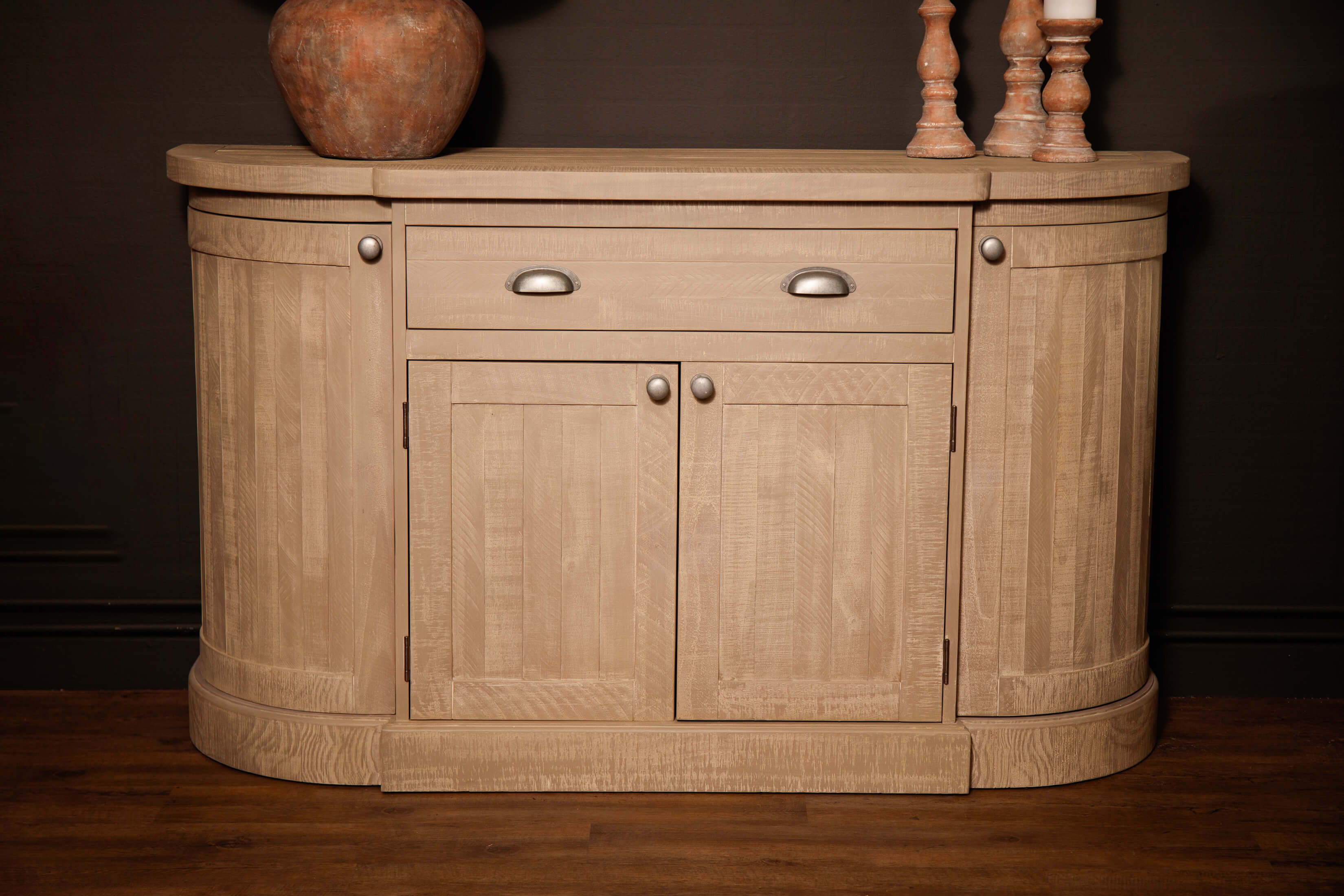 Introducing our Ash Grove Collection 4 Door Sideboard With Drawer, a versatile piece that shines both on its own and when paired with the Ash Grove Collection 3-Shelf Dresser Top. This sideboard features contemporary curved elements with smooth outlines and organic shapes, adding a sense of softness and modern flair while maintaining timeless appeal. Each piece is finished with a treated wood stain, giving it a weathered, familiar look that brings warmth and character to any space.