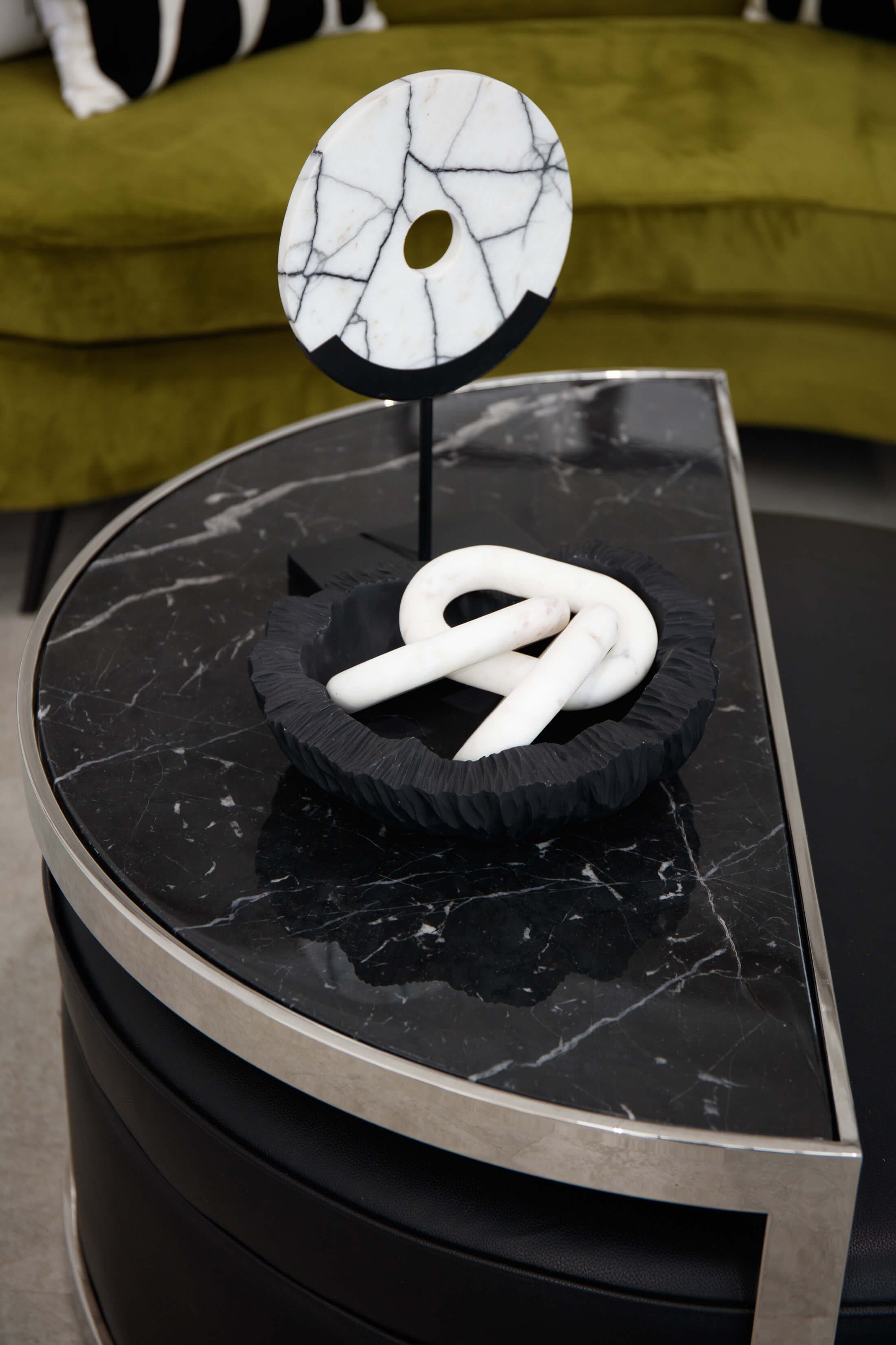 Introducing our Jethro Marble Chain, meticulously crafted from sleek white marble into three distinct links. The marble?s soft grey and brown veining beautifully contrasts with the robust chain design. This exquisite piece can stand alone or be elegantly displayed among other contemporary decorative items, adding a touch of luxury to any space.
