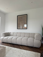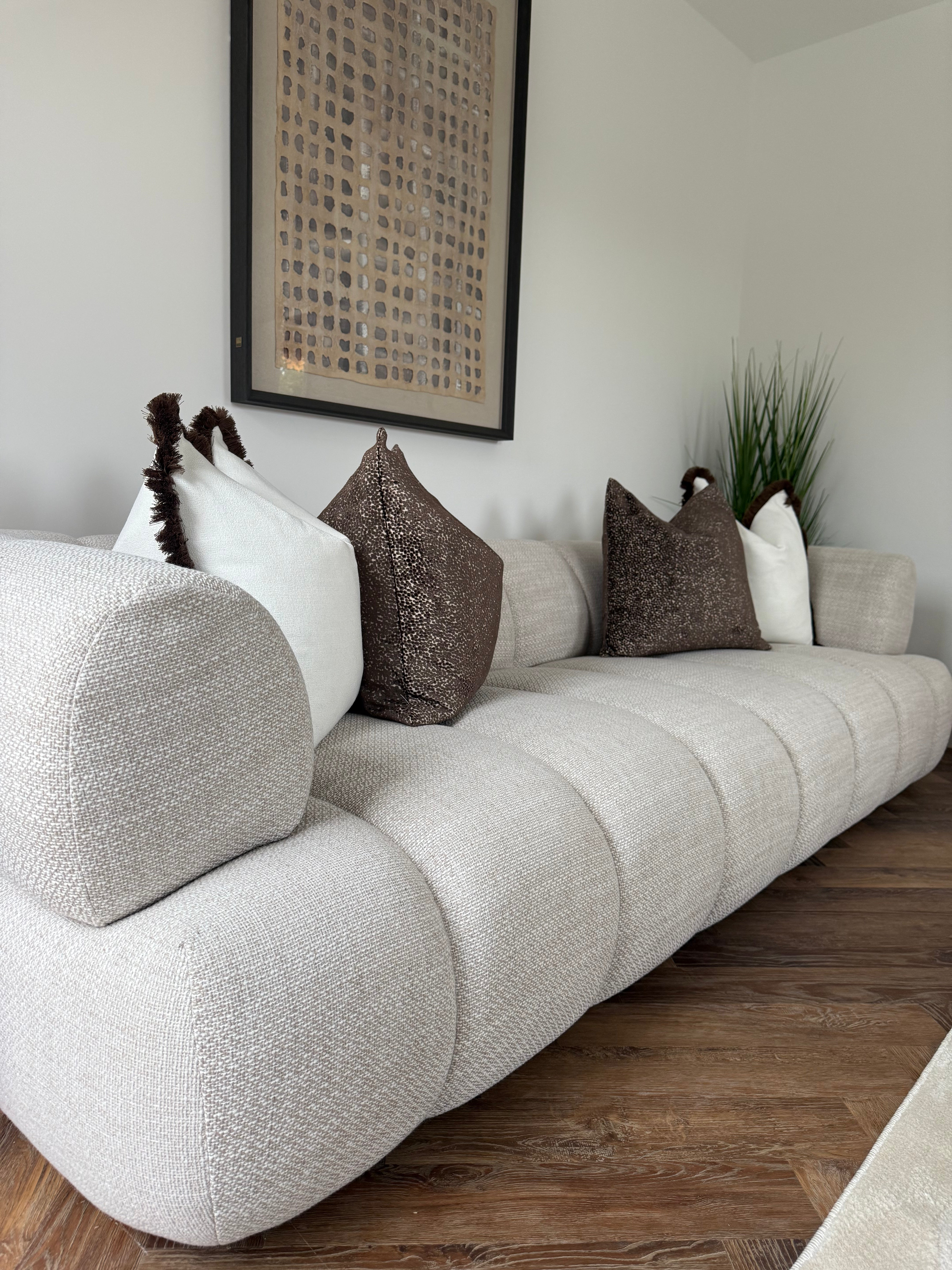 Introducing our Koro Three-Seater Sofa — upholstered in soft cream linen that brings warmth and depth to any space. Its gently curved back embraces the rounded seat, delivering exceptional comfort with a sophisticated silhouette. The distinctive quilted detailing adds texture and visual interest, making the Koro sofa a refined centrepiece for both contemporary and classic interiors.