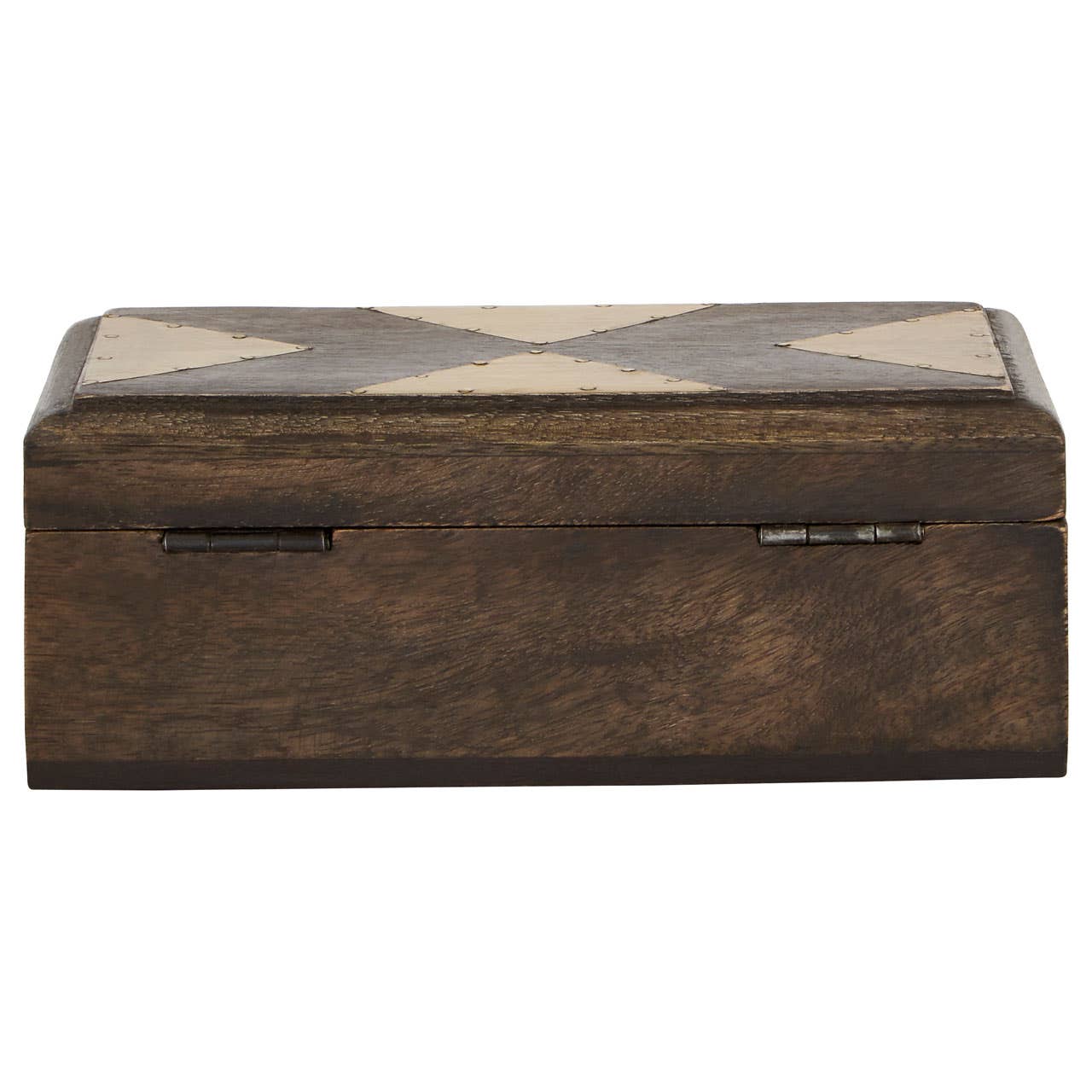 Introducing the Newlands Small Trinket Box, a masterpiece crafted from sustainable mango wood. Its interlocked grain creates exquisite tonal variations, making each piece truly unique. The lid is adorned with meticulously hammered metal triangles, forming a sophisticated harlequin pattern. A round, gold-colored metal handle complements the design, adding a touch of elegance.